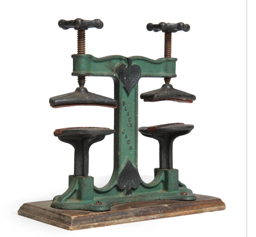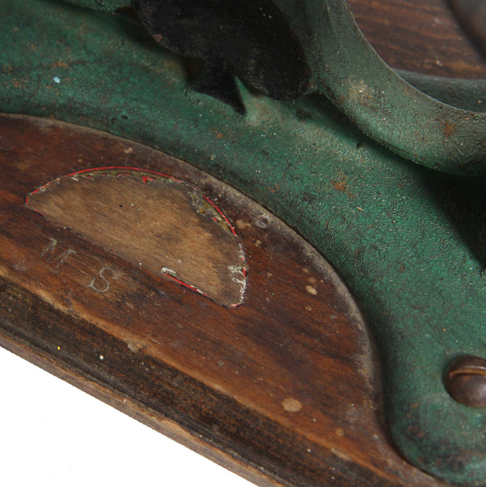 A small scaled forged iron double clamp with molded spade form decorations. Mounted on a stepped oak base retaining its original green polychrome.