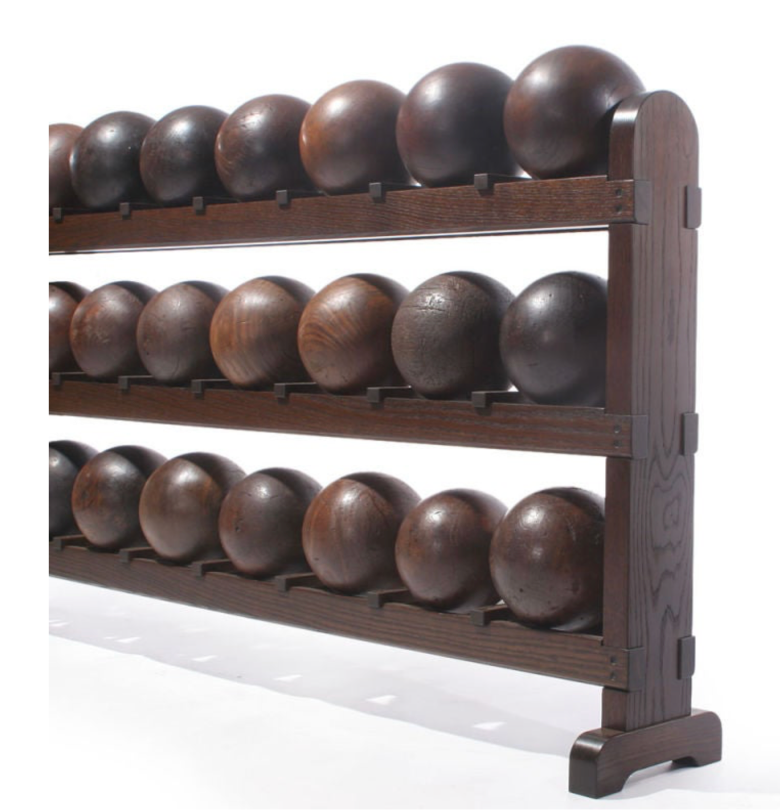 A collection of twenty-seven (27) regulation sized antique lignum vitae, lathe turned bowling balls on a solid oak bowling ball rack.