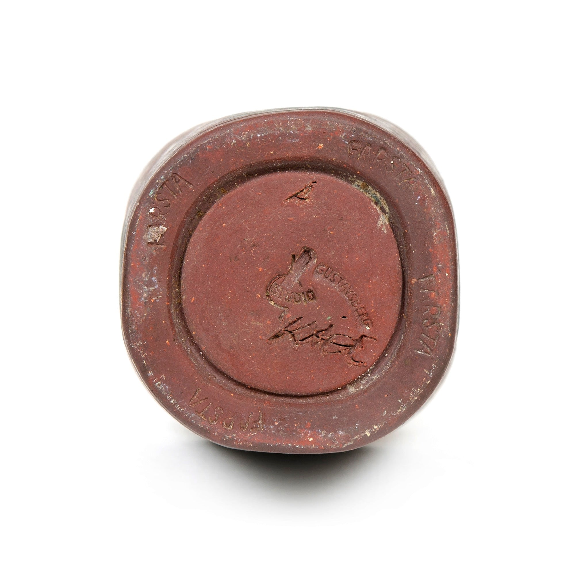 A tall ‘Farsta’ high fired stoneware vase hand crafted by Wilhelm Kage from the limited production G Studio unit of Gustavsberg Pottery of which Kage was its art director. Kage produced his limited art ware line from 1930 to 1960 bearing the name Farsta, a name derived from Farsta Bay south of Stockholm from where the clay used for the stoneware was sourced. Like all Farsta, this piece was hand worked from its inception through the stages of modeling, turning, cutting, incising, and finally glazing which was a unique process unto itself. The piece bears the impressed G Studio logo and word Gustavsberg along with KAGE incised below it as well as FARSTA impressed four times around the edge of the vase’s foot. Additionally, a ‘V’ is incised near the logo indicating by its code that the piece was executed in 1952. It has a repaired edge on the lower half.