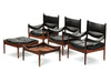 A "Modus" living room suite consisting of: Three lounge chairs with rosewood frame and original black leather upholstery (removable seat cushion has single button tuft and sling back and arms). The same lower frame shape comprises the ottoman/stool (with matching removable seat cushion) and end table with sunken reversible aluminum shelf. Upholstery is recommended for the set, sold as is.