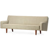A tailored and fully upholstered sofa floating on well-scaled turned oak dowel legs in original wool upholstery.