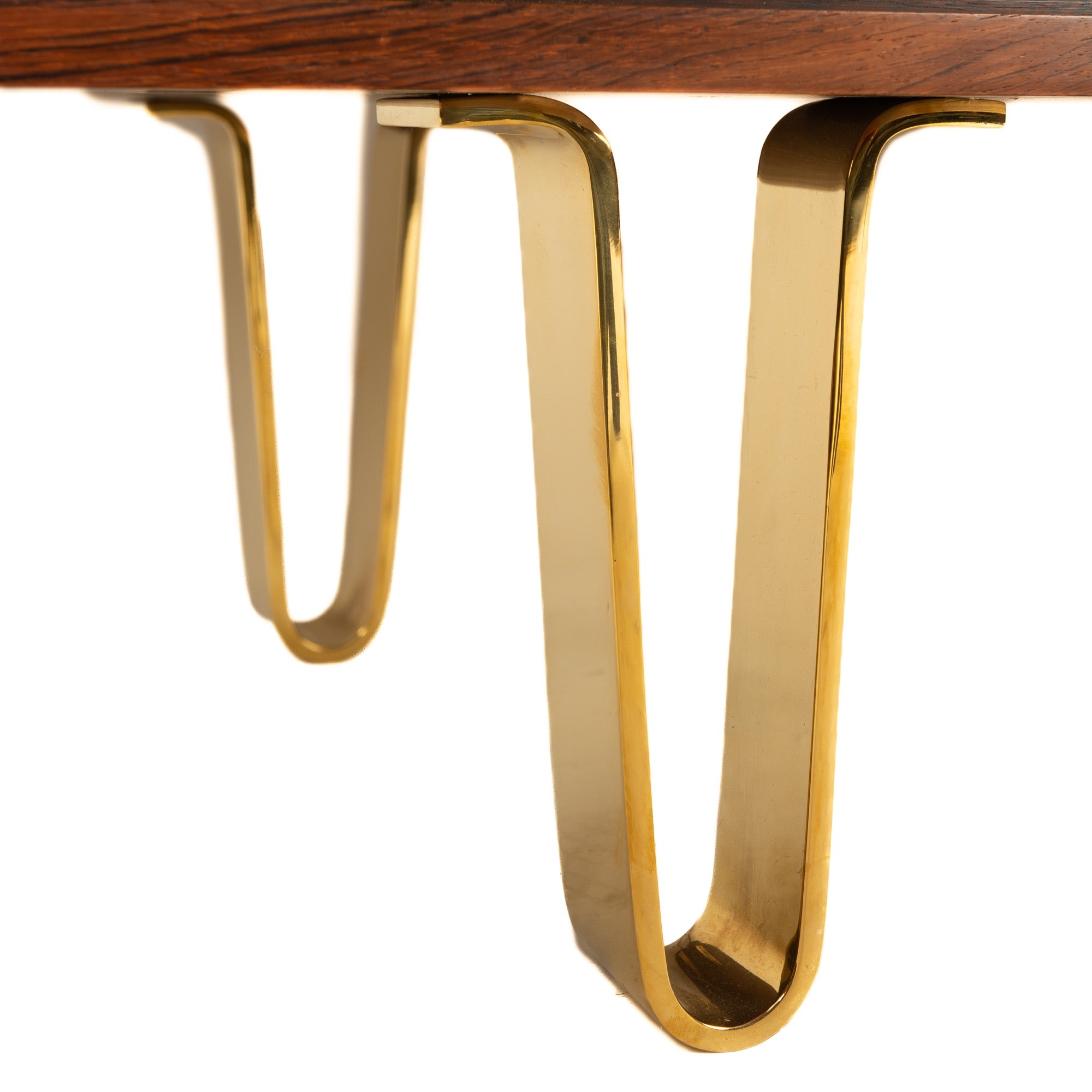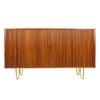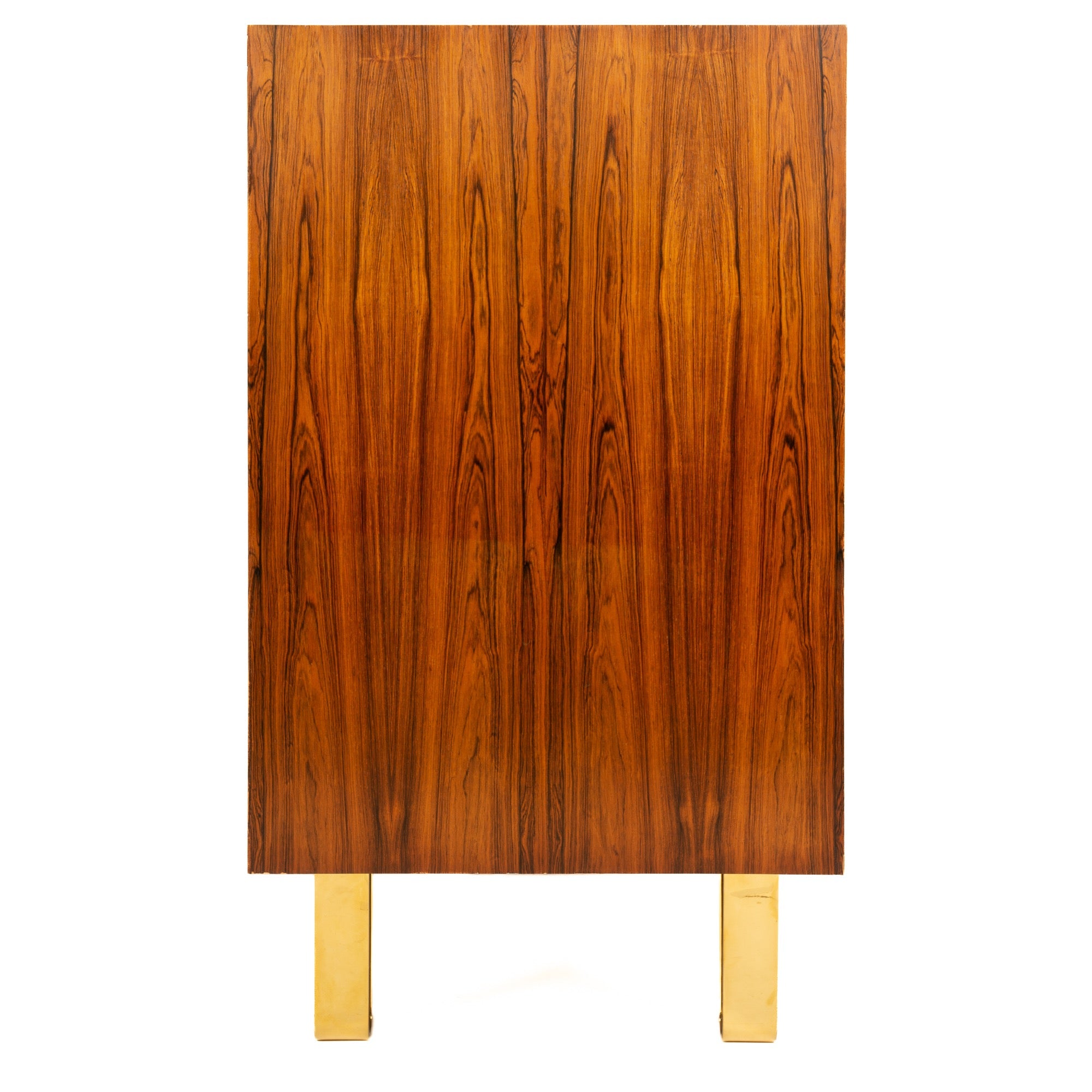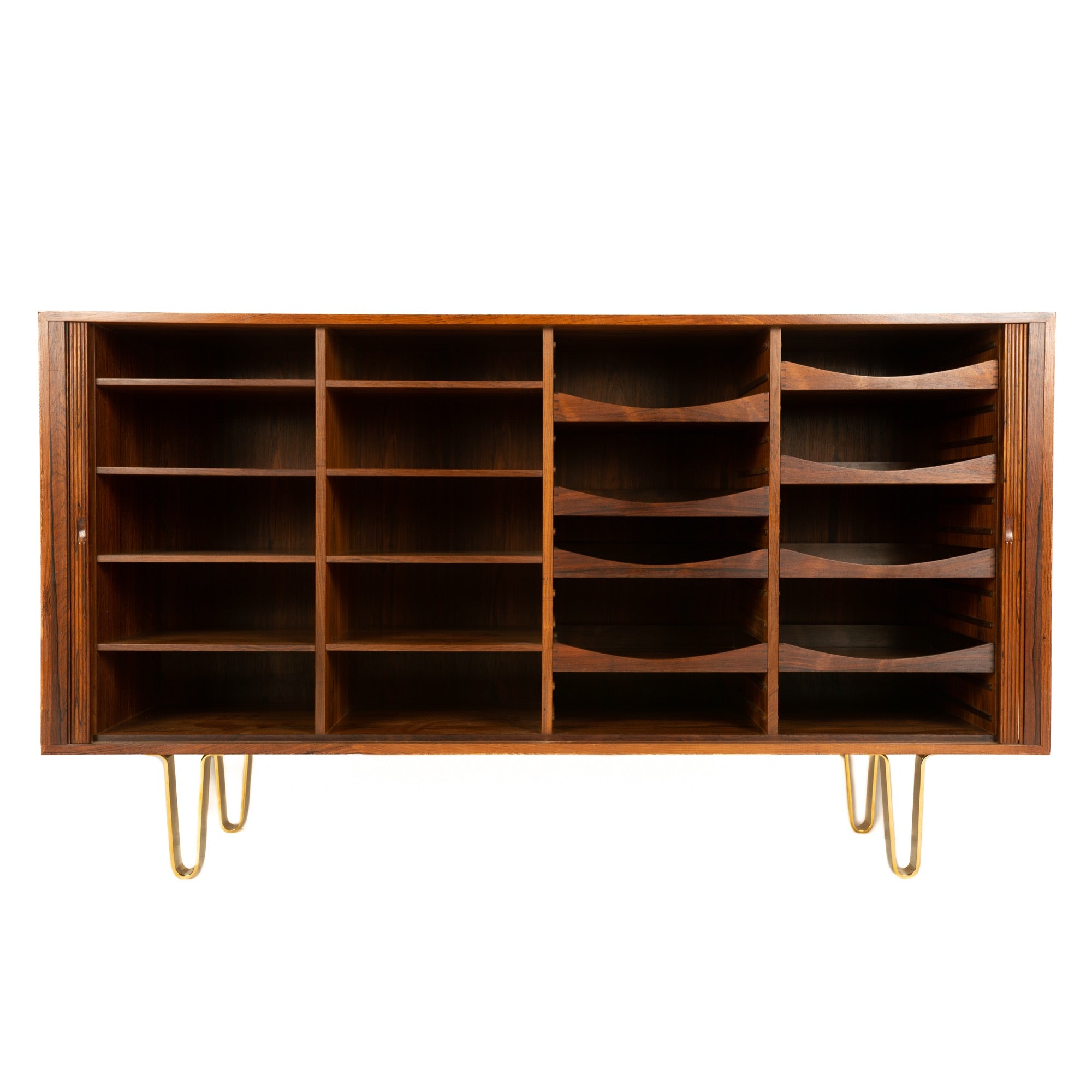 A rosewood storage cabinet with sliding tambour doors concealing ten open compartments on the left and eight adjustable drawers with dovetailed edges on the right side. Made in the cabinet shop of noted craftsman Willy Beck in Denmark, it exhibits well selected, active grain teak with the sides matched to the top in a continuous flow of grain. The case is well supported by four, custom made solid bronze hairpin legs crafted by WYETH.