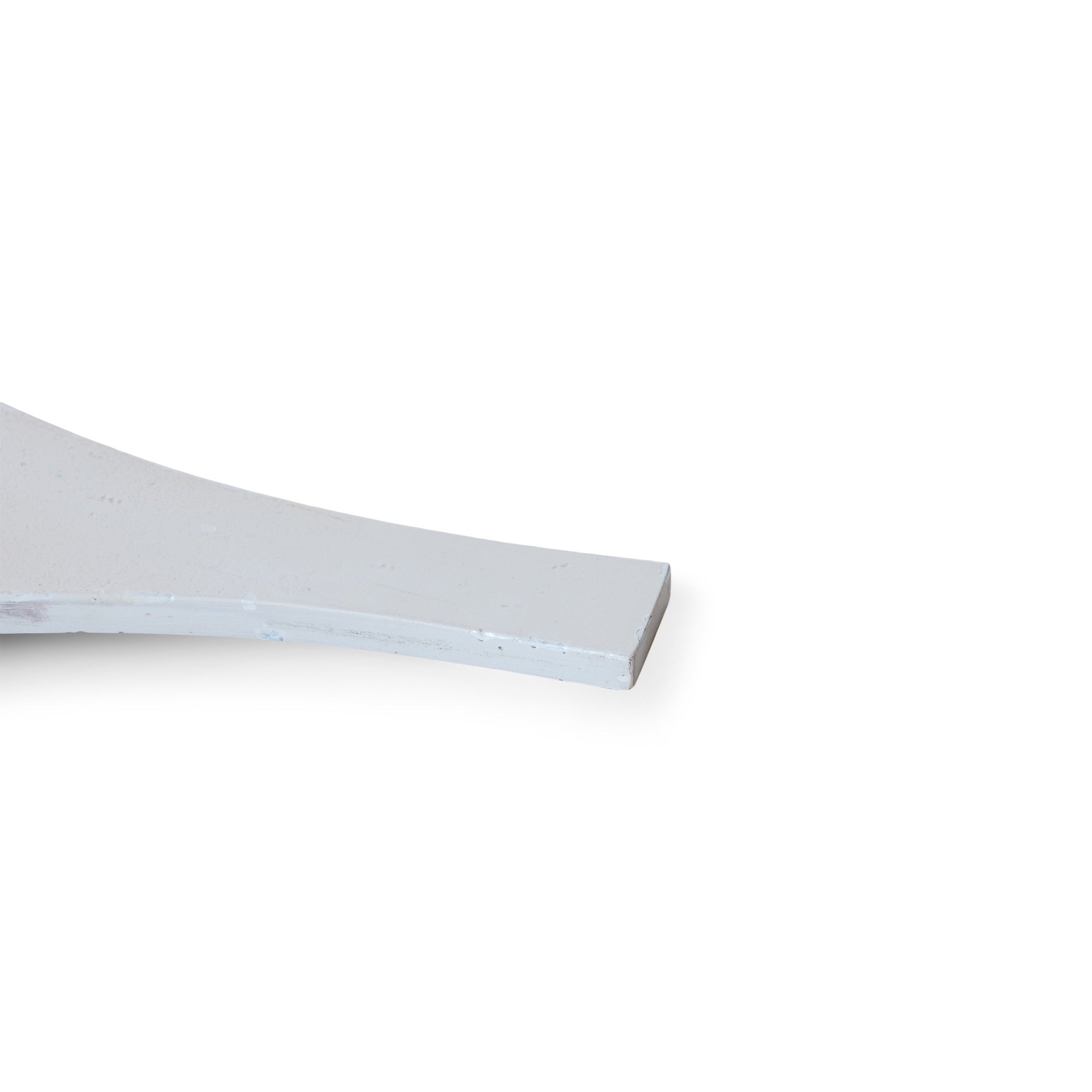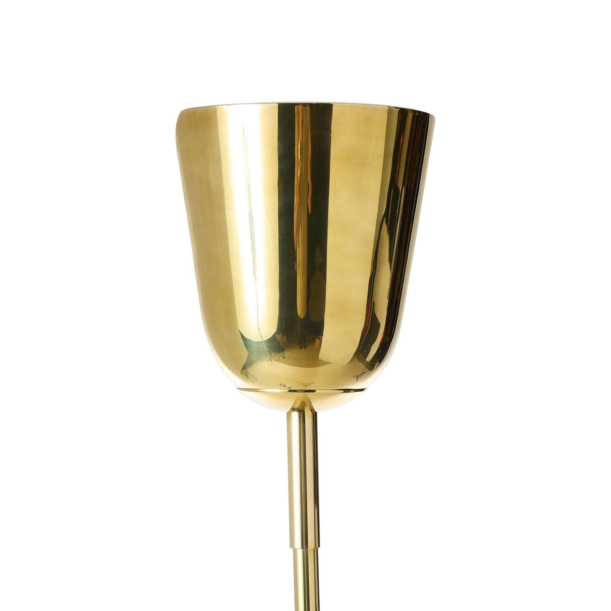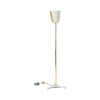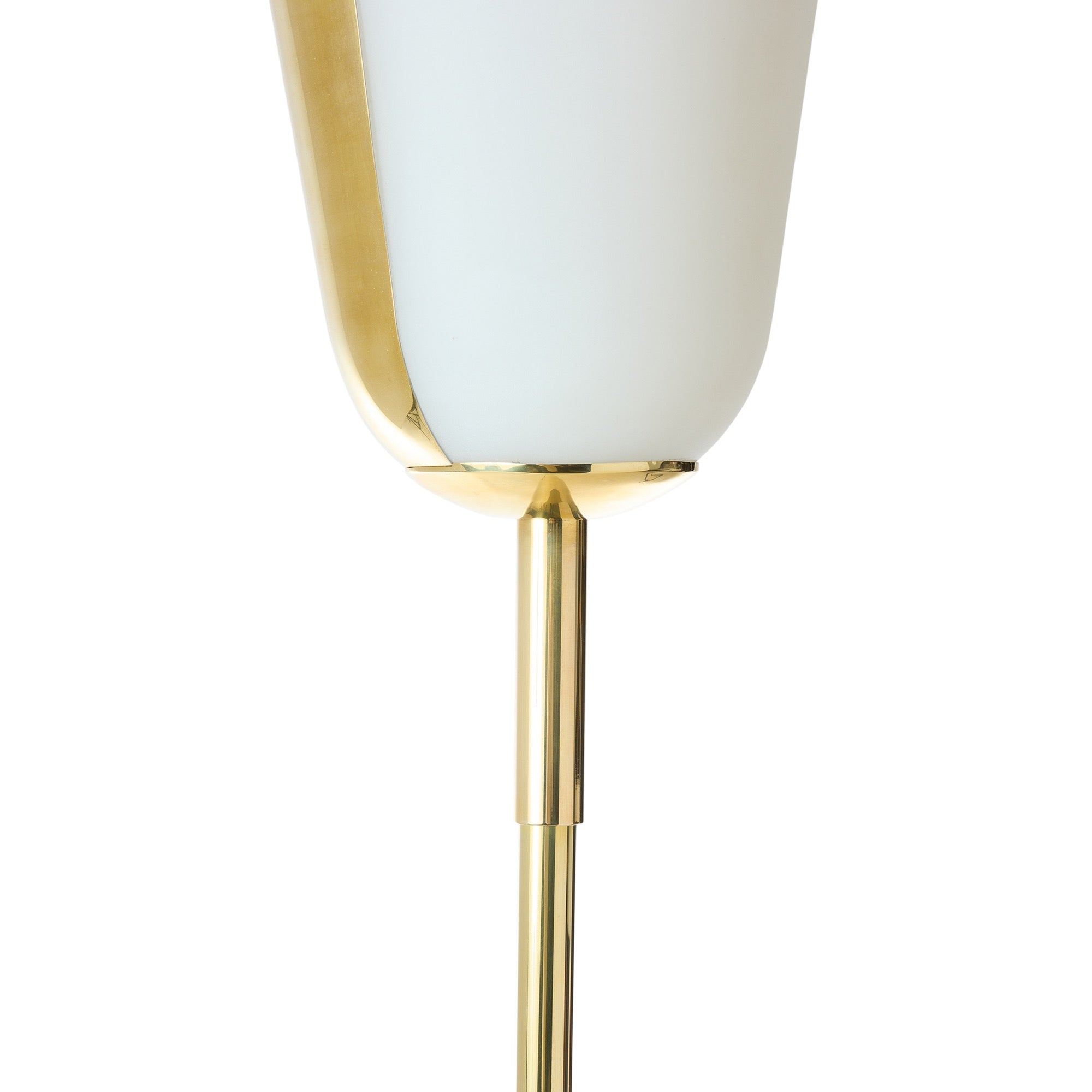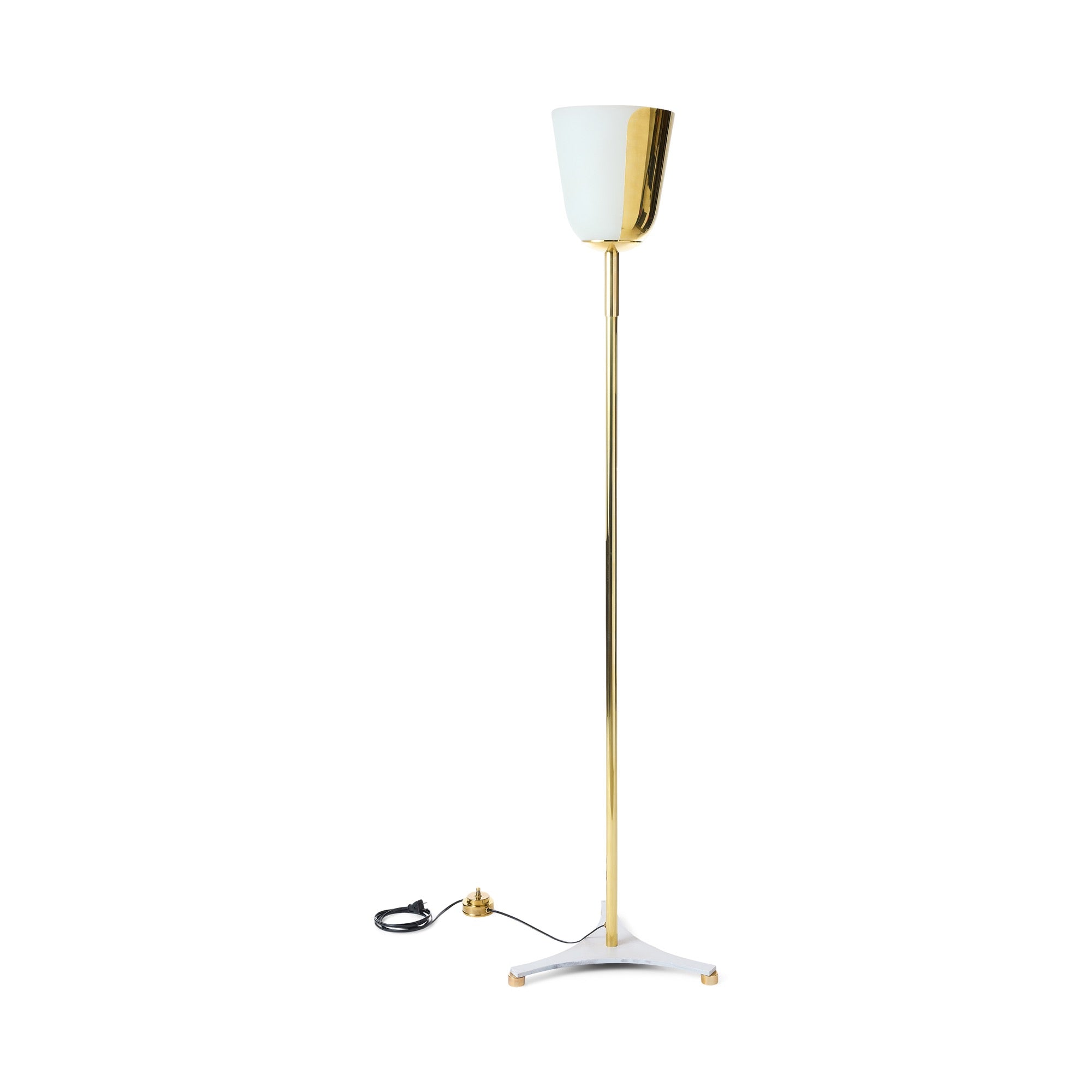Metal torchere of satin finished chrome consisting of a vase shaped shade with a thick, satin frosted glass insert open at the top with its sides half shielded by a metal cover and half able to emit light. The shade is attached to an unadorned column terminating at its bottom in to a triangular metal base with sweeping curves connecting each of its three ends. Lamping is accomplished with a single, Edison style socket.