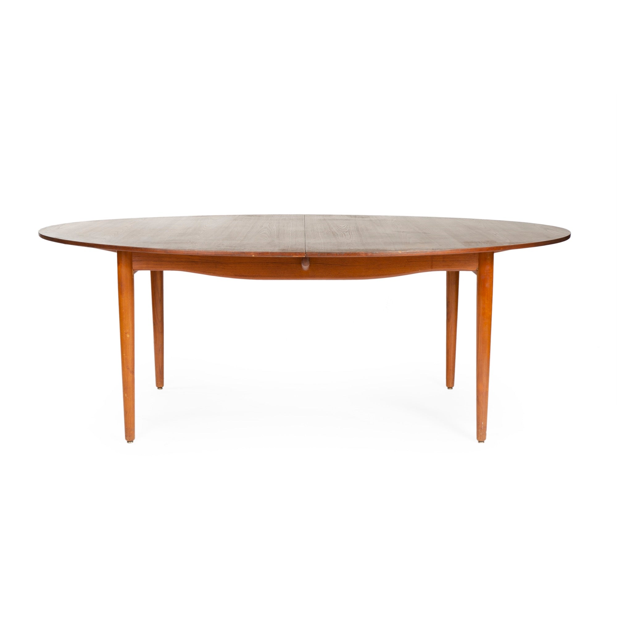 A rare and superb solid wood Judas dining table by Finn Juhl. Manufactured by Niels Vodder, the table features an expandable oval top with two leaves on a sculptural and architectural base with turned dowel legs. Made in Denmark, circa 1950s.