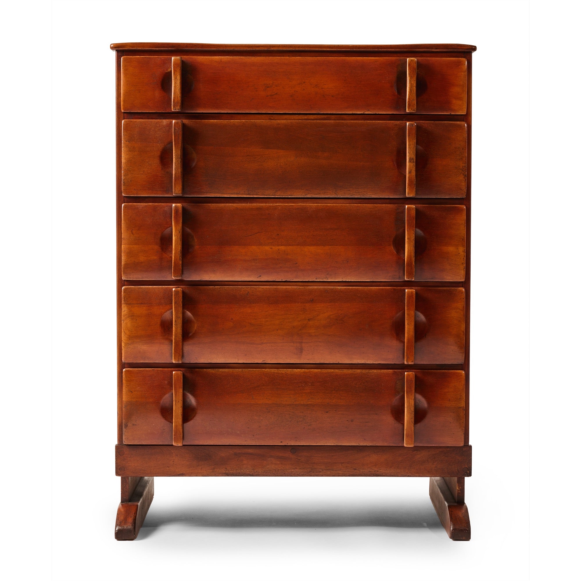 A beautifully crafted five drawer dresser in solid birch, model 6055. Three compartments in second drawer proved service spaces equivalent to five separate drawers. Drawer handle design Patented.