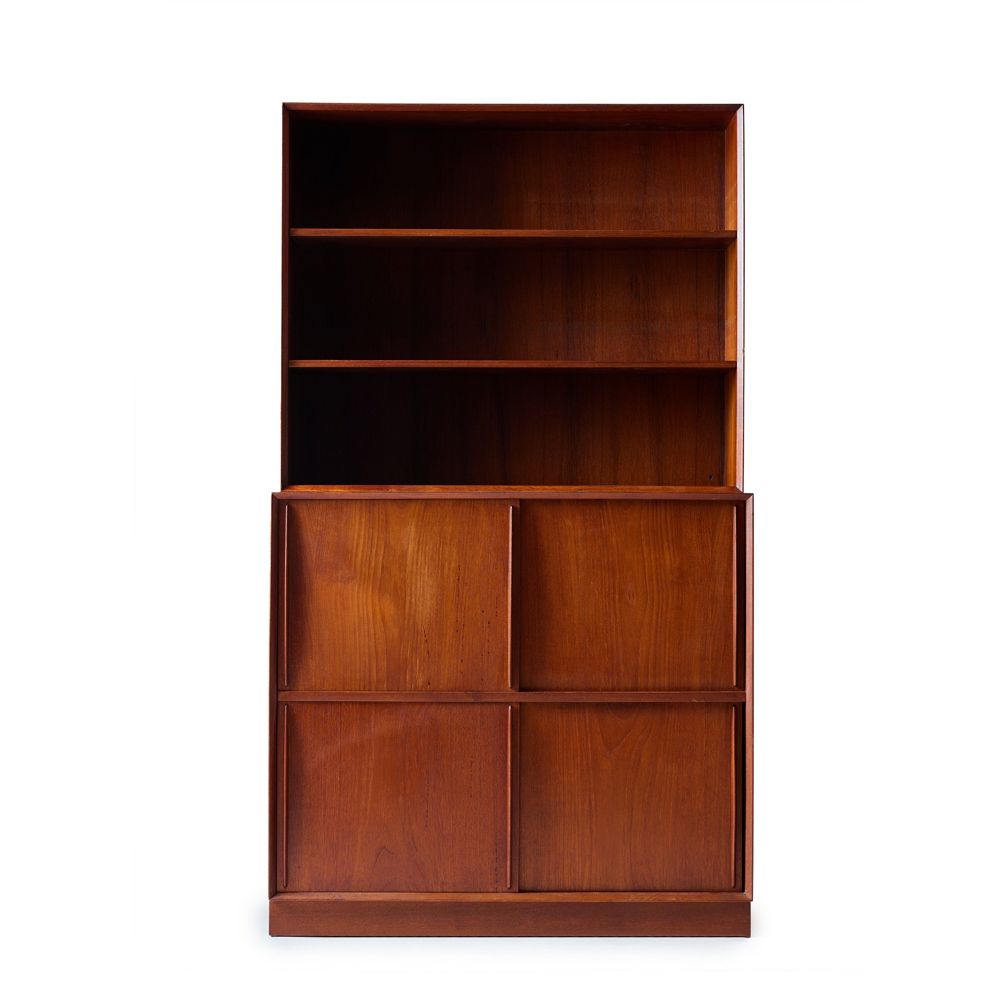 A modular cabinet made of solid Burmese teak with sliding doors and one fixed shelf and two adjustable shelves. Can be placed on plinth base or turned legs.
