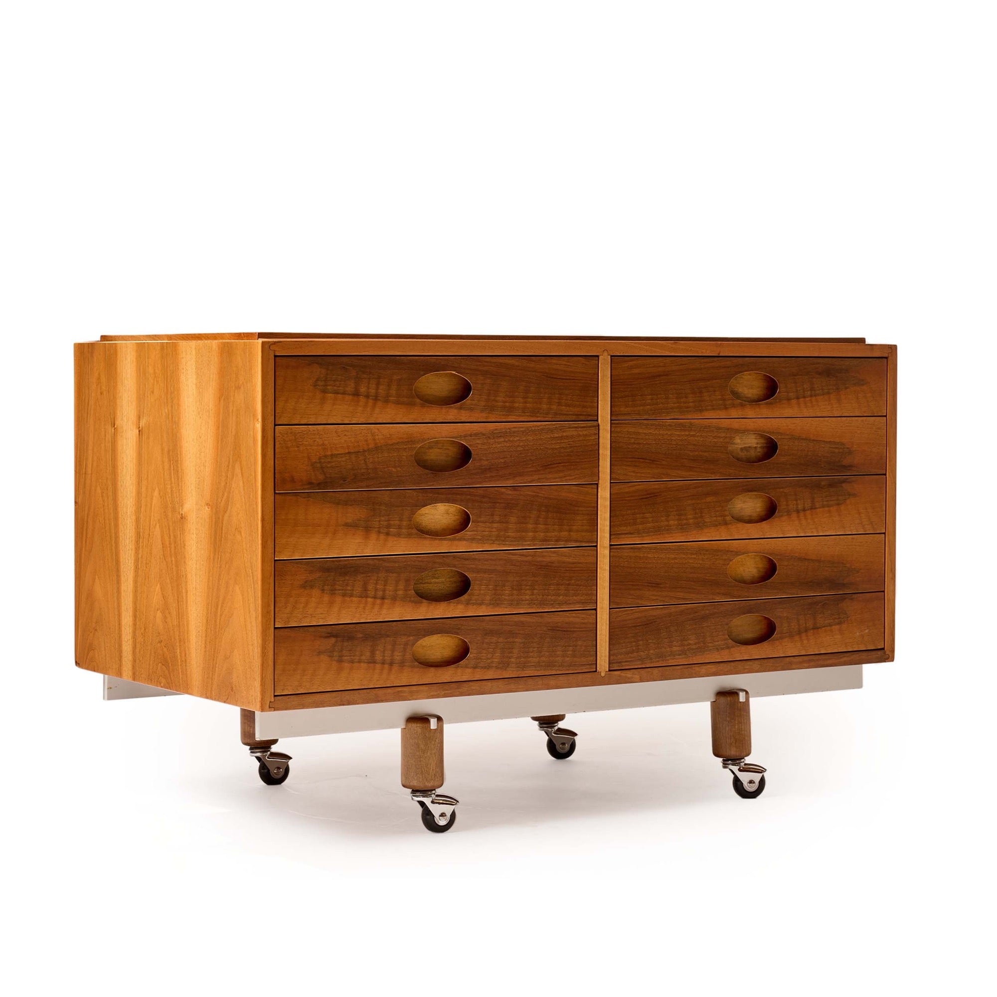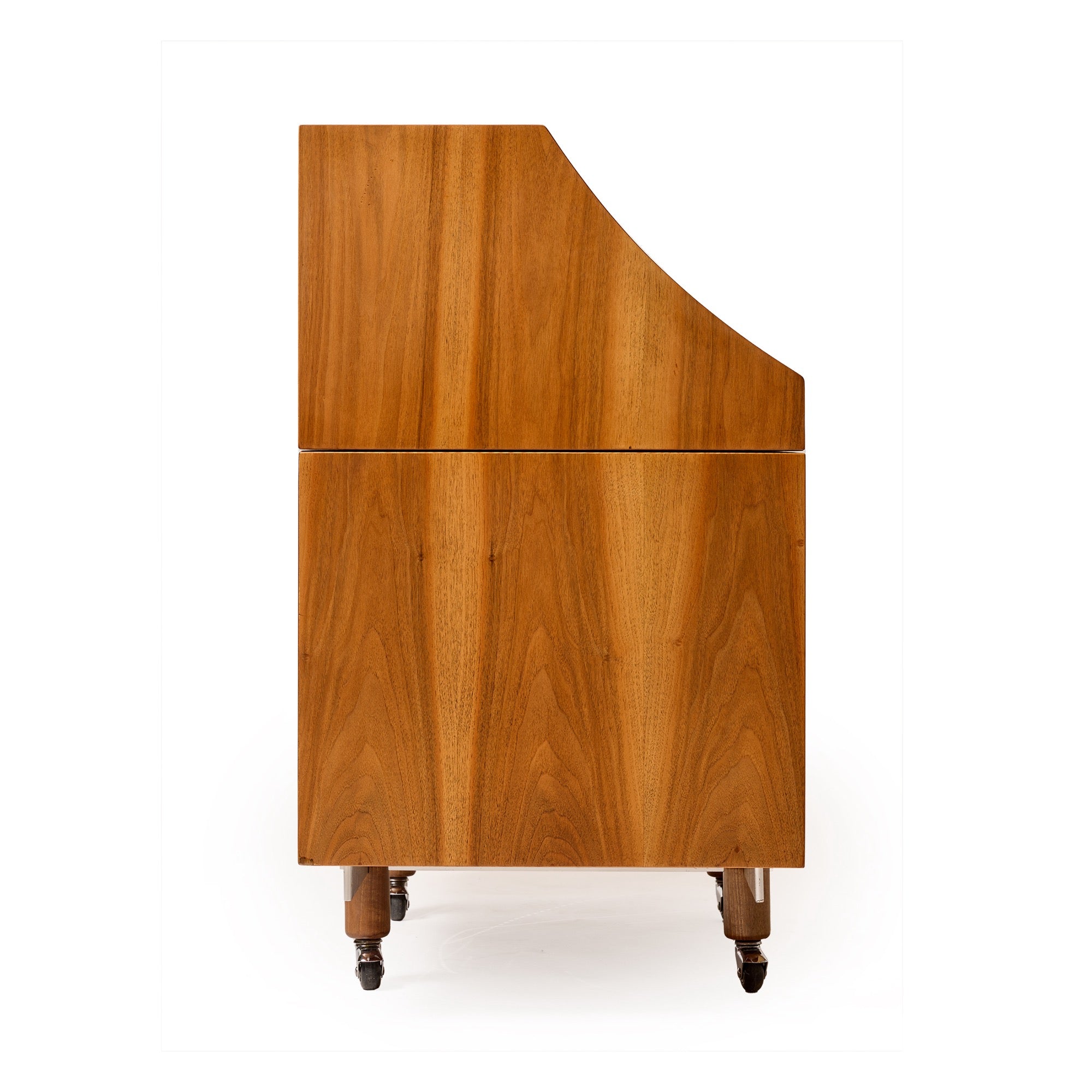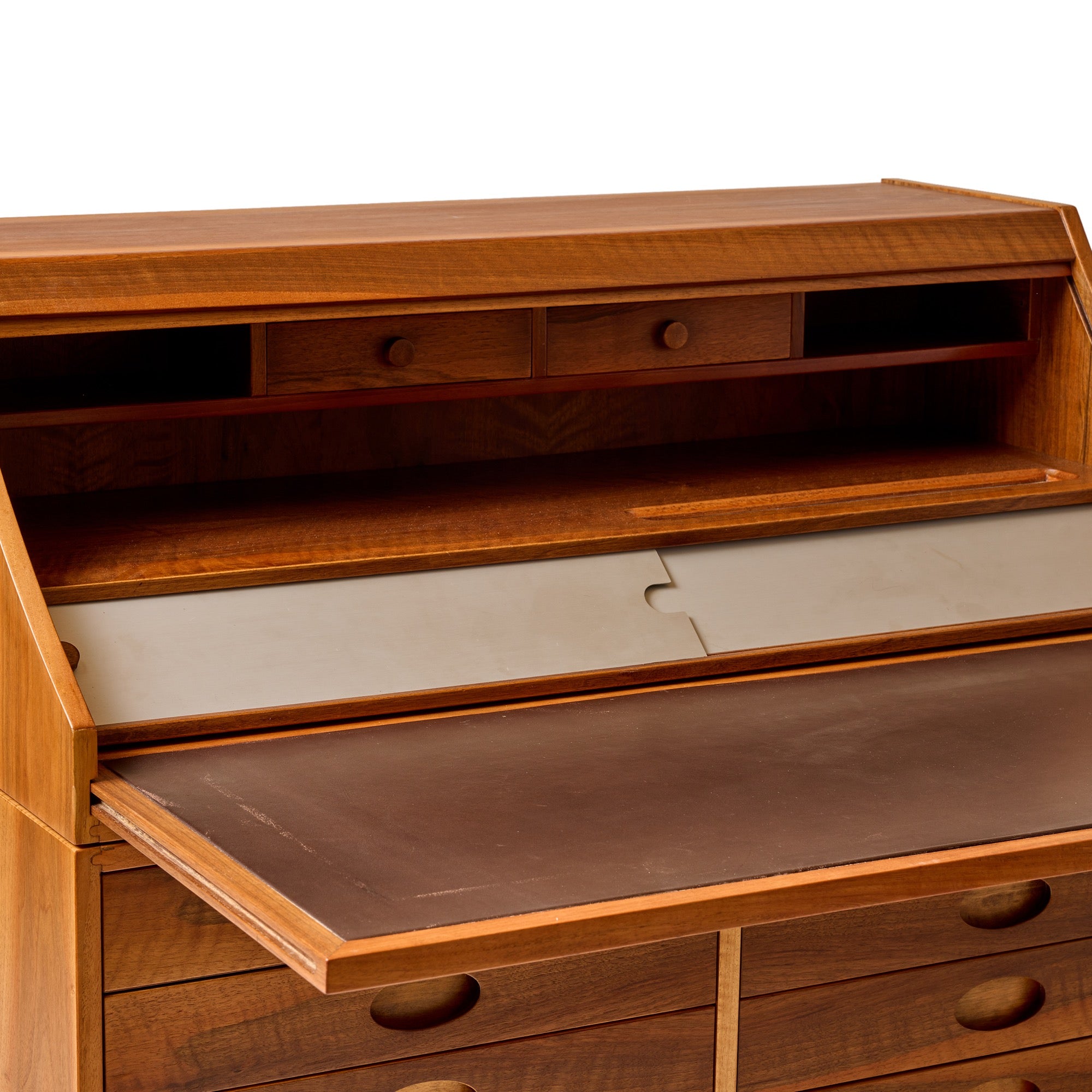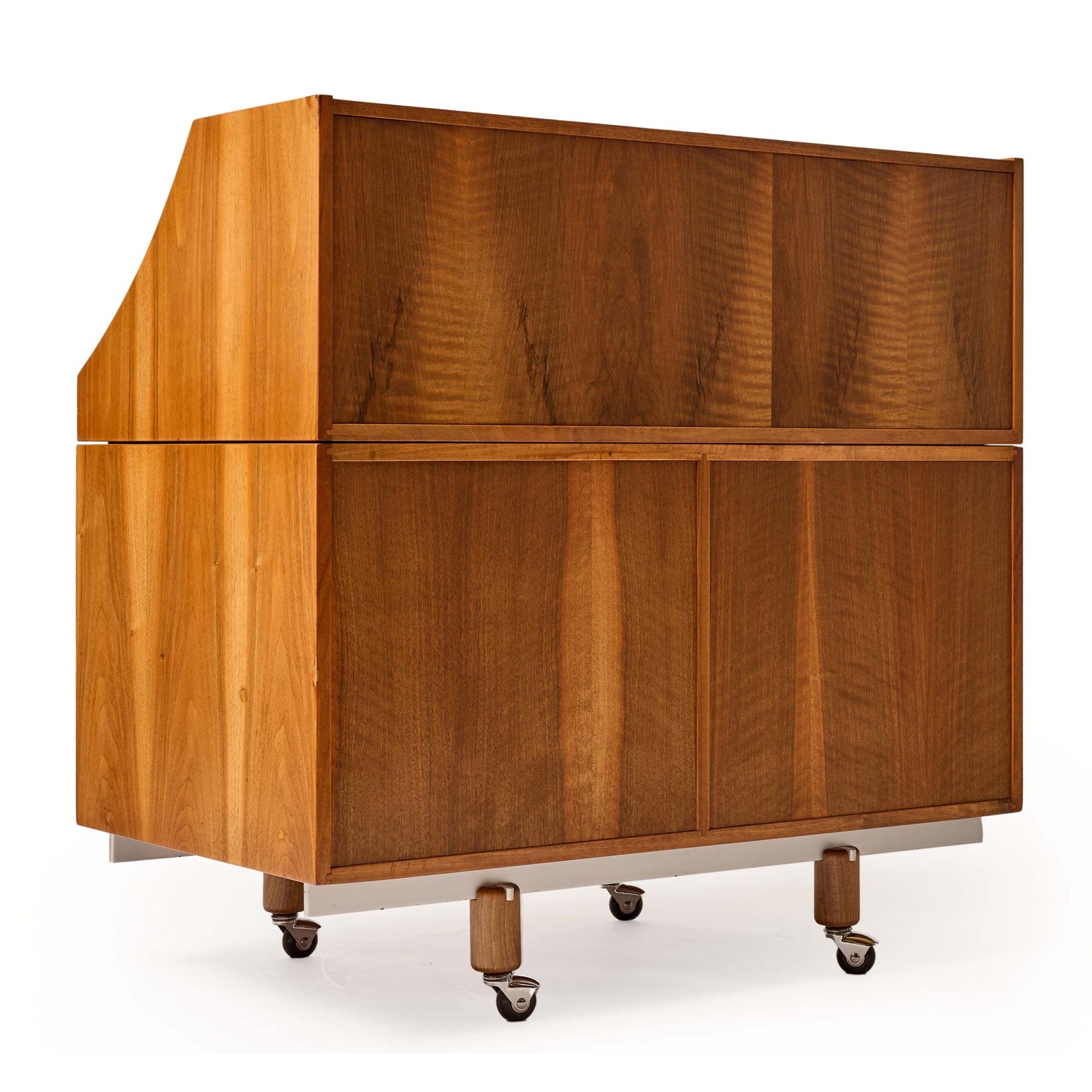 A rare roll top tambour desk/secretary in walnut with an extendable writing surface. As the tambour door opens, the writing surface which is connected to it, becomes exposed.the desktop can me used at any interval desired the base cabinet and top cabinet are independently constructed. the base cabinet has 5 side by side storage drawers, which can be used without the desktop as a stand alone set of drawers.the top is fitted with two drawers above and an open space below. that surface area has an aluminum pencil/pen tray. beneath it are 4 sliding trays which are concealed by two sliding aluminum panels.