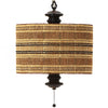 A hanging lacquered turned wood light fixture having an expressive natural fiber woven drum shade.