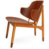 A sculptural lounge chair with a teak plywood seat and back on an expressive architectural exposed beech frame with teak tipped legs.