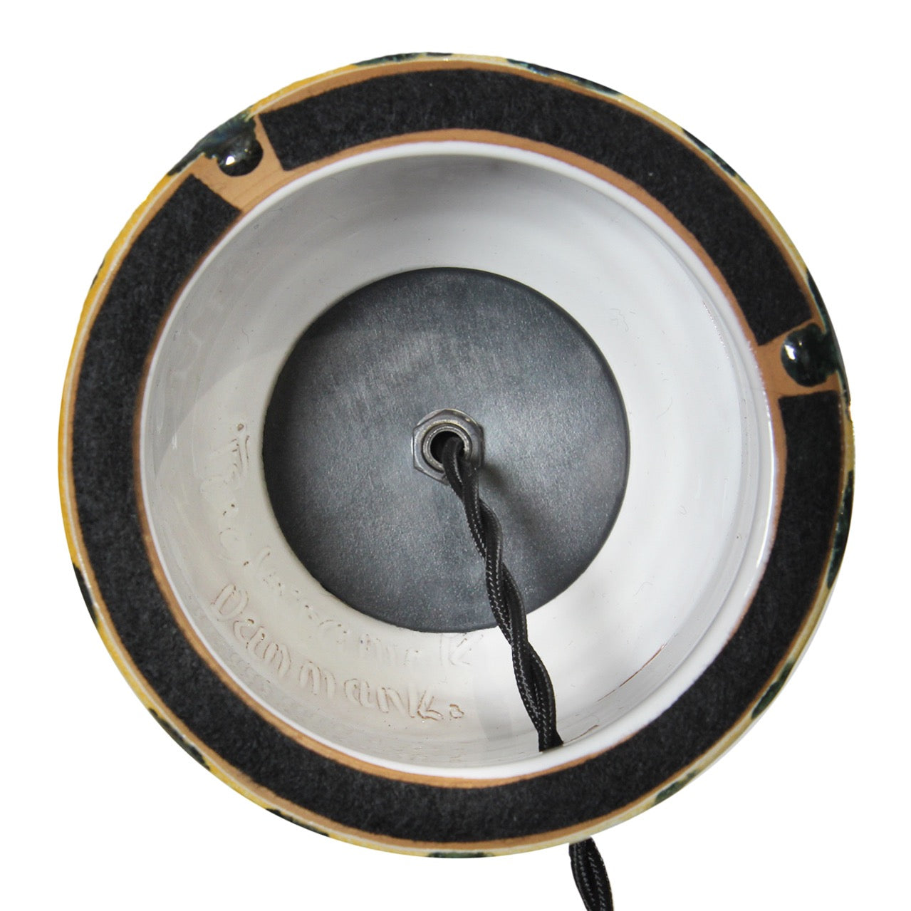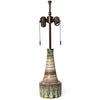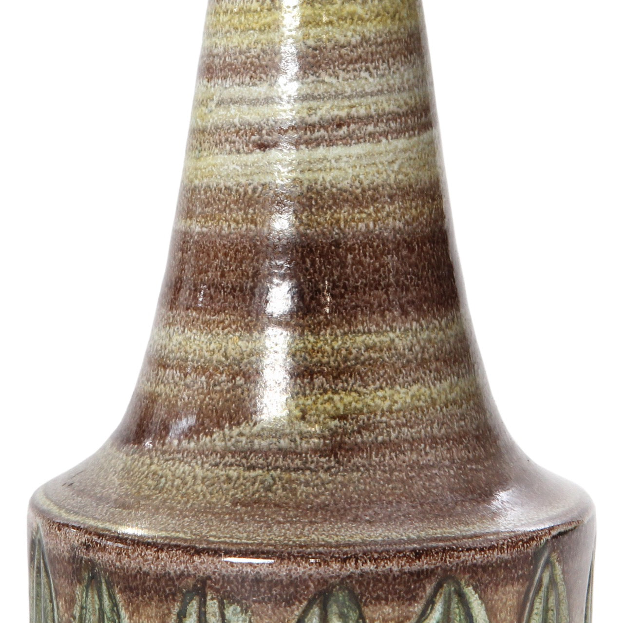 A ceramic table lamp in a tapered form with a glaze resembling sedimentary rock and leaf pattern on the base.