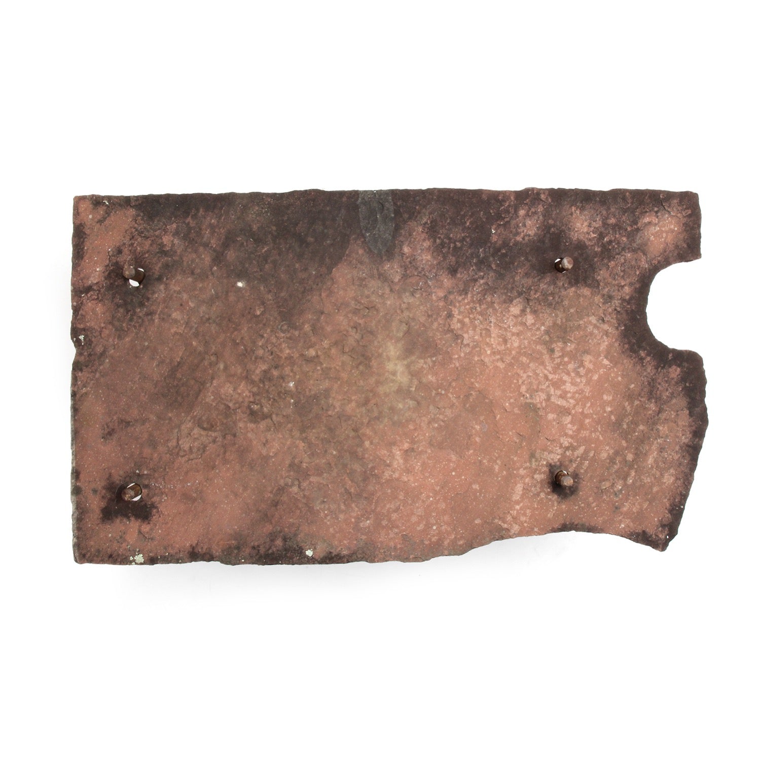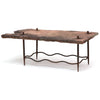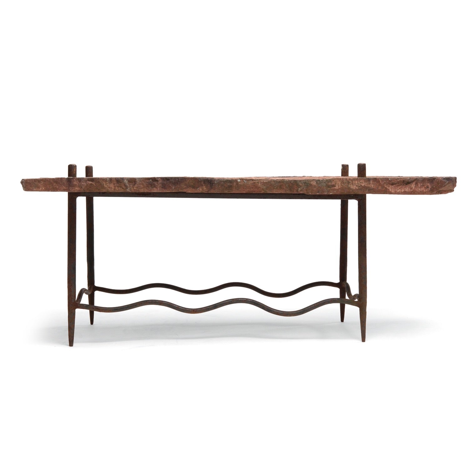 A low / coffee table having a rough hewn free-edged pierced stone top floating on a black hand-wrought iron base with undulating stretchers.
