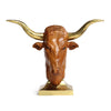 A carved, detailed, life sized wood sculpture of a bull's head with inset brass horns and mounted on a sloping lacquered brass base.
