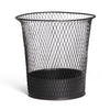 A small industrial waste basket crafted of stamped steel and braided and patinated steel wire, having a subtle flared top.