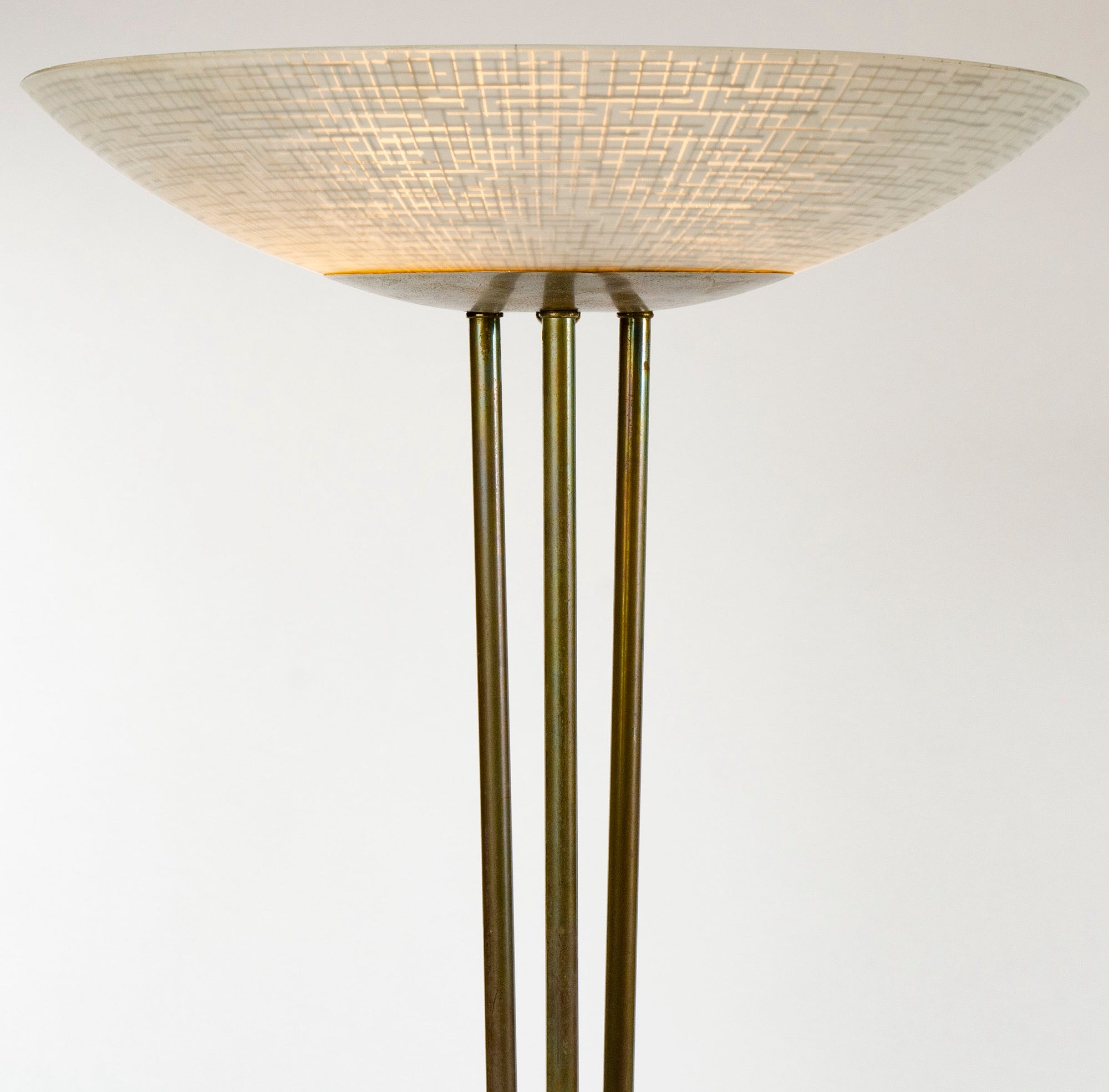 Classic uplight Torchere floor lamp with three vertical brass rods supporting a shallow brass bowl and wider glass shade. The base designed by Gerald Thurston with a textured, fire annealed enameled glass shade designed by Carl Moser from his Claremont collection. The shade was produced by the Claremont Kilns with fire annealed and smoothed edge for permanence. The glass shade conceals a perforated brass collar around its three Edison style sockets which aids in diffusing the light evenly across the shade eliminating bright spots.
