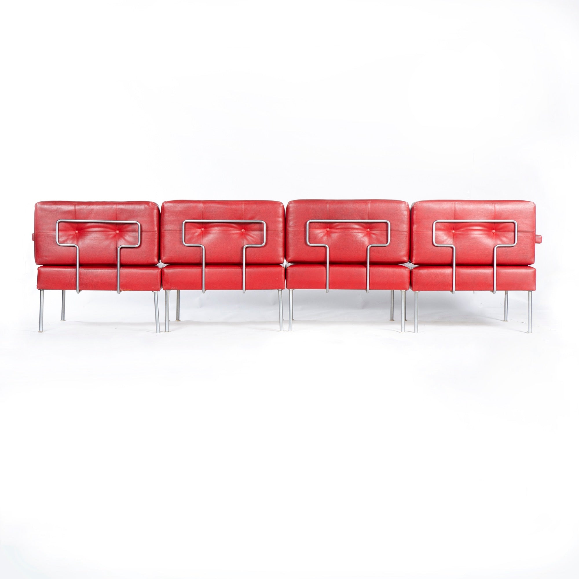 Cado model #115. Square upholstered units set on detachable, satin finish, tubular steel legs. Metal fittings for linking individual units together. Also known as 'Revolt' modular seating.