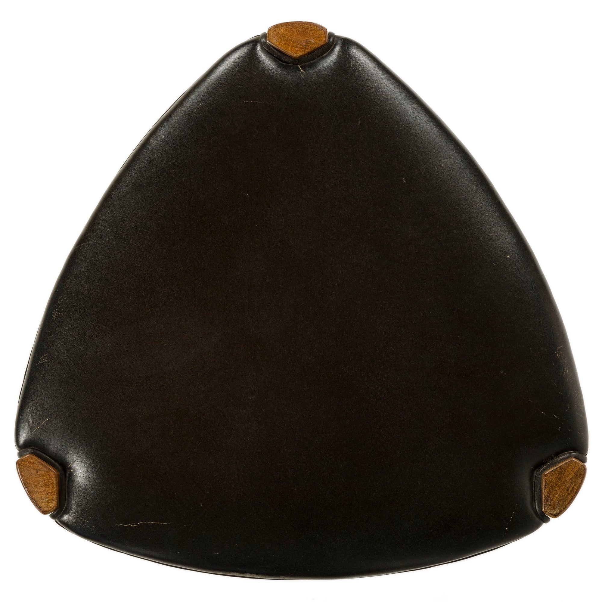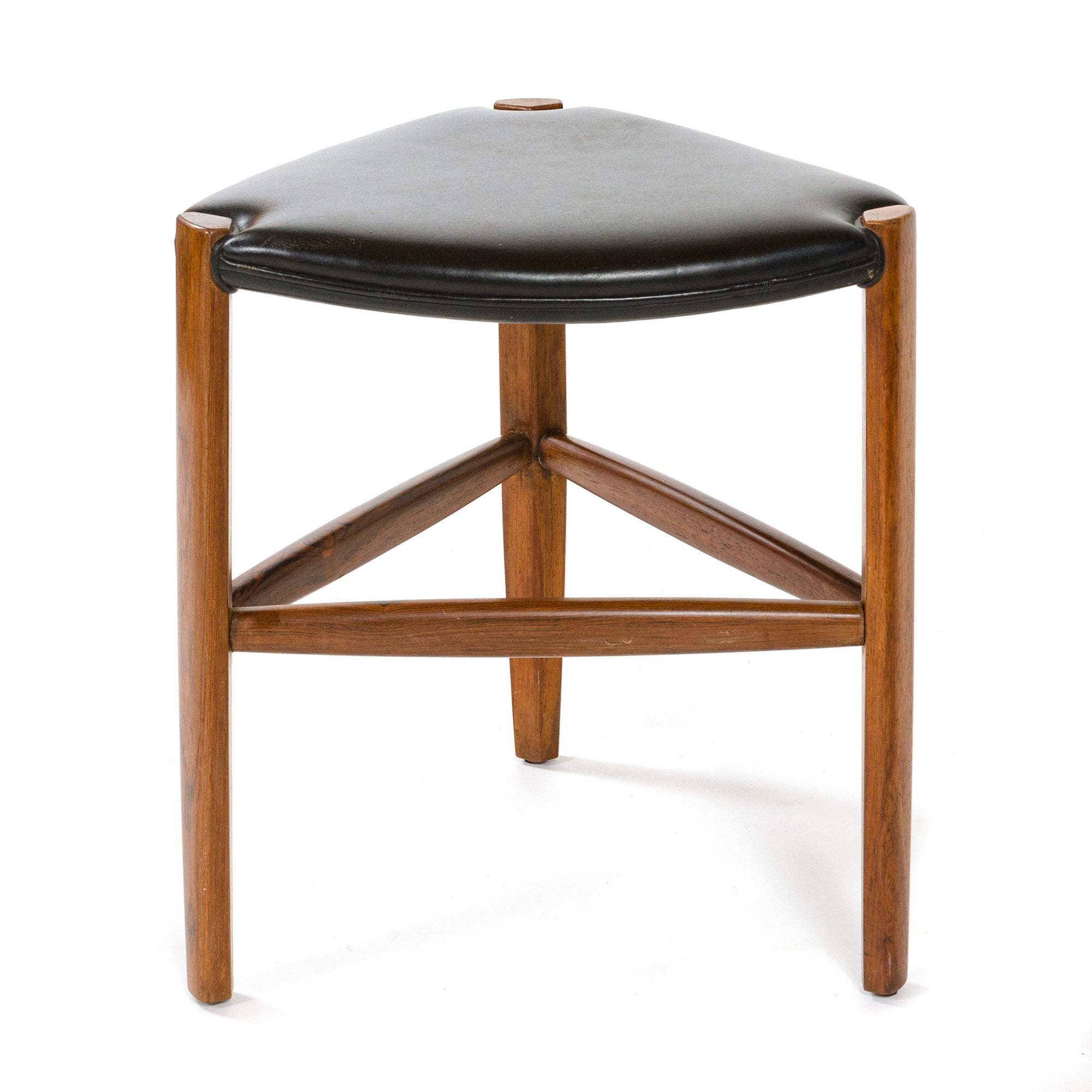 A Danish rosewood stool comprised of three solid rosewood legs of triangular shape with softened corners joined together by three solid rosewood turned stretchers. The seat is comprised of premium leather wrapped over three curved structural members. No discernible markings found. A convenient and useful size suitable to almost any placement.