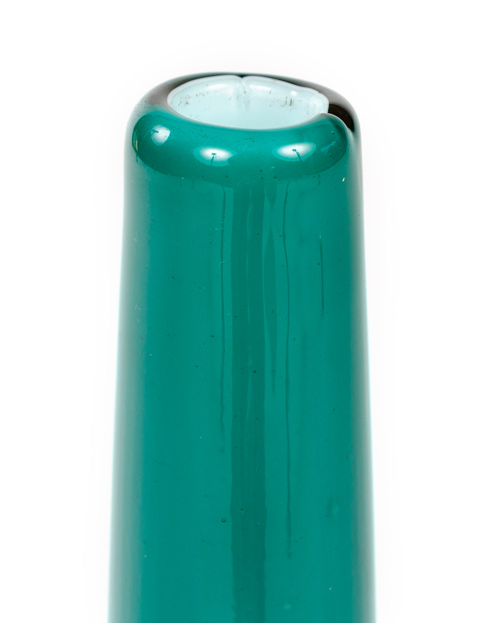Mouth blown cased glass vase with a light teal exterior, white interior, and white footed base. Rough pontil. No discernible signature.