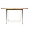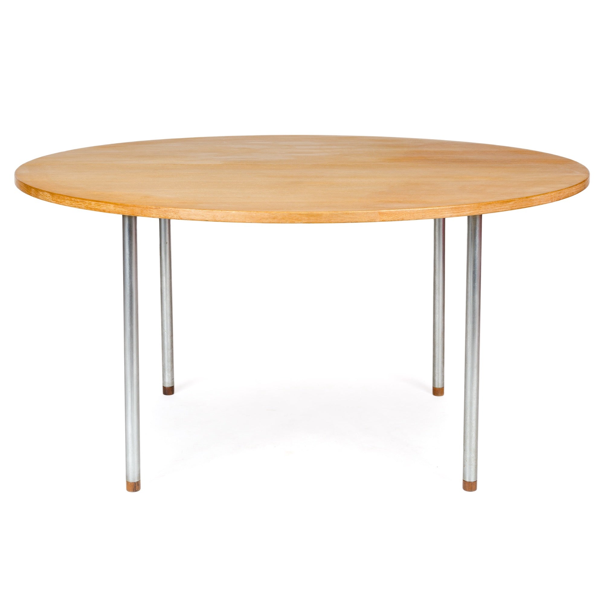 A round extension dining table with oak top set on four tubular chrome legs each tipped with a rosewood insert. Chairs sold separately.