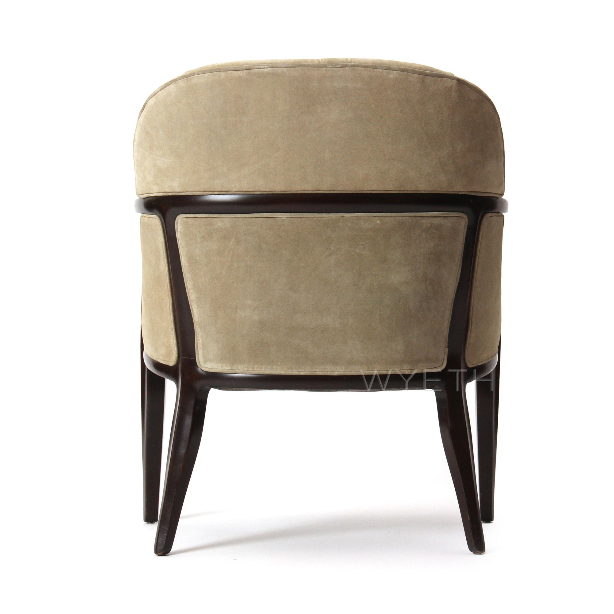 A rare dining height "Janus" arm chair with a sculpted dark mahogany frame and the original upholstery with a button-tufted back.