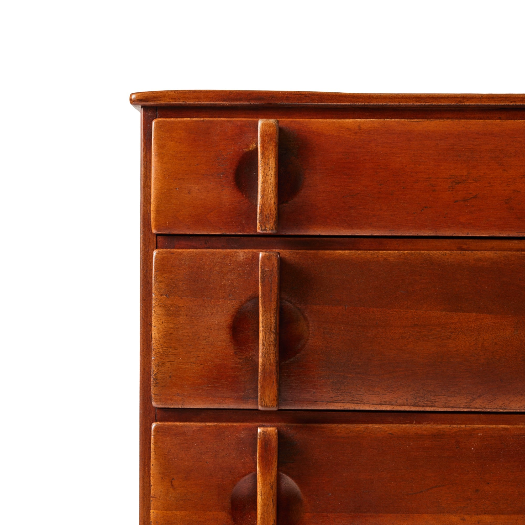 A beautifully crafted five drawer dresser in solid birch, model 6055. Three compartments in second drawer proved service spaces equivalent to five separate drawers. Drawer handle design Patented.