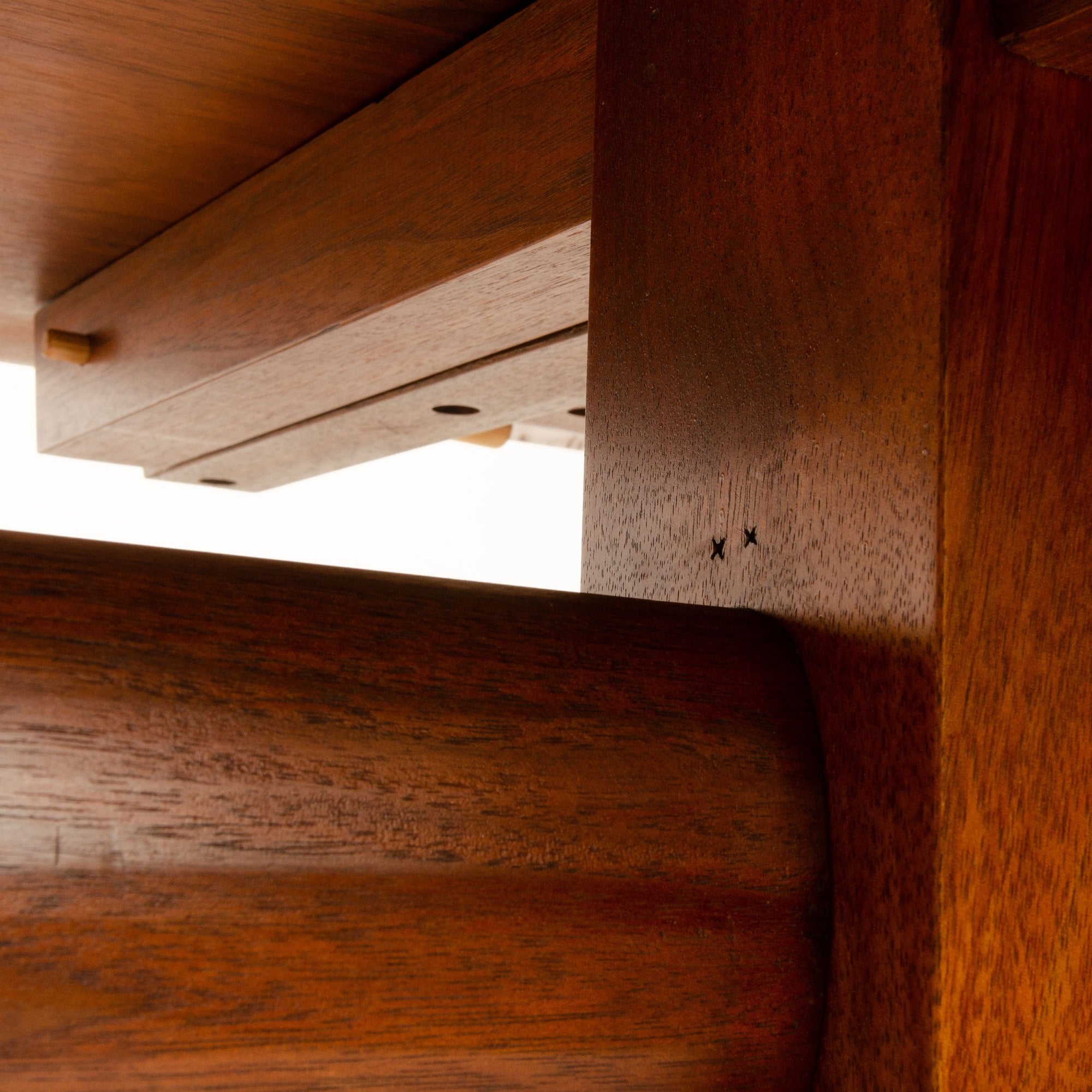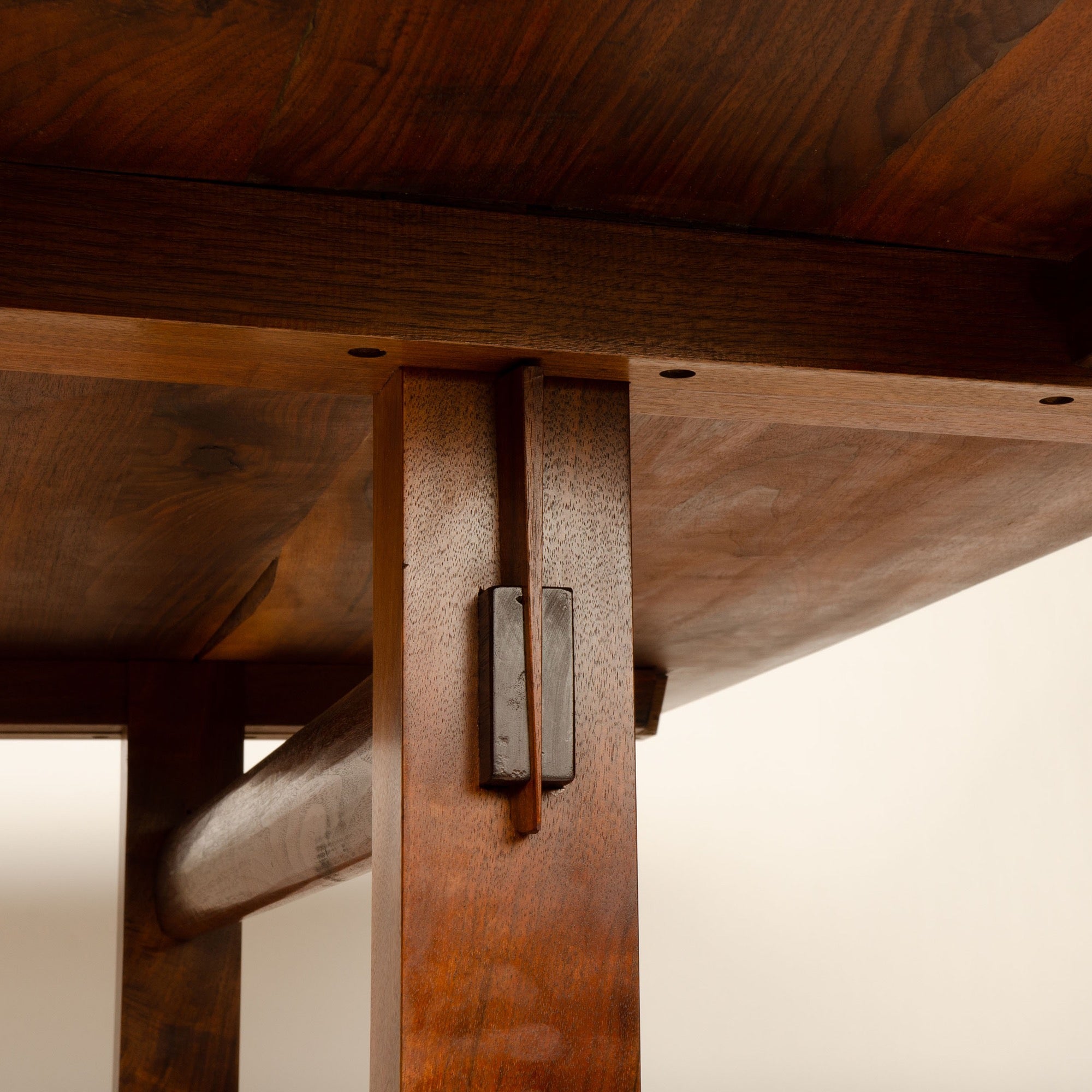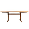 A fine, solid walnut plank top trestle table with an exposed tenon key stretcher, pegged shoe feet, total length includes two 14" x 36" detachable leaves. New Chair priced separately, not included with table.