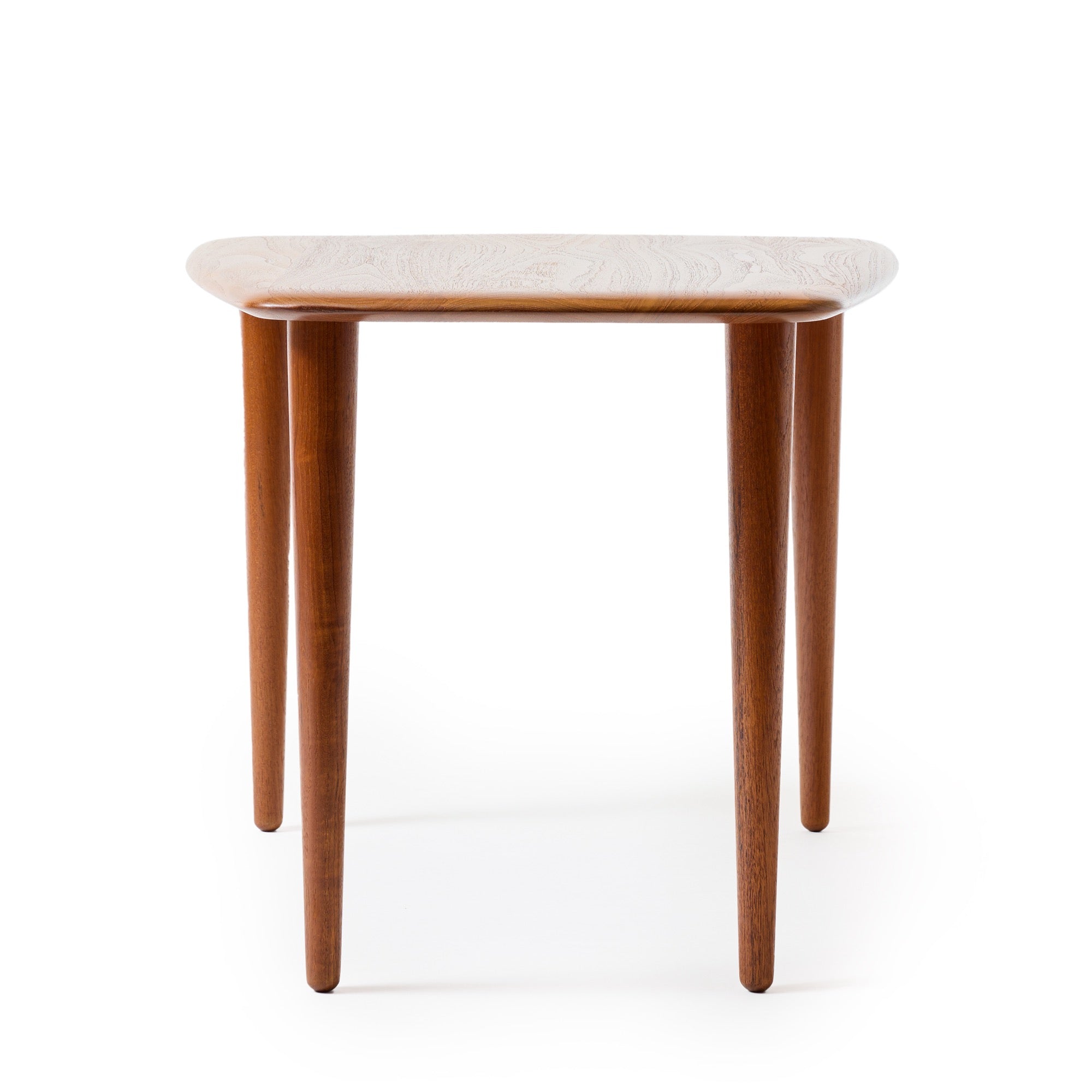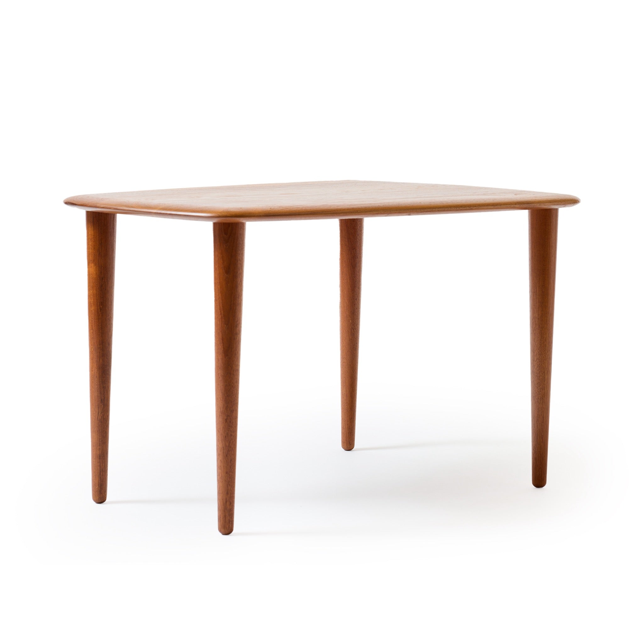 A wedge table on tapered legs in solid teak. Priced per table.
