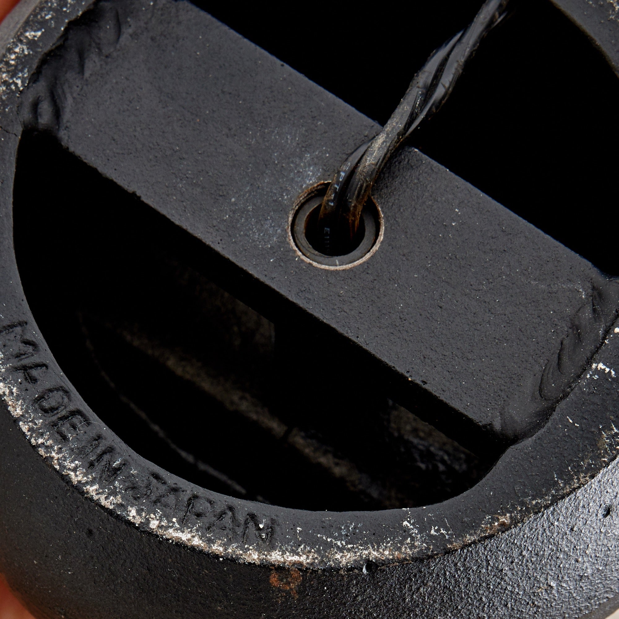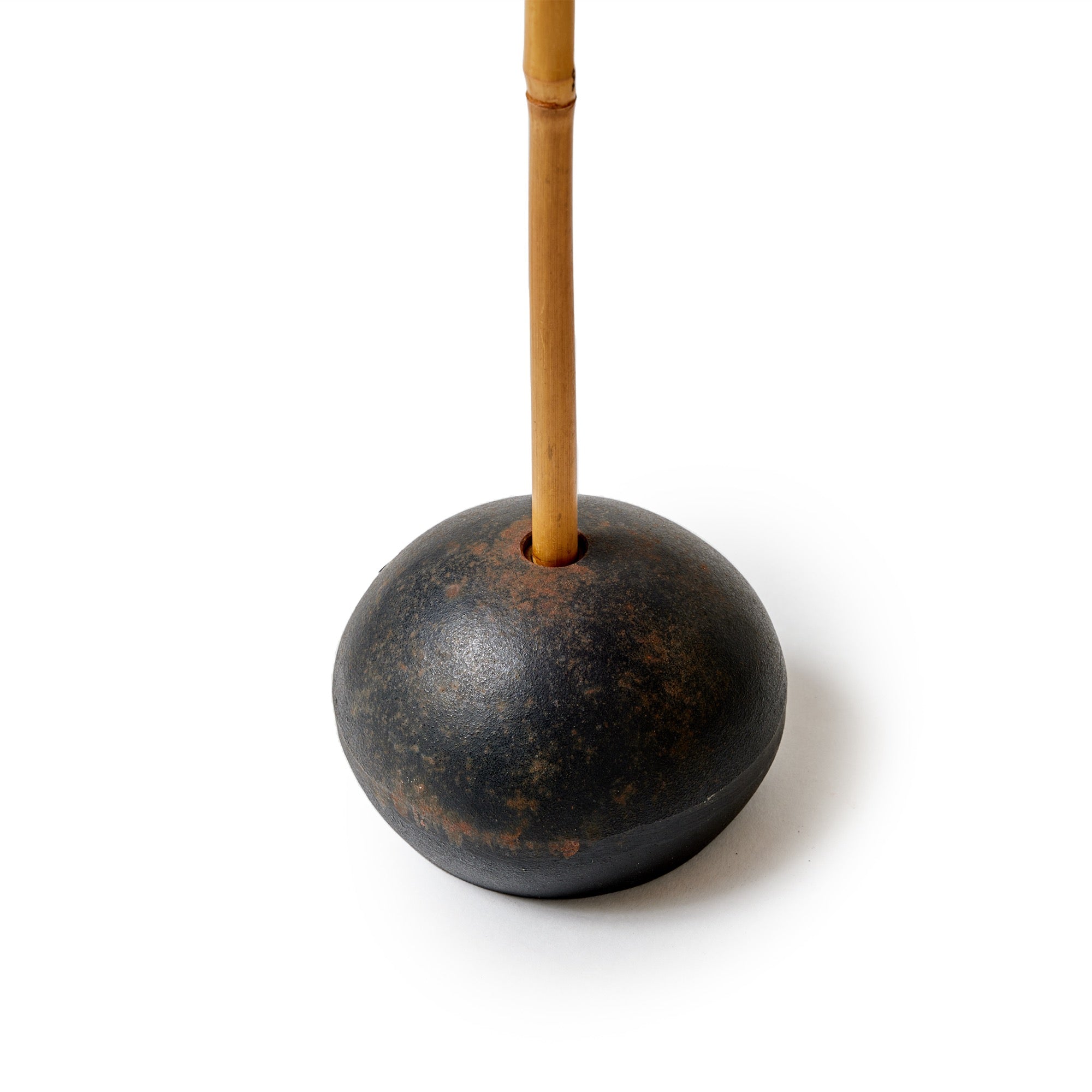 An Akari light sculpture composed of a spherical shade made of washi paper with an internal bamboo structure forming an organic horizontal pattern supported by a bamboo stem and grounded with a cast iron base. Vintage