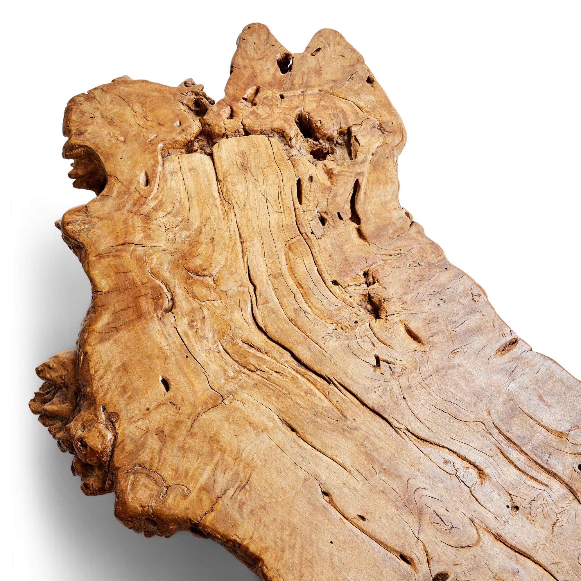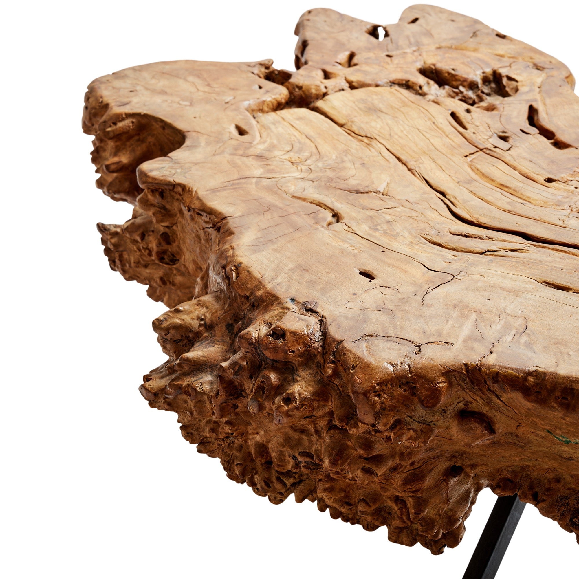 A Sabino burl cocktail / coffee table with three wrought iron legs.