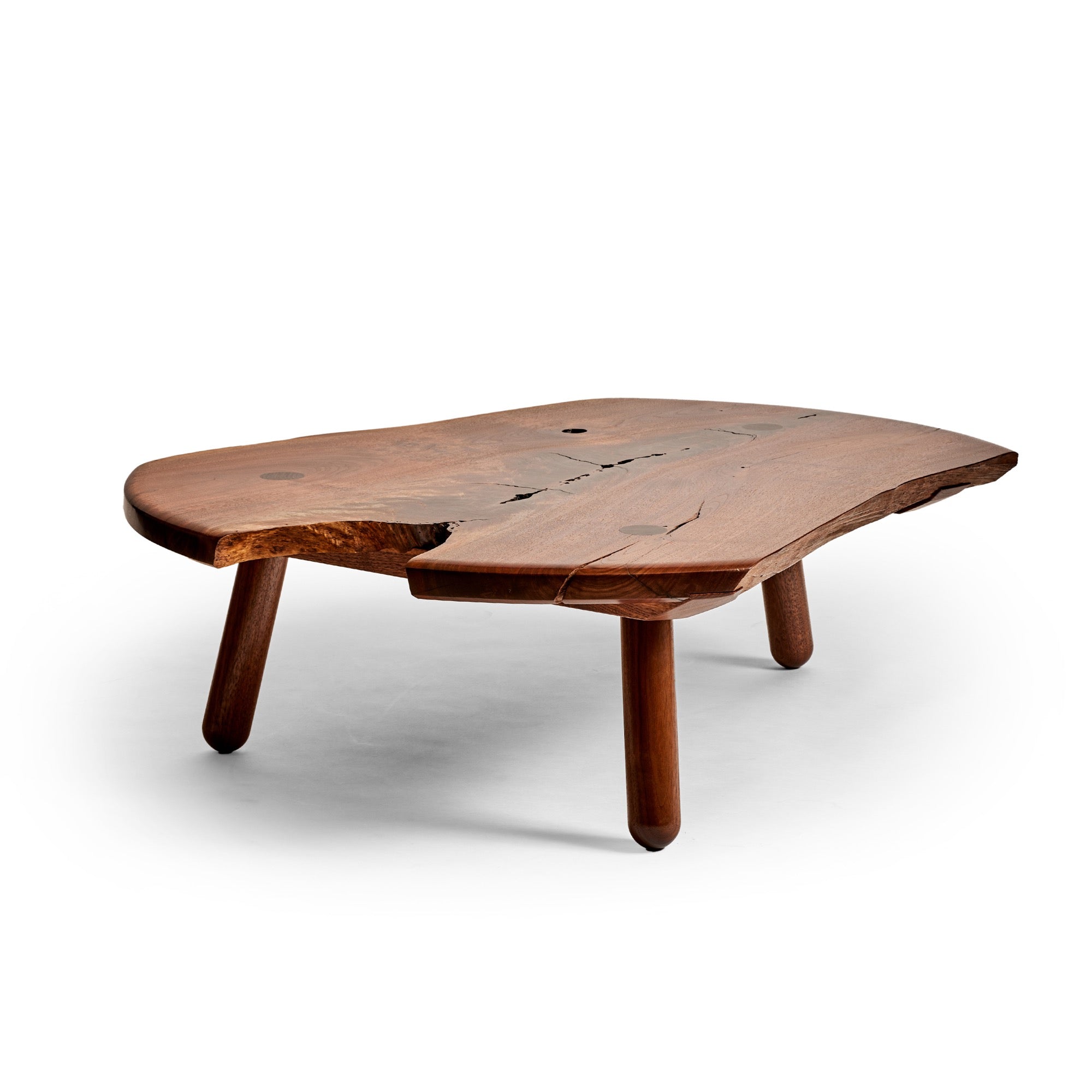 A unique handmade low coffee / cocktail table in solid walnut The top consists of a solid board joined together with sliding dovetail stretchers and exposed natural edges. Three (3) substantial turned legs are mortised through the top.