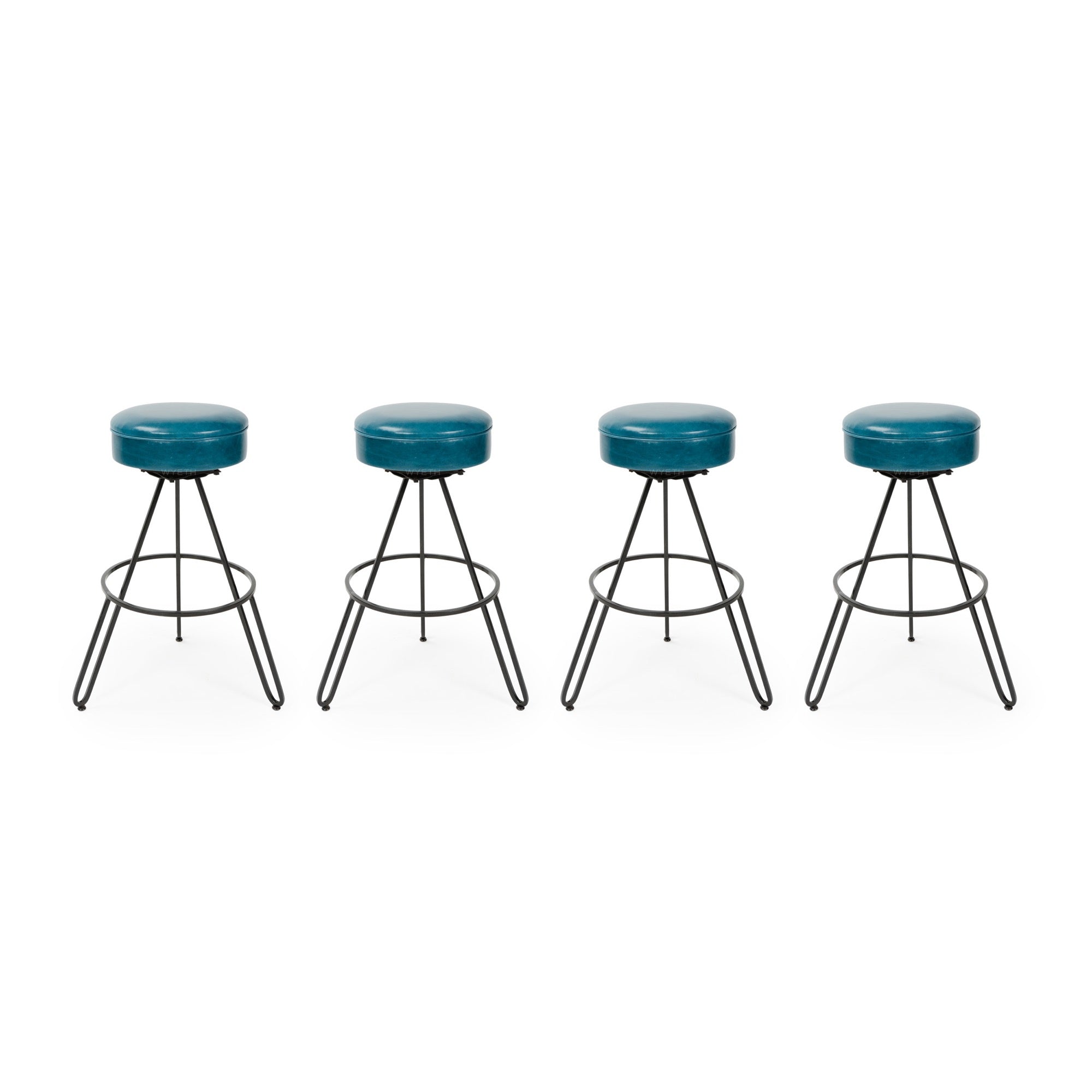 A patinated steel barstool with newly upholstered aqua blue leather swivel seat on splayed, square-rod hairpin legs supporting a ring footrest. (13" Dia seat)