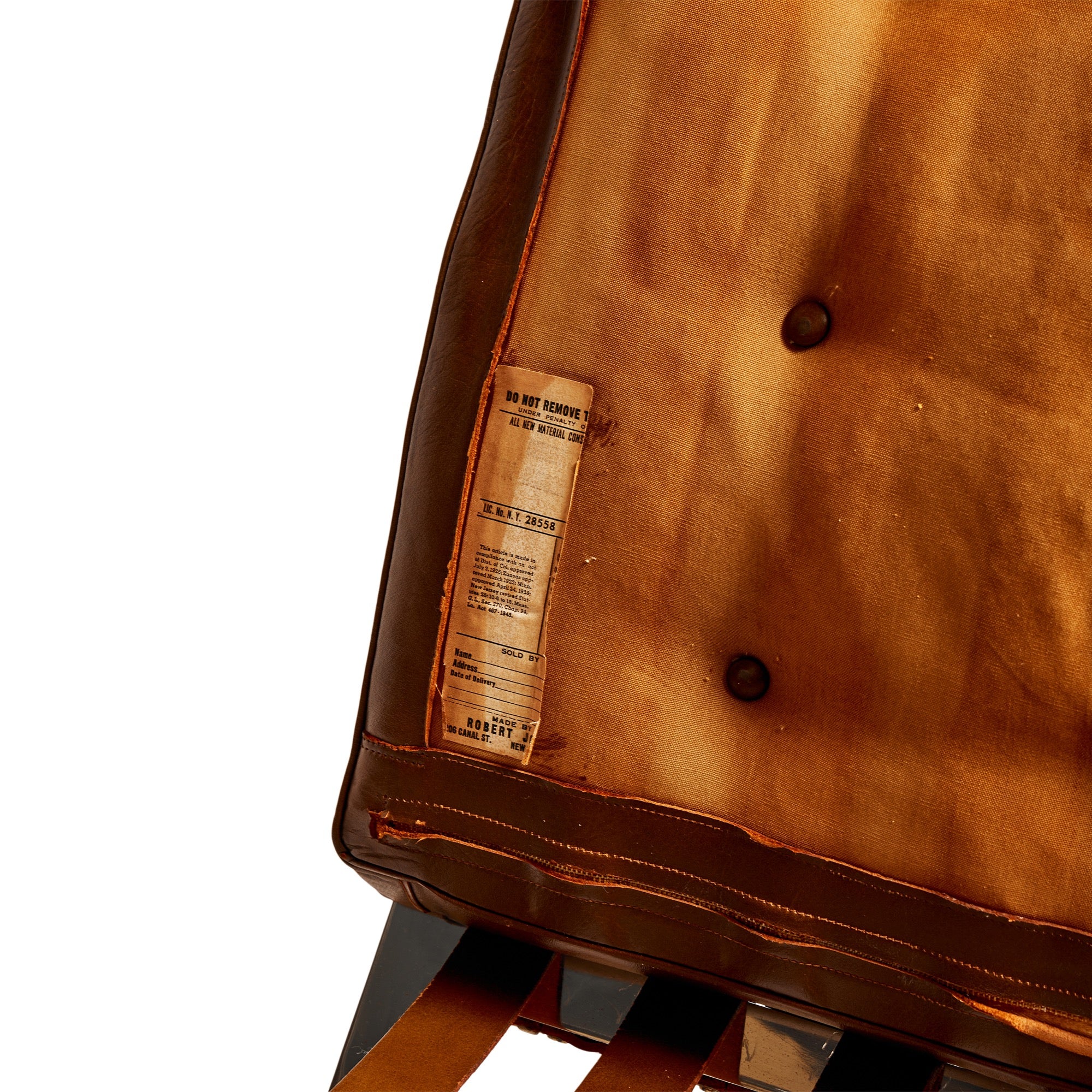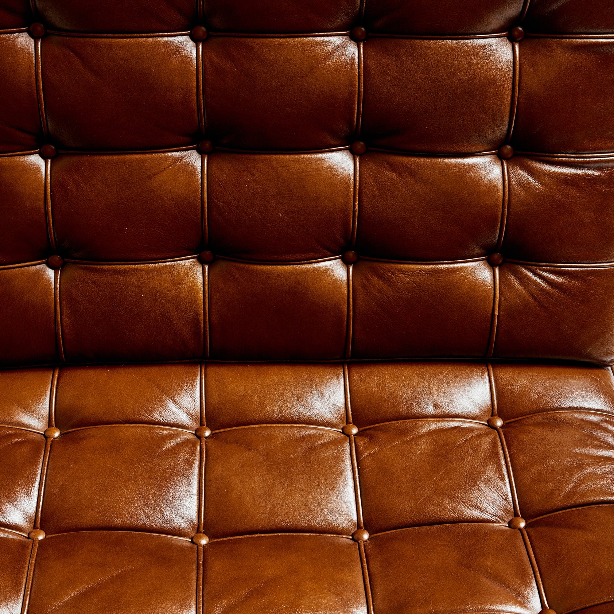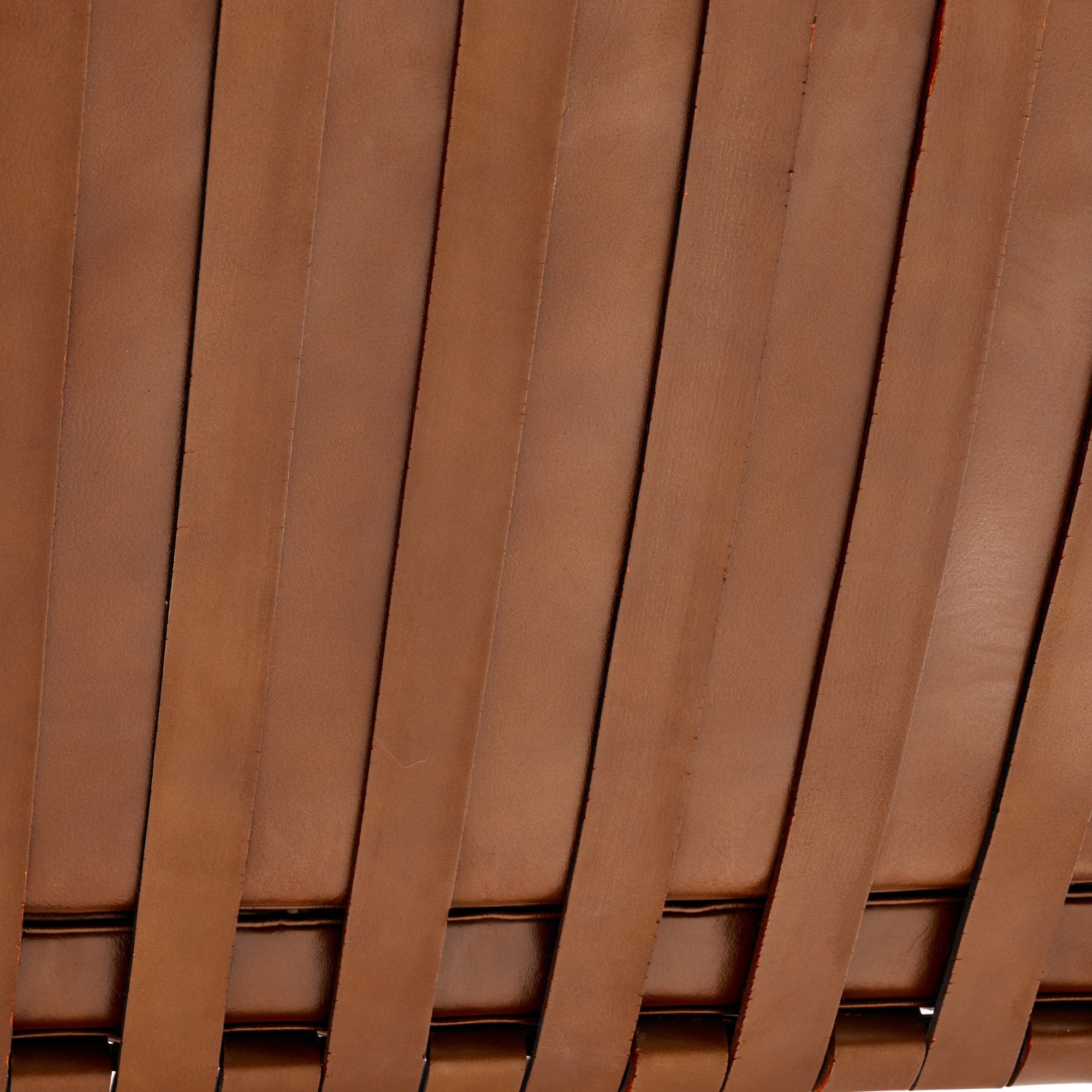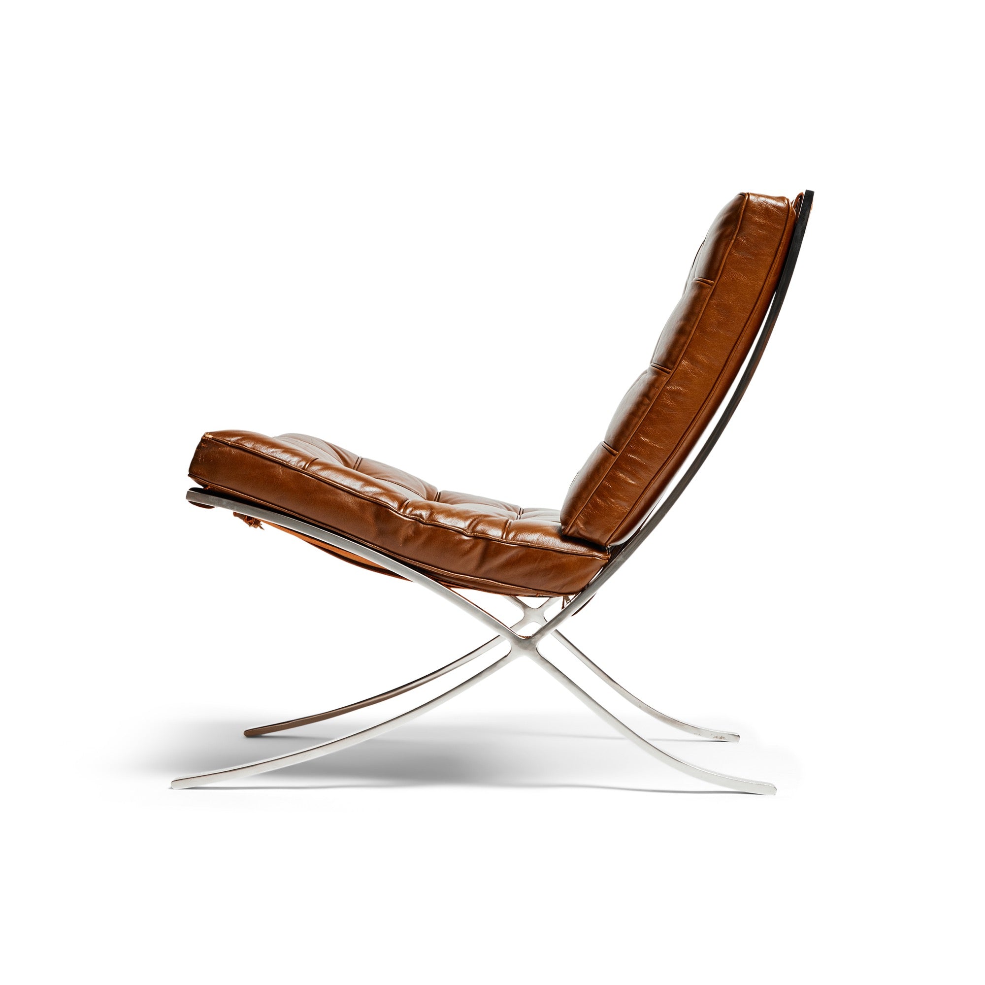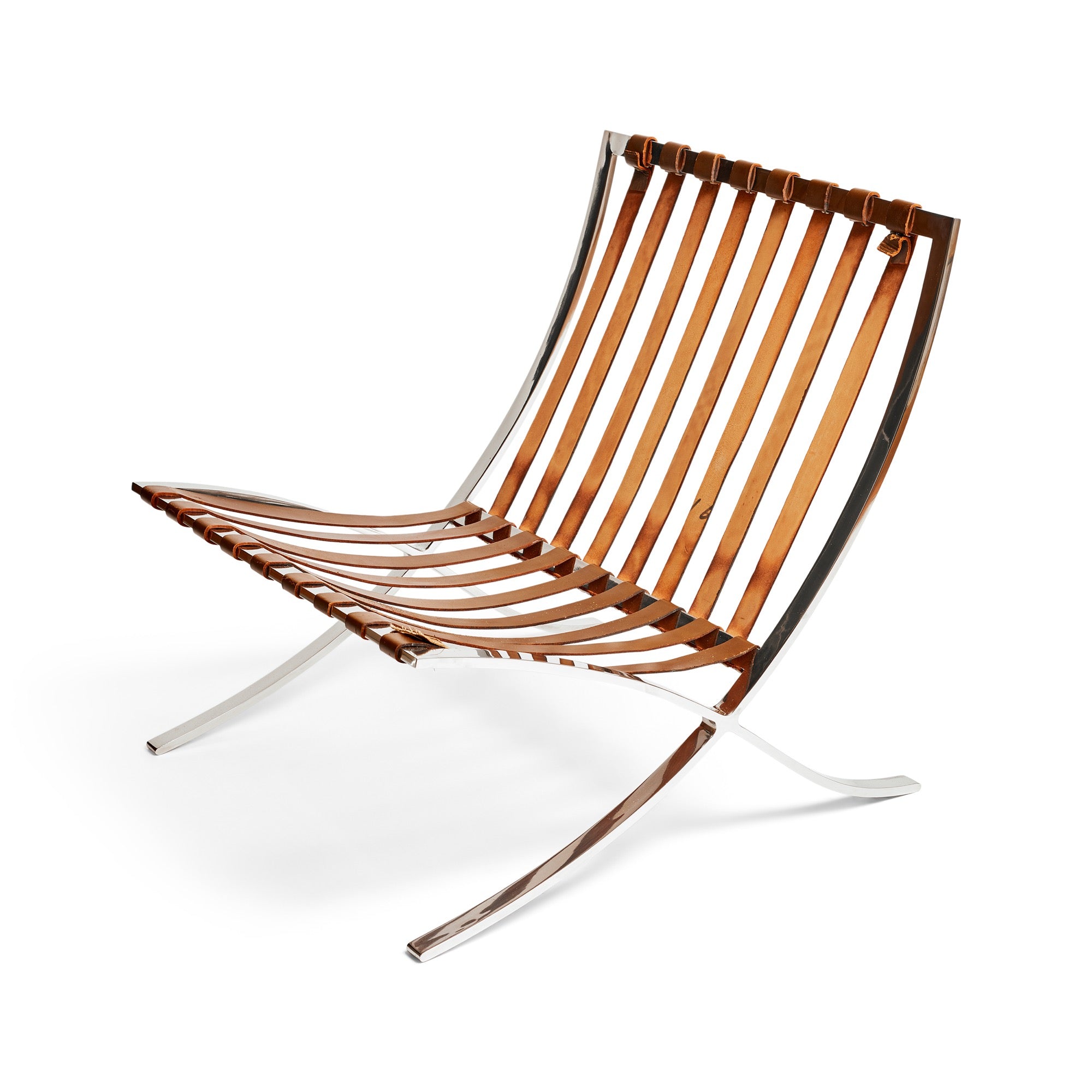A 'Barcelona' chair, with brown leather upholstery and belting straps on a chromed steel frame.