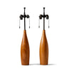 A table lamp with a teak base in the form of a bowling pin Priced per lamp.