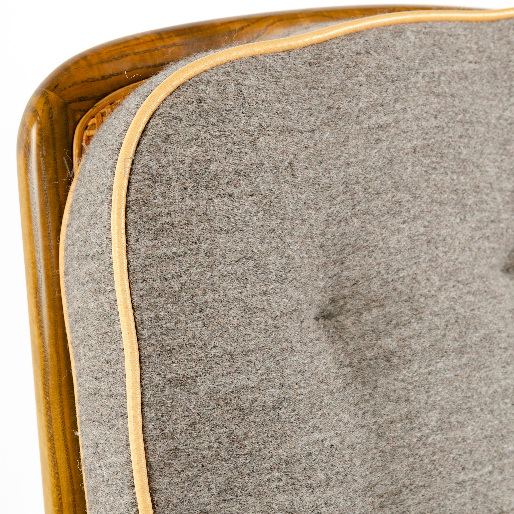An adjustable rocking chaise with caned seat and back with bent ash frame and grey savak with natural leather welting upholstered cushion.