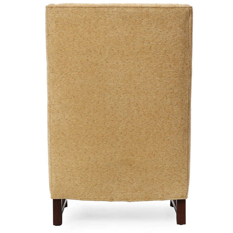 A pair of stately and comfortable high backed, button-tufted Mister lounge chair with mahogany legs and side stretchers.
