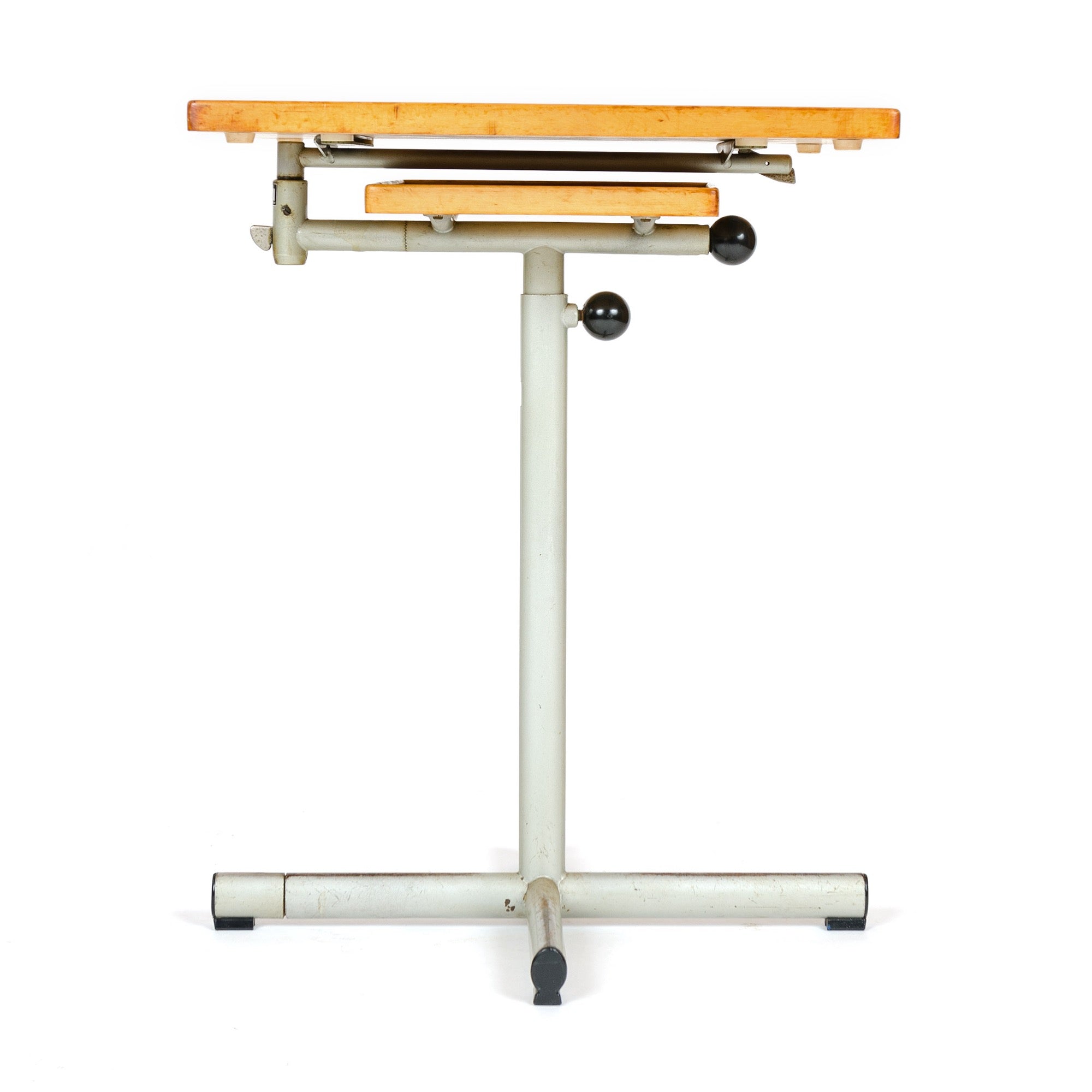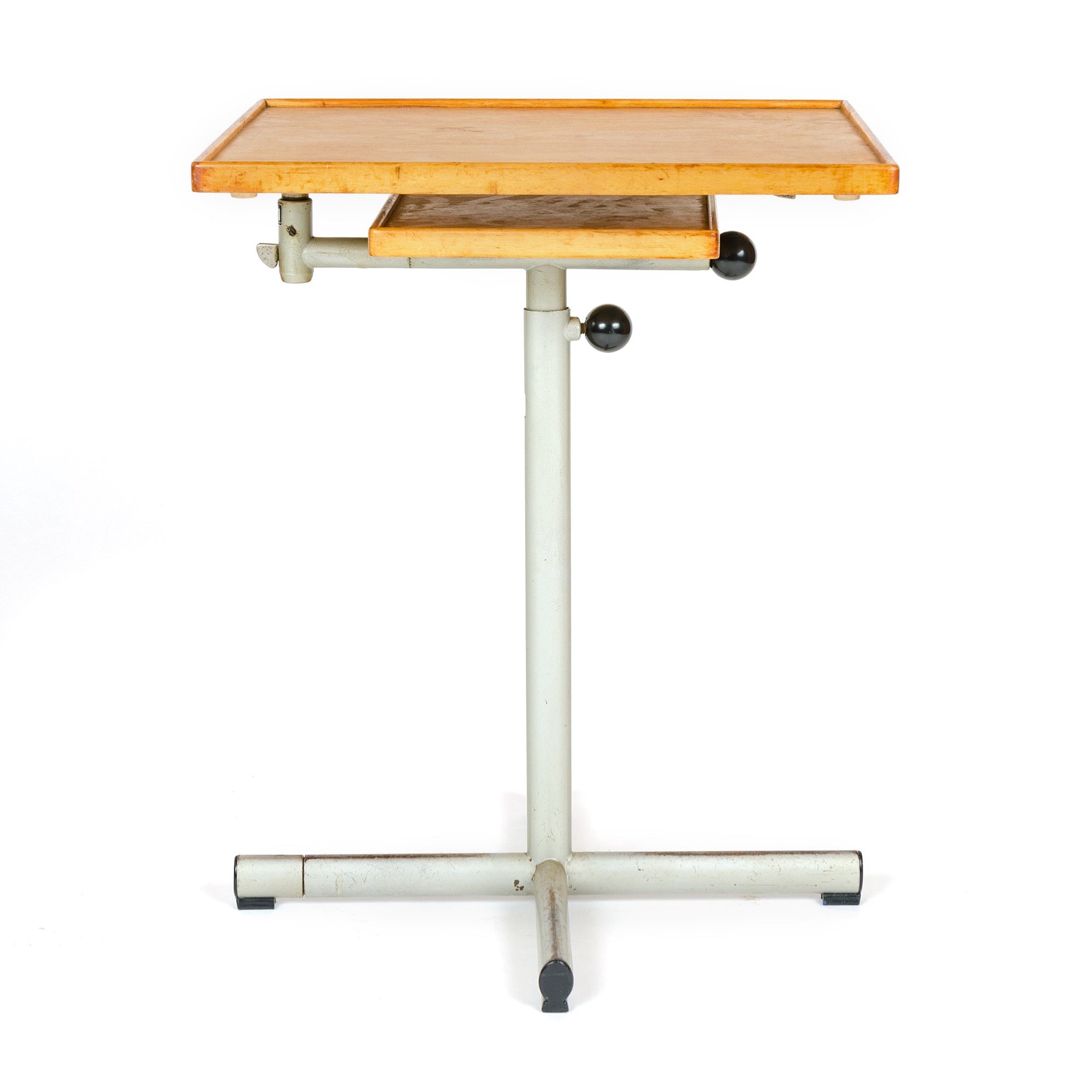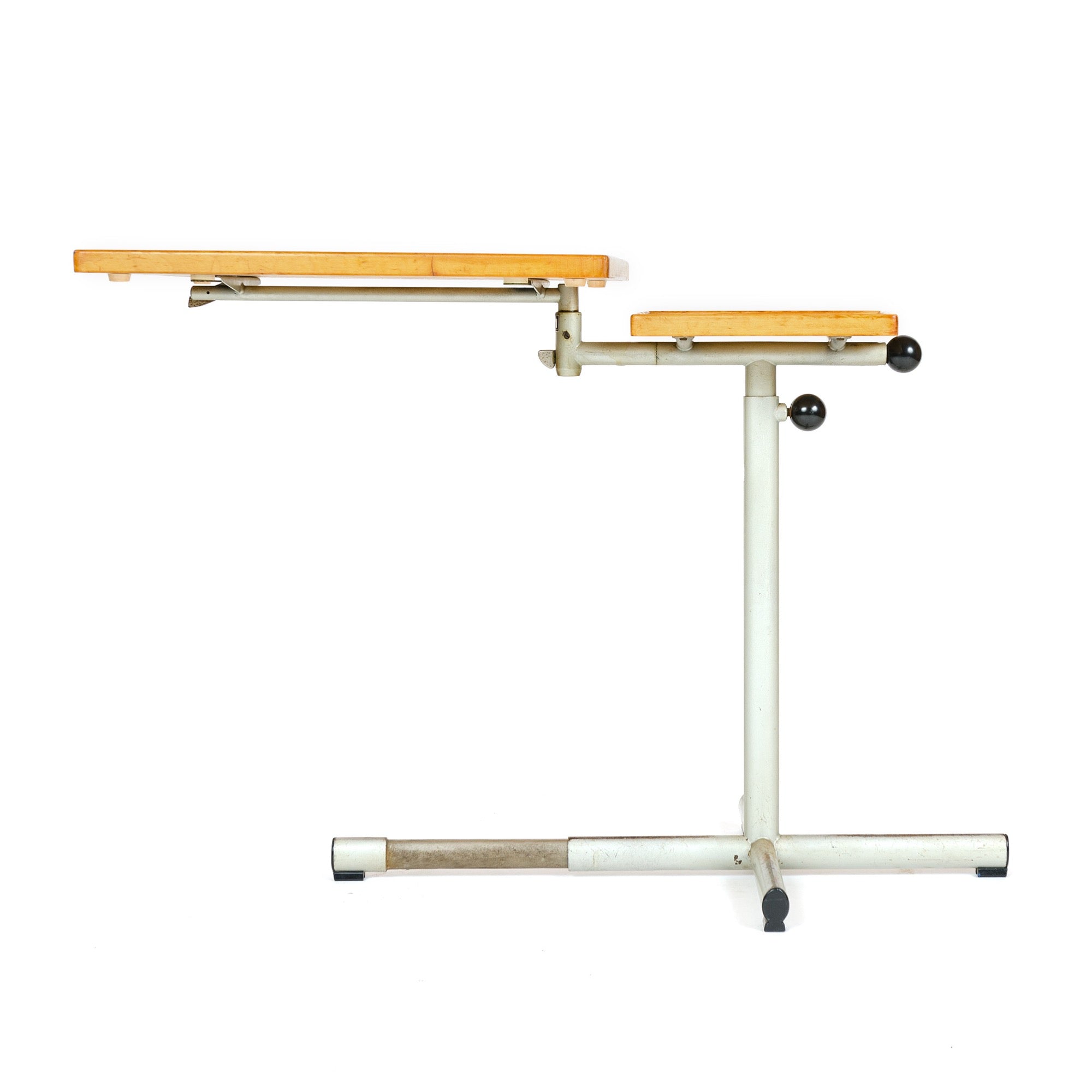 A beautifully engineered utility tray table or workstation with a copper plated steel base and a Bakelite handle. The upper surface swings around has a 90º tilt and adjusts to 26" - 40"H.