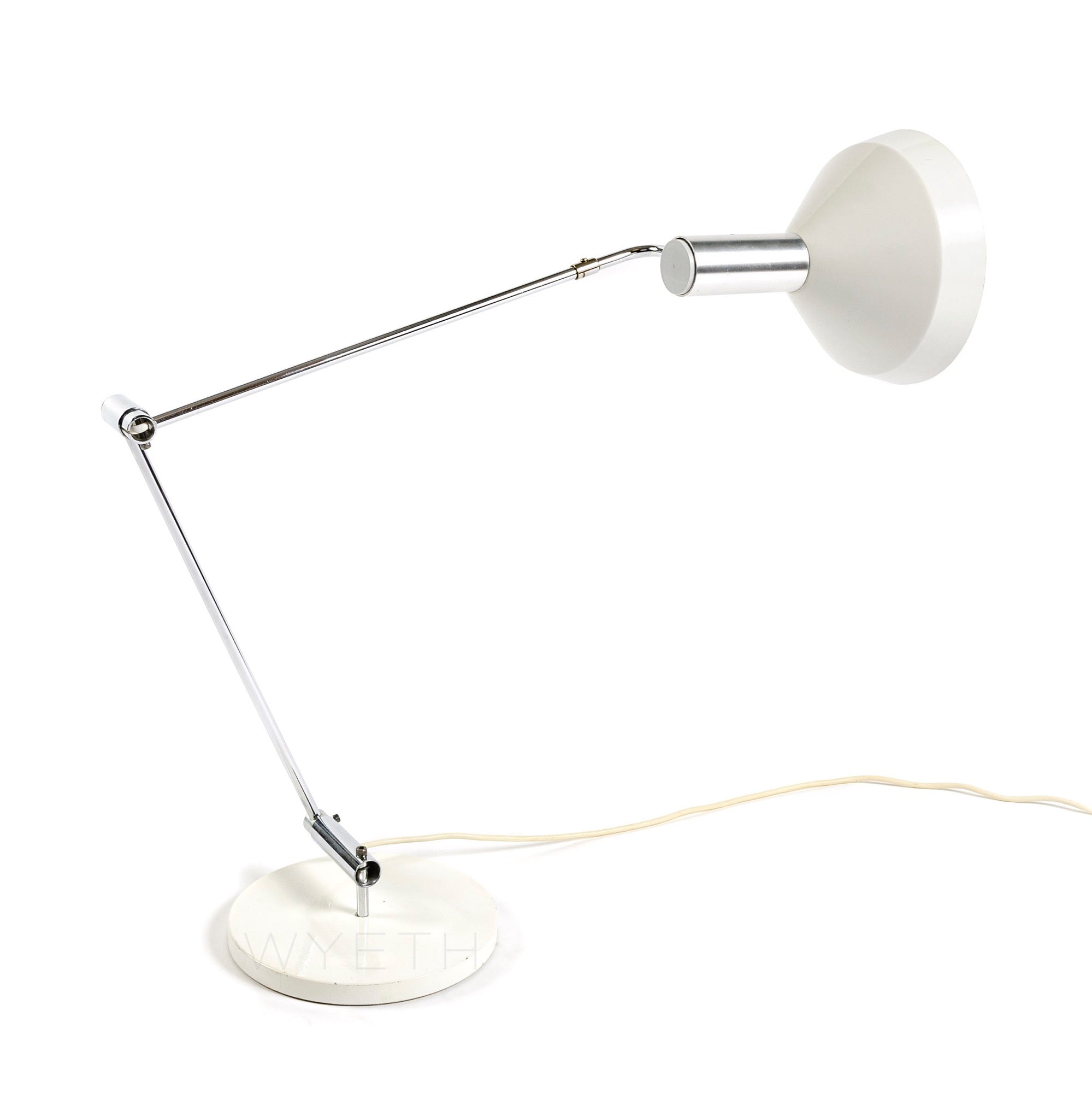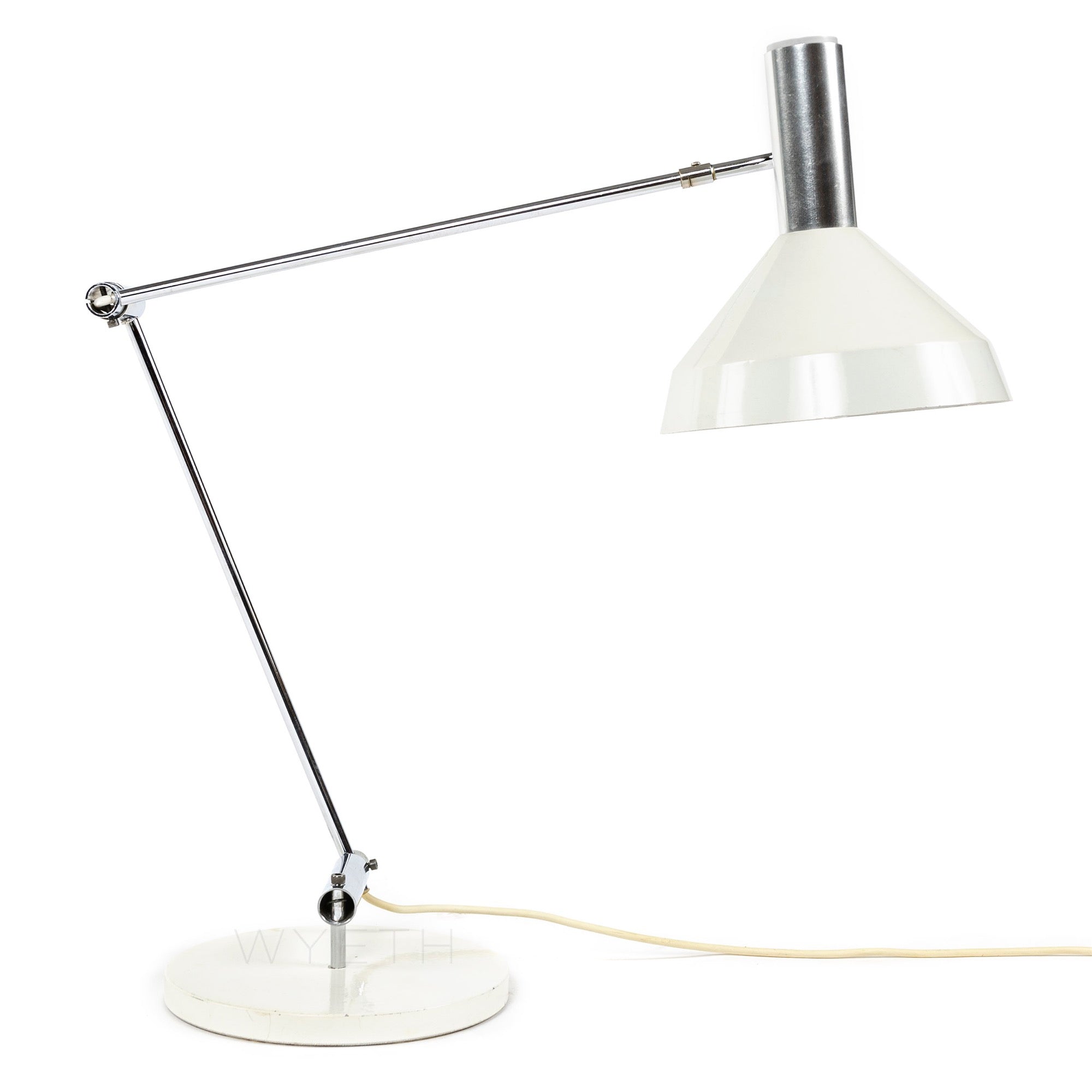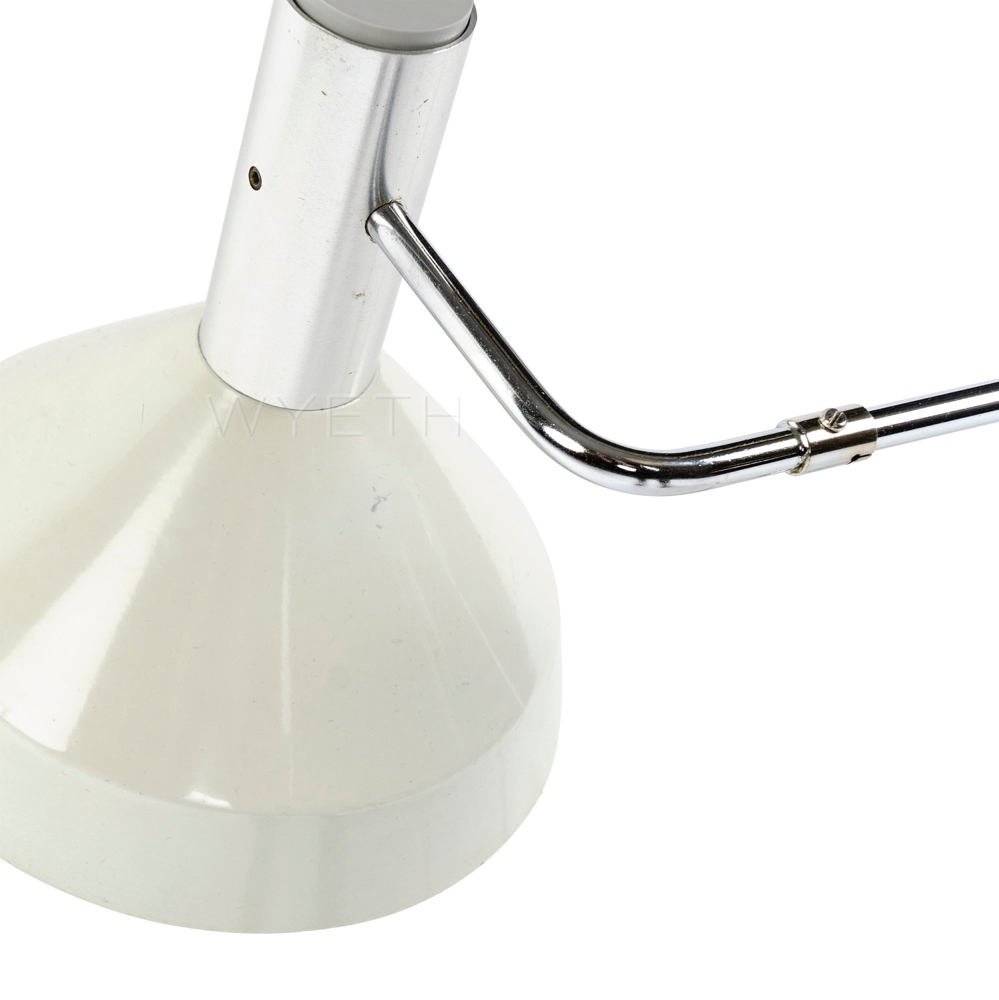 A hefty weighted base supports this fully articulated lamp having two 16’’ arms connected by three adjusting joints and a swivel at its socket which allows an additional 360 degrees of rotation. A clever push button disc mounted in the socket tube controls the on/off function.