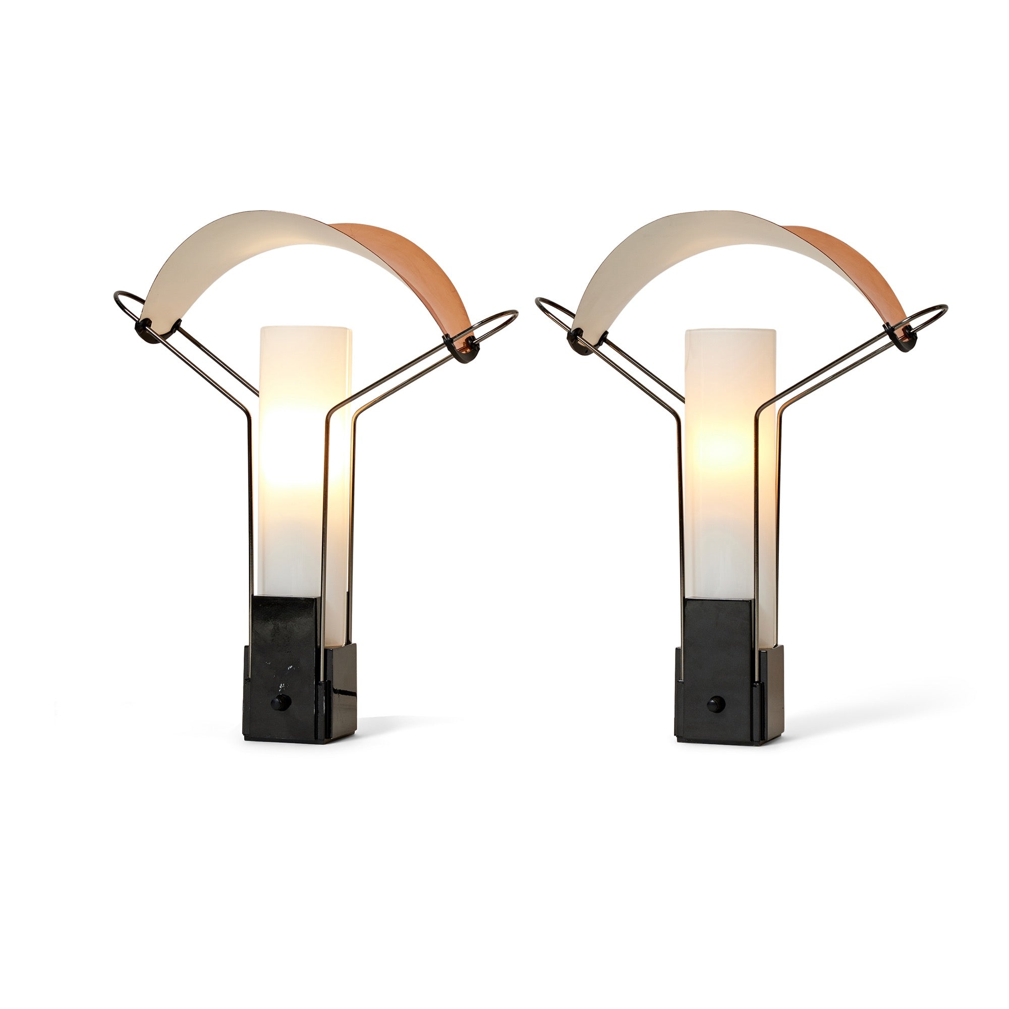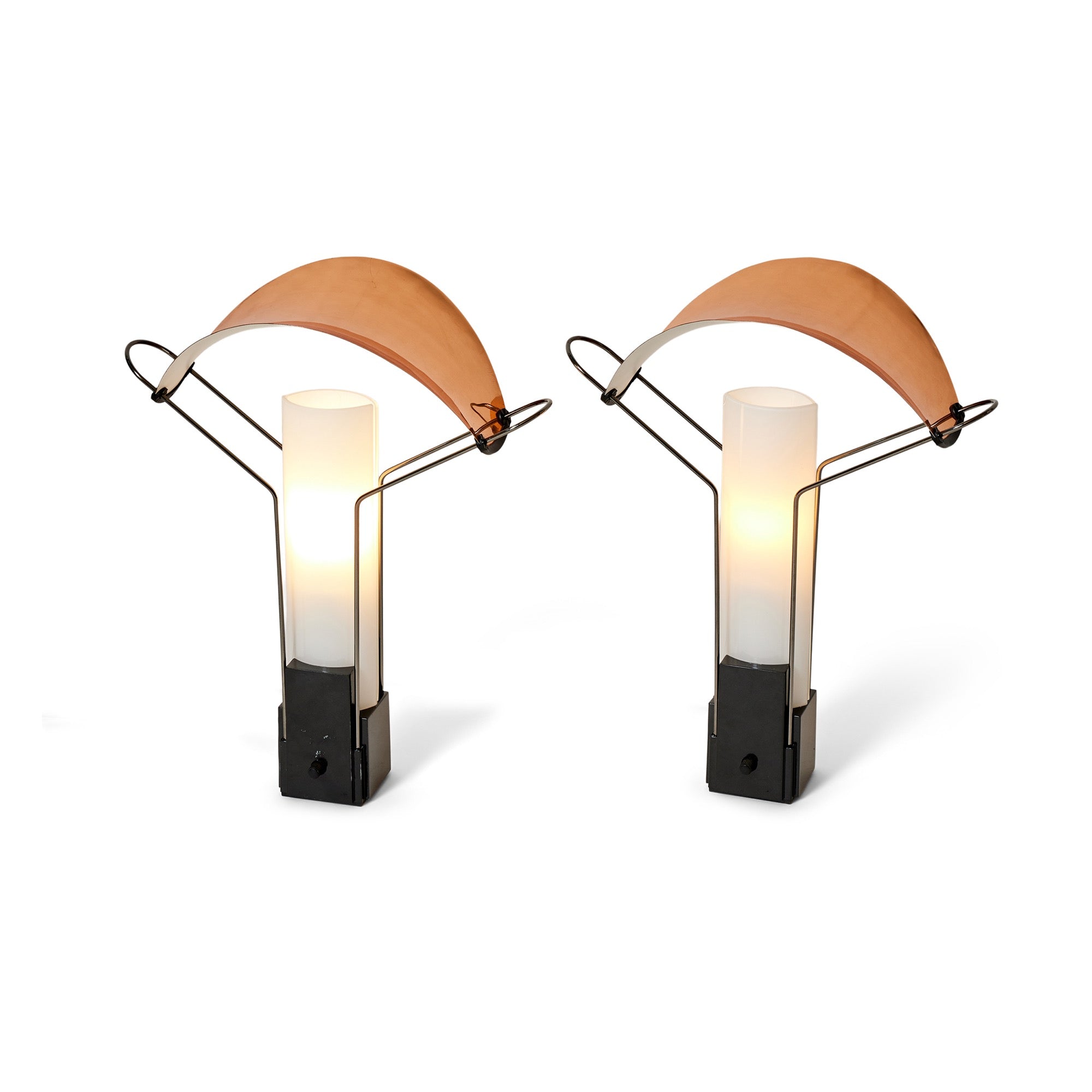 A 'palio' table lamp with black square bases supporting twin white glass diffusers and a rare version solid copper "parachute" shade on bent rod supports. These lamps have built in dimmers that are high quality for bulbs up to 150 watts.