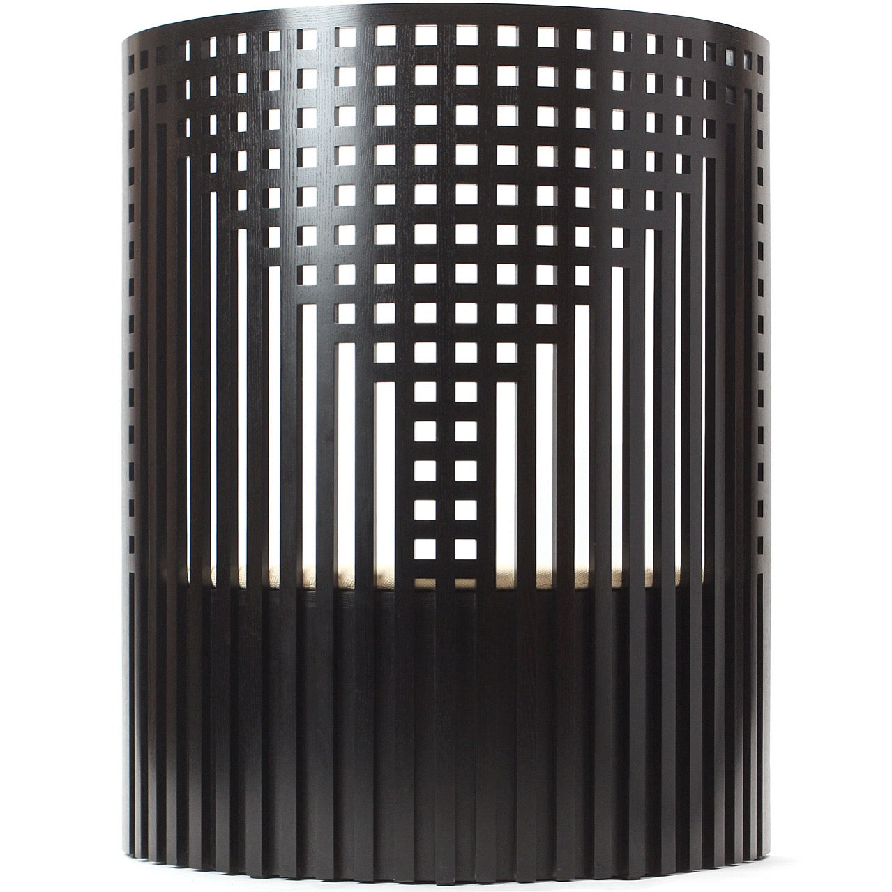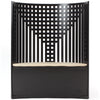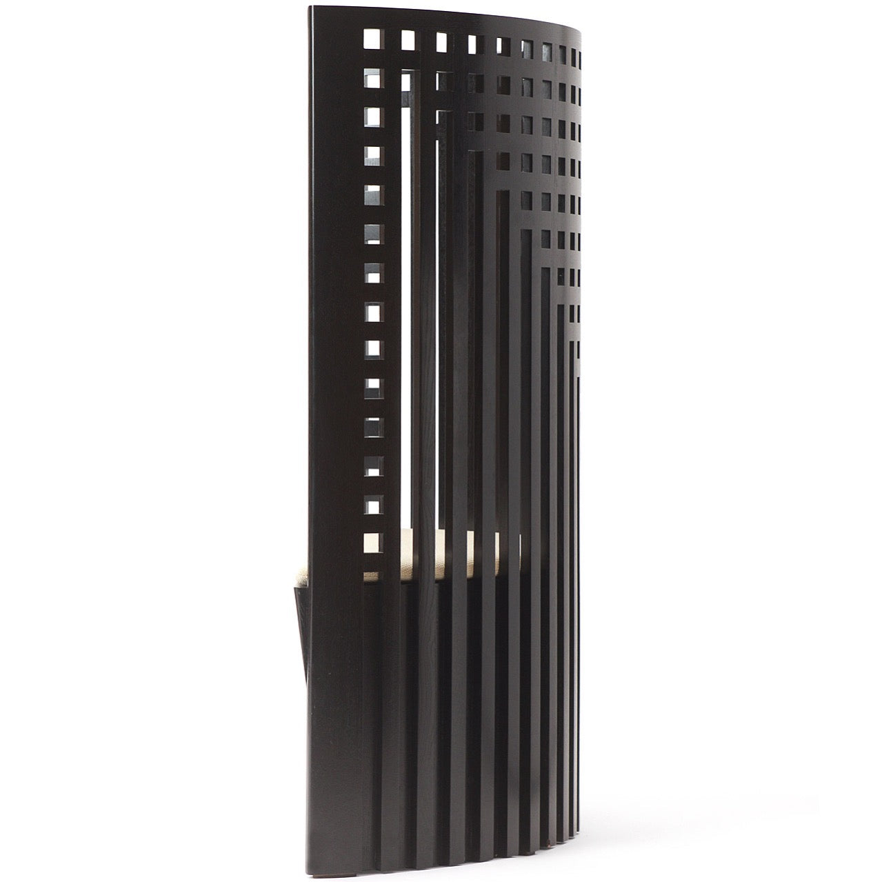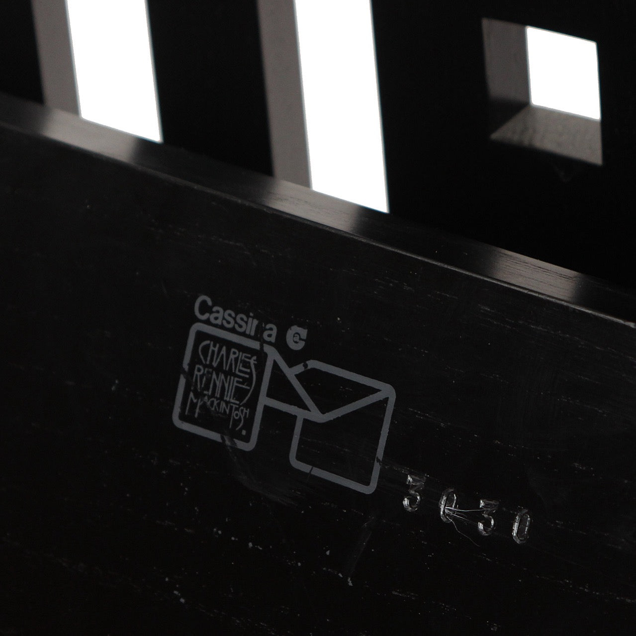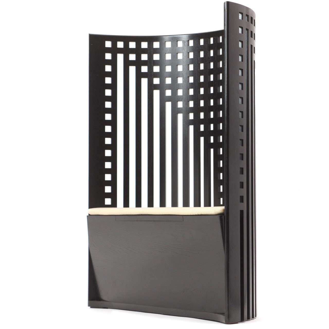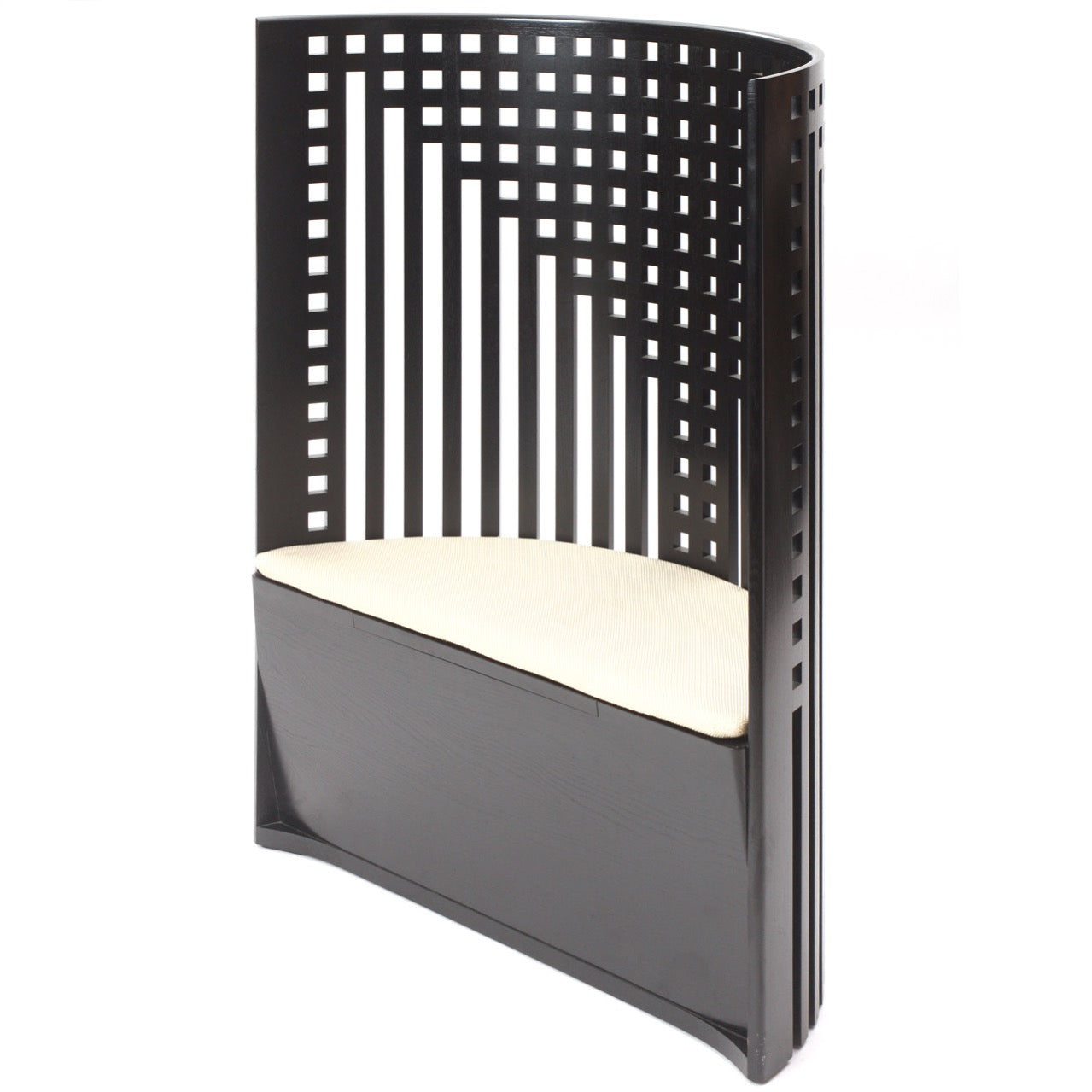 A small settee or large chair with a curved back having an abstracted geometric design that evokes the pattern of a willow tree, originally created by Charles Rennie Mackintosh for the Willow Tea Room in Glasgow, Scotland in 1902 and later manufactured in the 1970s by Baker Furniture Company.