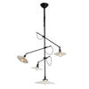 An industrial chandelier with a single stationary down-lit lamp and three adjustable arms and respective lamps. This fixture is signed on the rosette, has a dark patinated finish, and the original vintage milk glass disk shades with clear Edison light bulbs. Also available with globe diffusers.