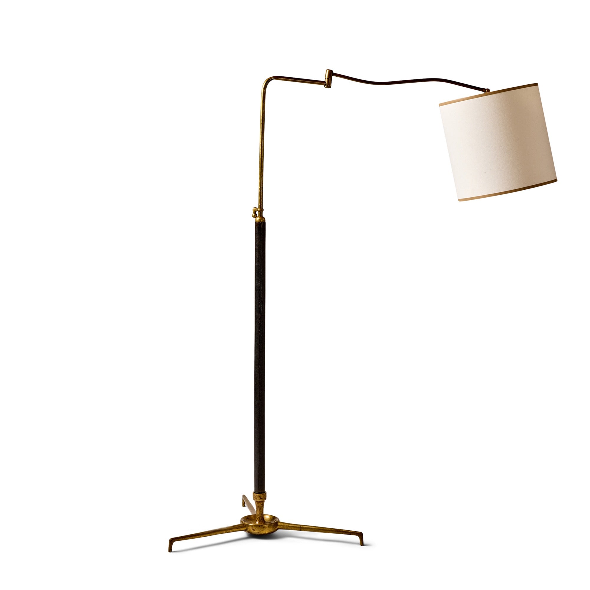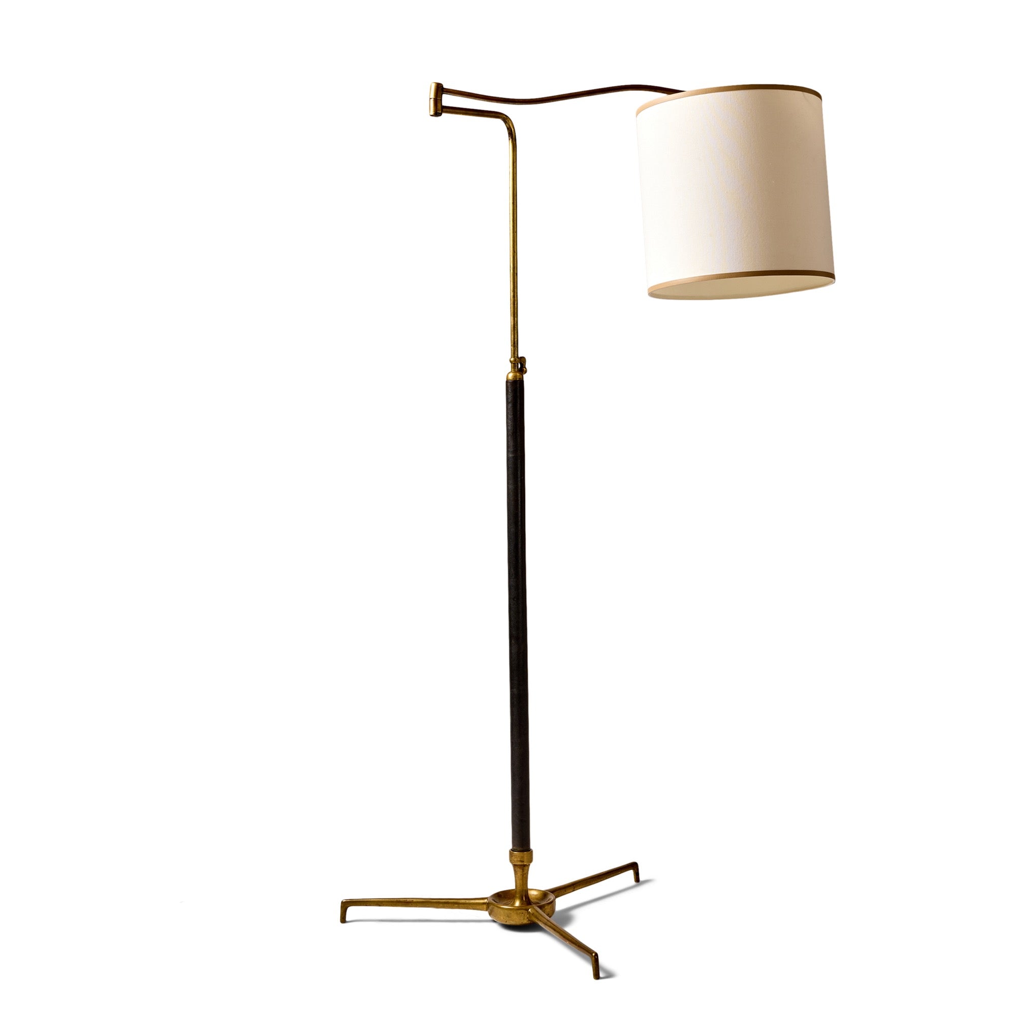 A swing arm floor lamp having a patinated bronze tripod base and a leather-wrapped stem.
