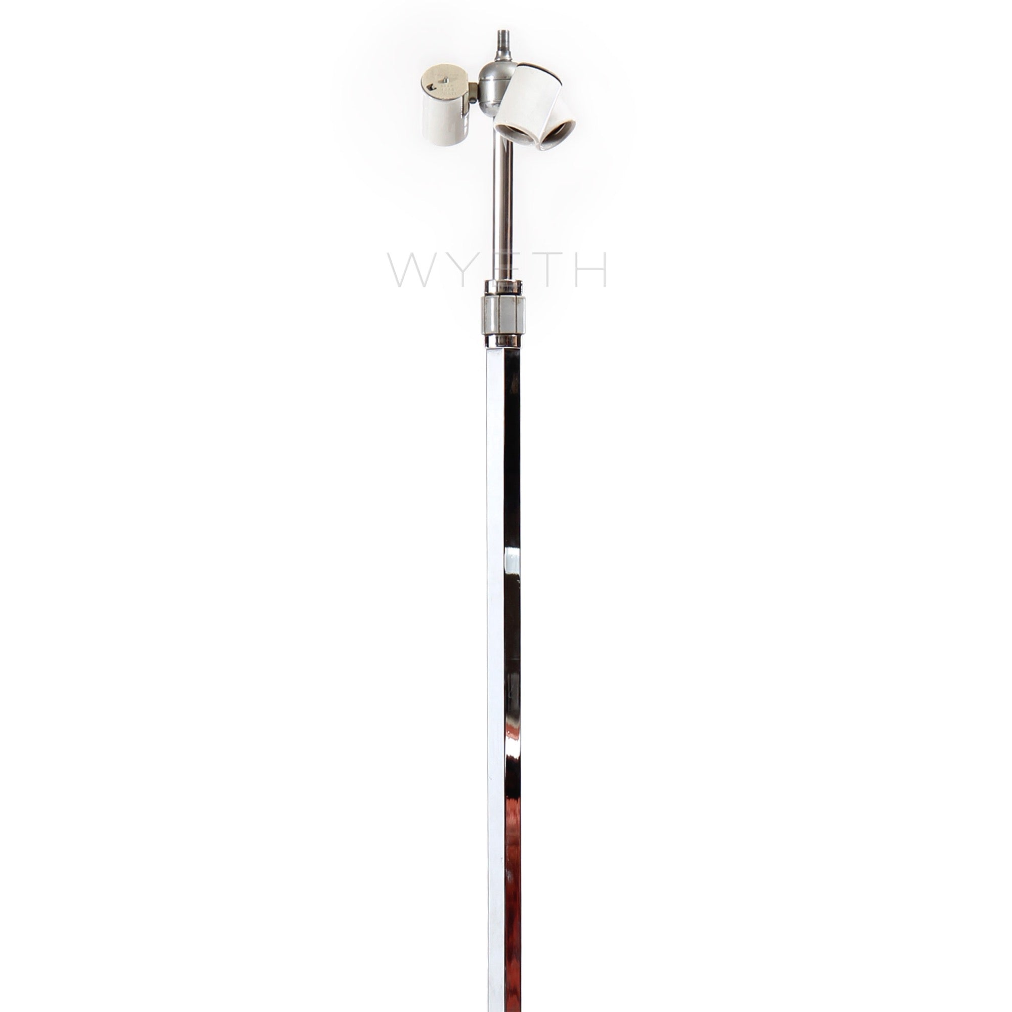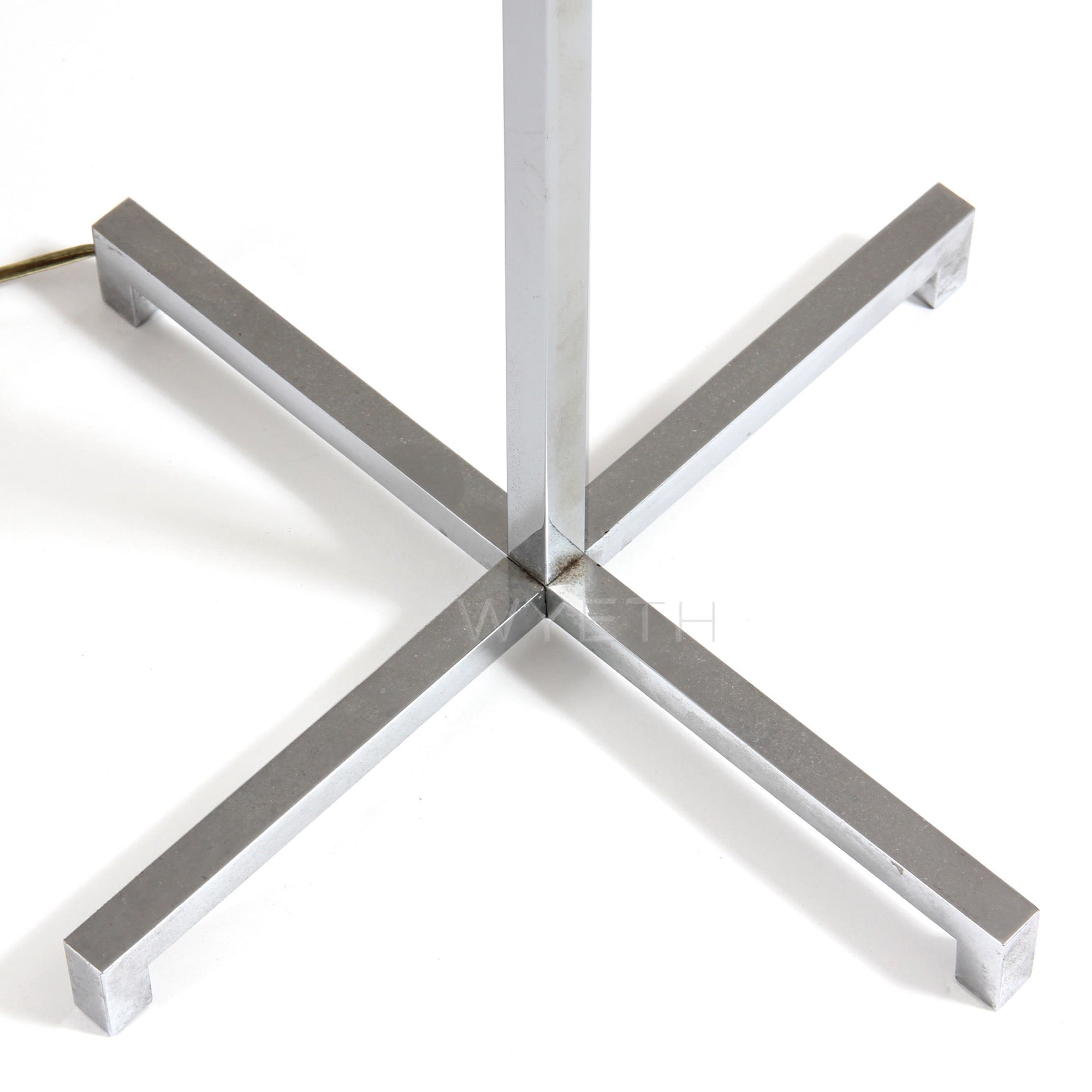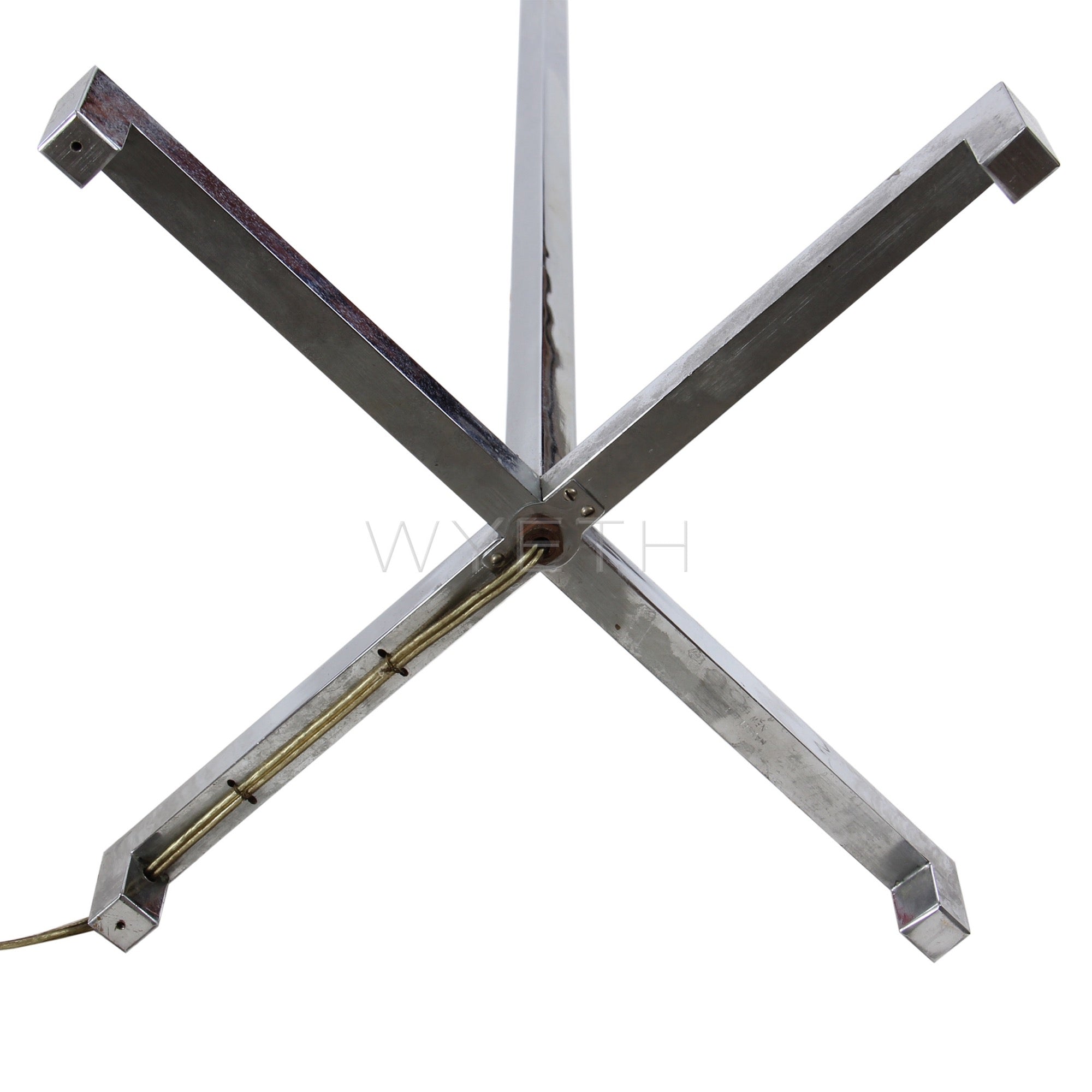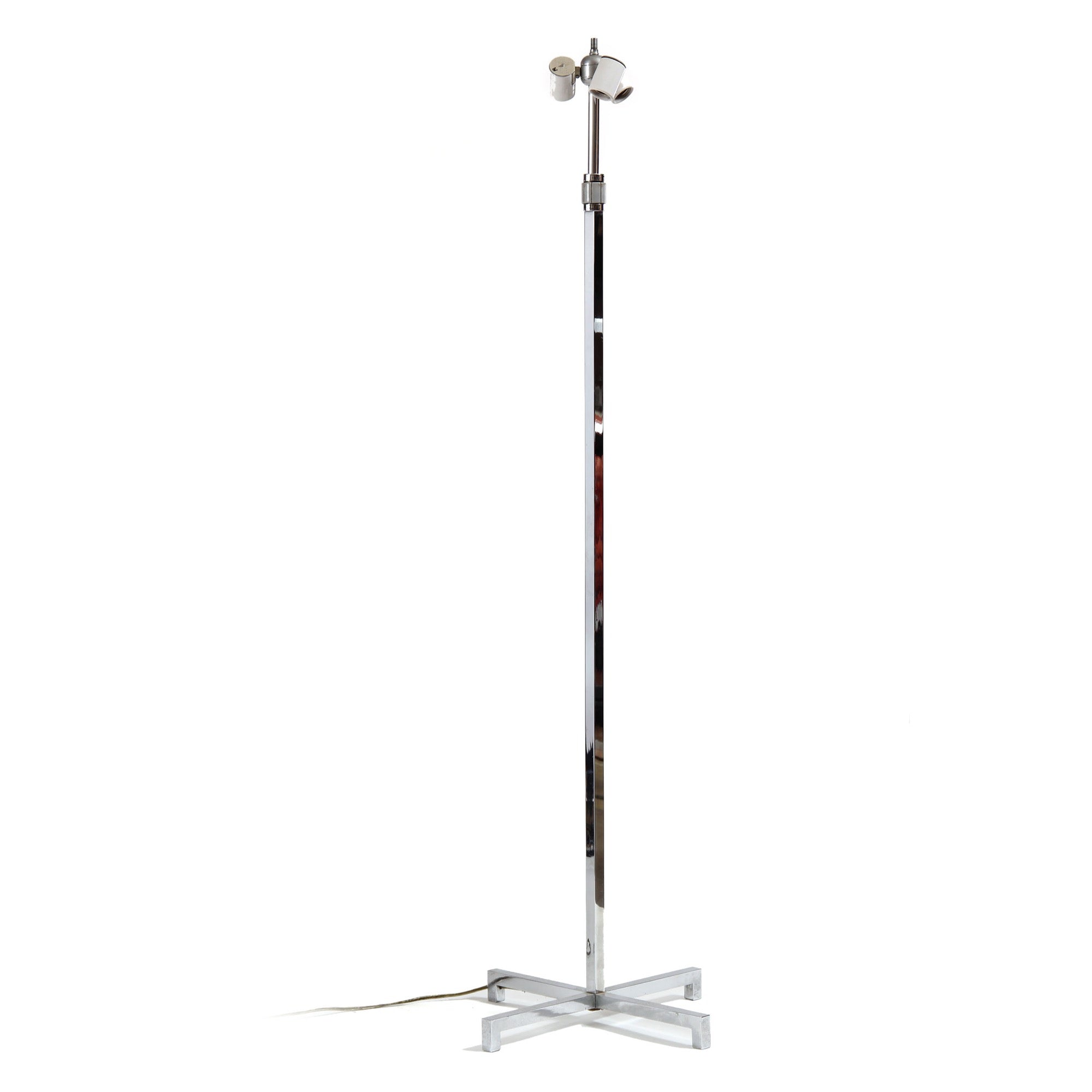 A floor lamp comprised of square tubular chrome having a single vertical shaft set upon an X form base. The On/Off function of the three light cluster is controlled by a proprietary General Electric rotary switch being integral to the upper shaft of the lamp.