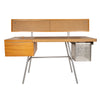 George Nelson’s masterpiece of utility, the 4658 residential desk produced from 1947-1953 is adept at filling the needs of an efficient home office. The desk is constructed of richly grained Primavera finished on all four sides, the writing surface covered in beige leather as are the sliding doors on the storage superstructure which is raised by two aluminum posts allowing for the extension of the work surface creating more space for oversize paperwork or larger projects. The superstructure contains drawers, cubbies, and open shelf space as does the typewriter compartment well to the left of the writing surface. The desk is replete with a perforated, satin chrome file basket which slides out and accommodates Pendaflex file folders while the whole of it rests on a sturdy and stable welded steel frame finished in satin chrome.