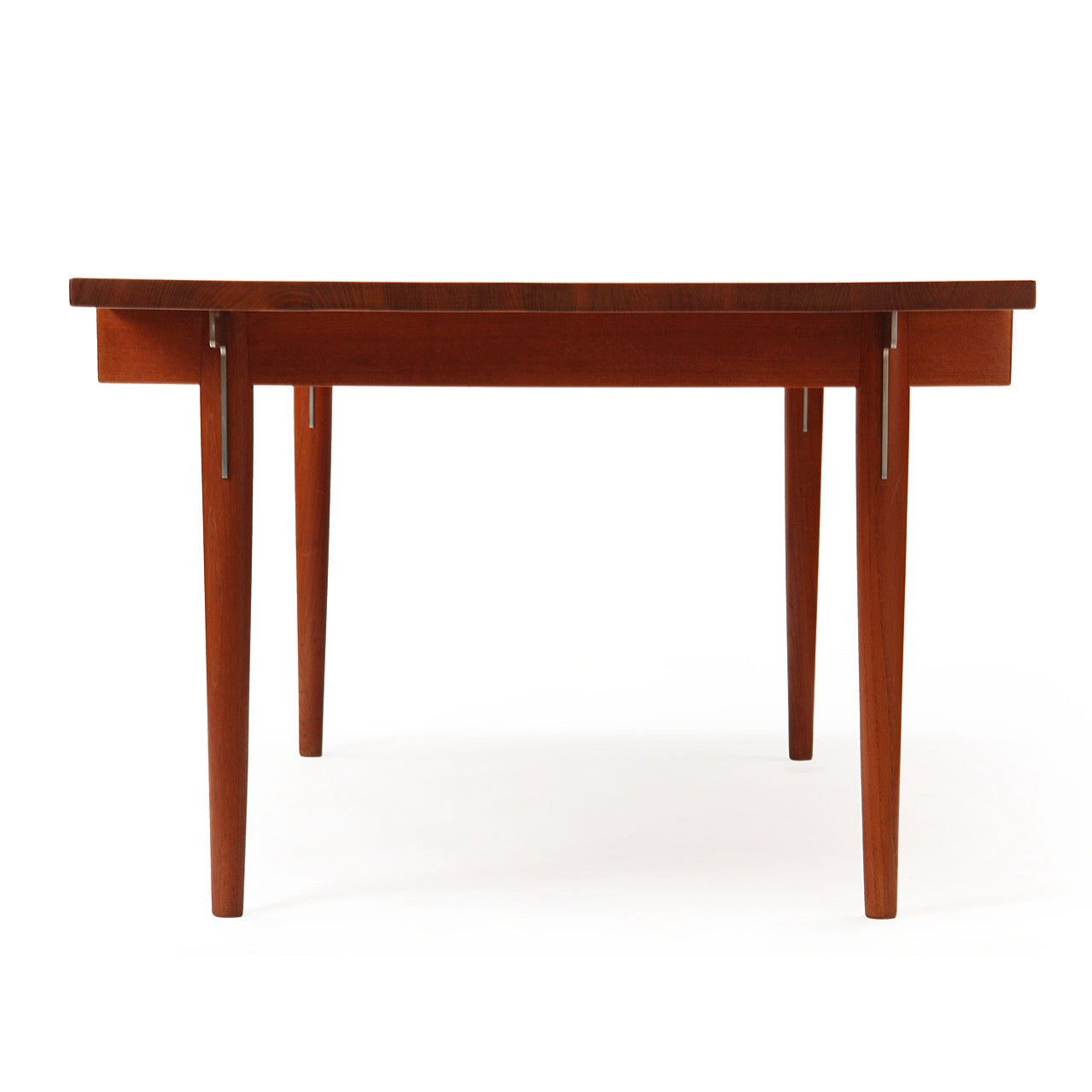 A rare solid teak minimalist desk or dining table. The legs are supported by stainless steel brackets mortised thru the tops to create lateral stability. One of the most spare table series designed by Wegner.