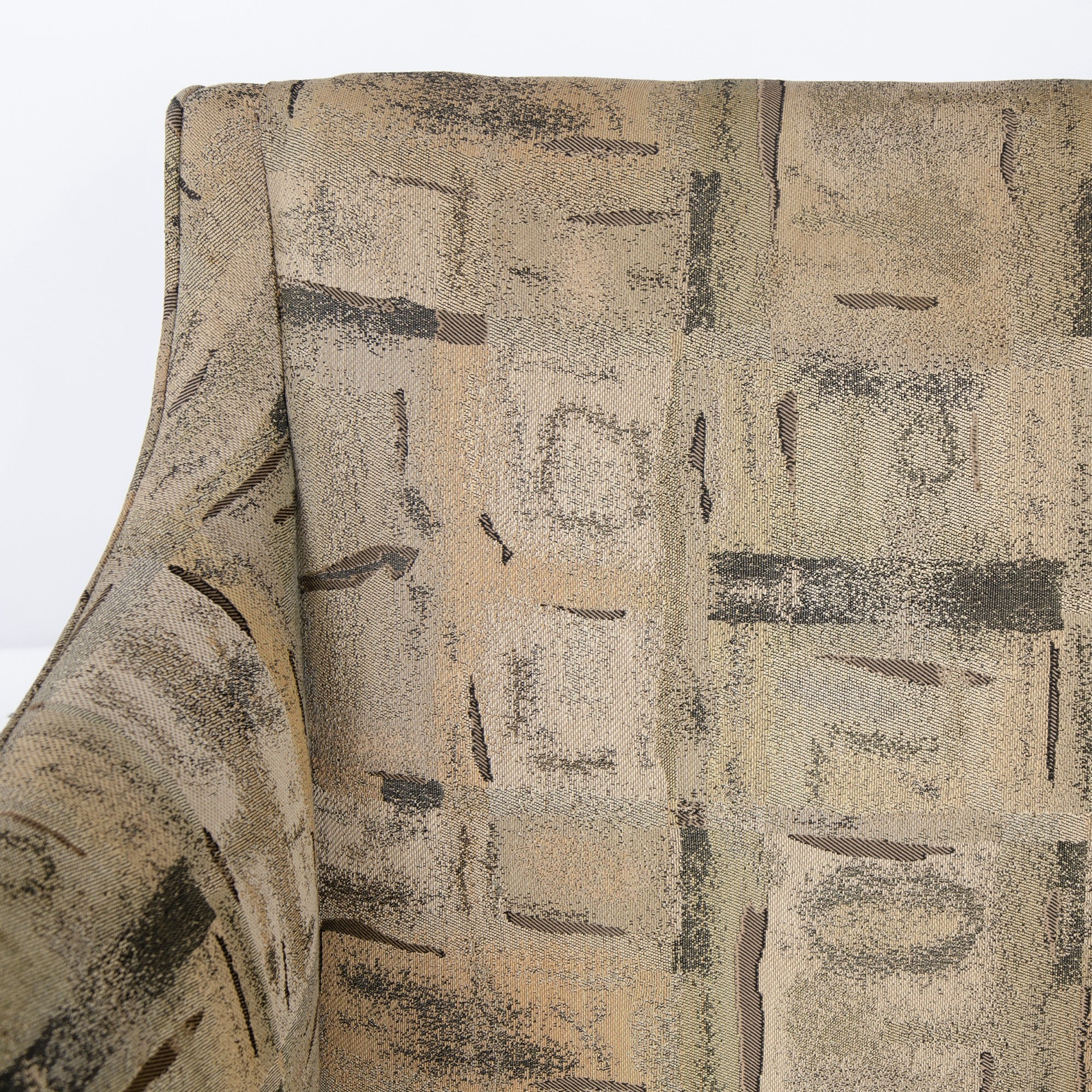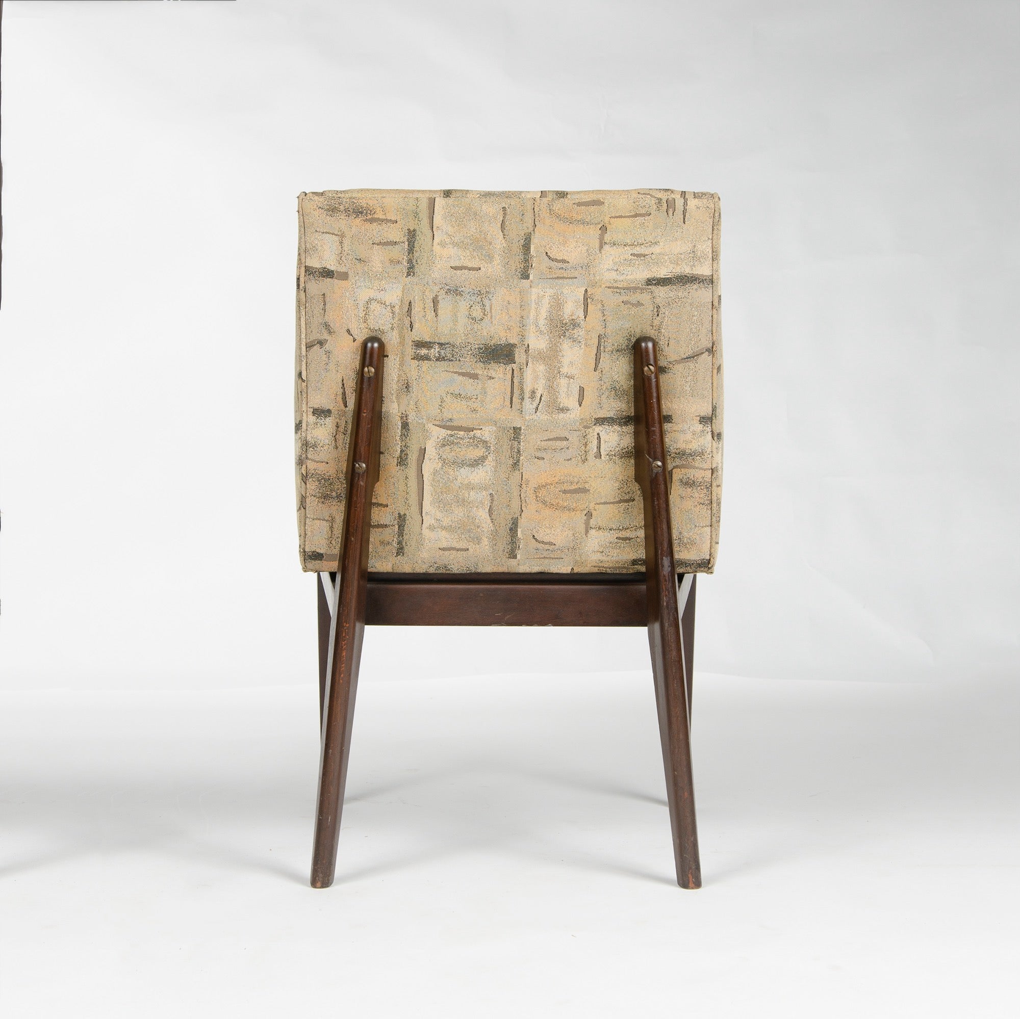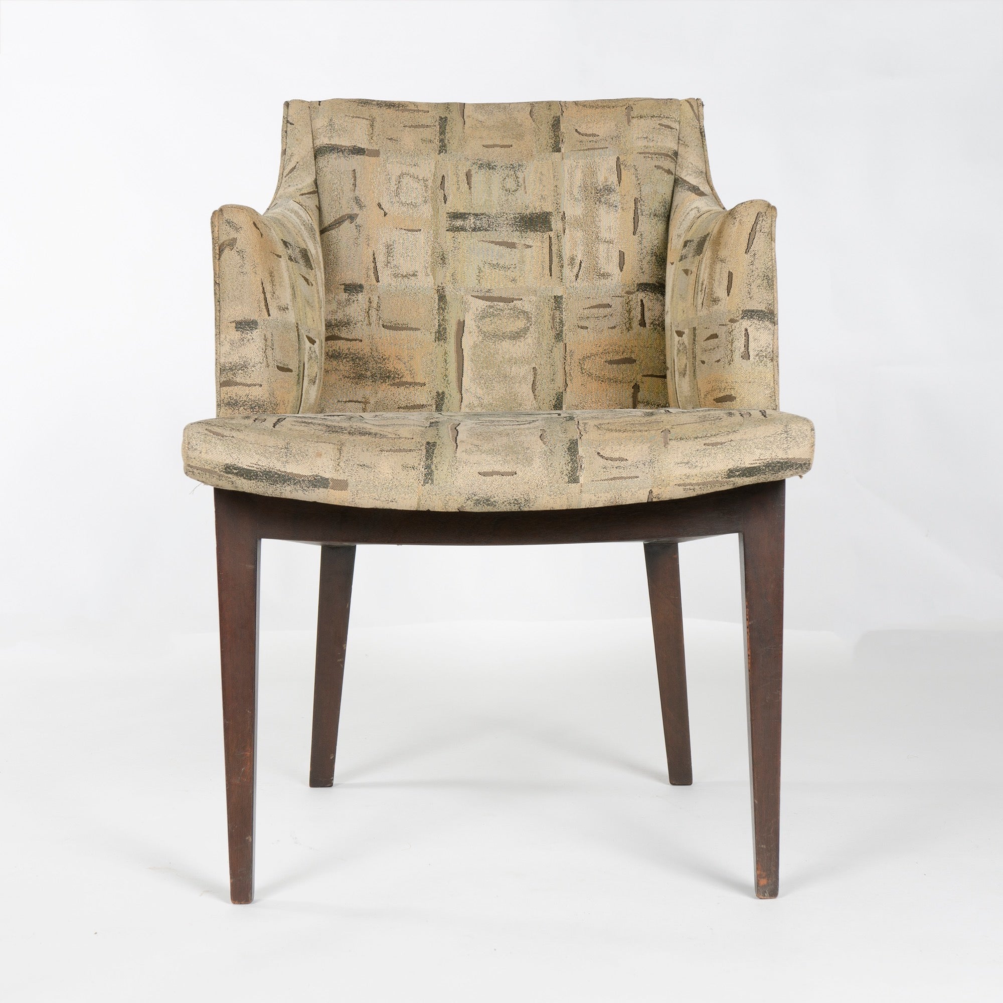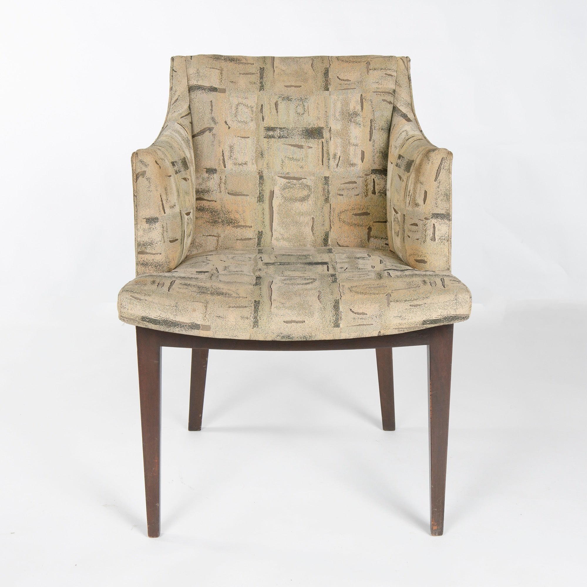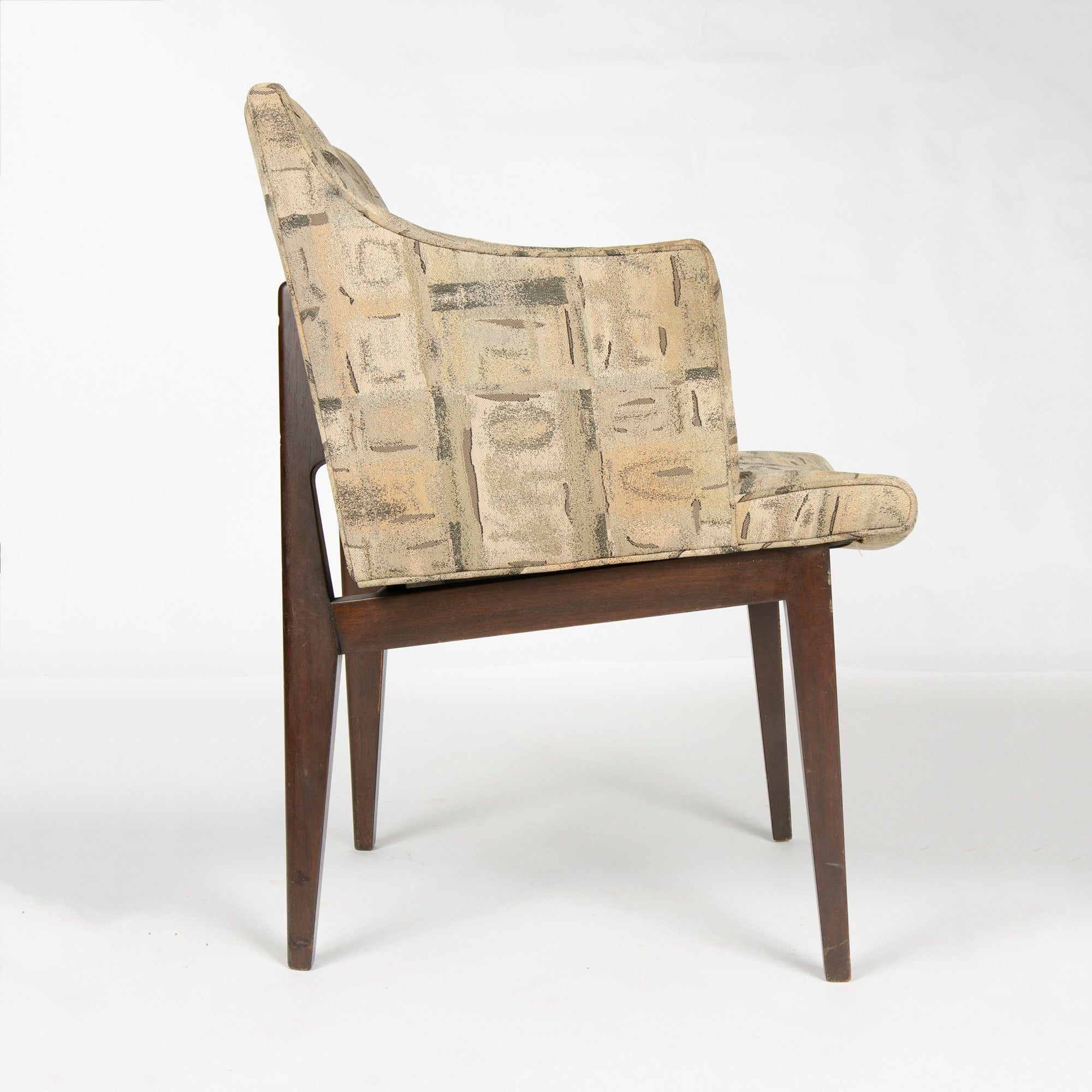 A model 5517 occasional arm chair with exposed mahogany frame supporting a fully upholstered seat, back rest and arms, covered in vintage upholstery. Designed in 1954 as a component of the Hemisphere Collection, introduced in 1955 at the Chicago Market.