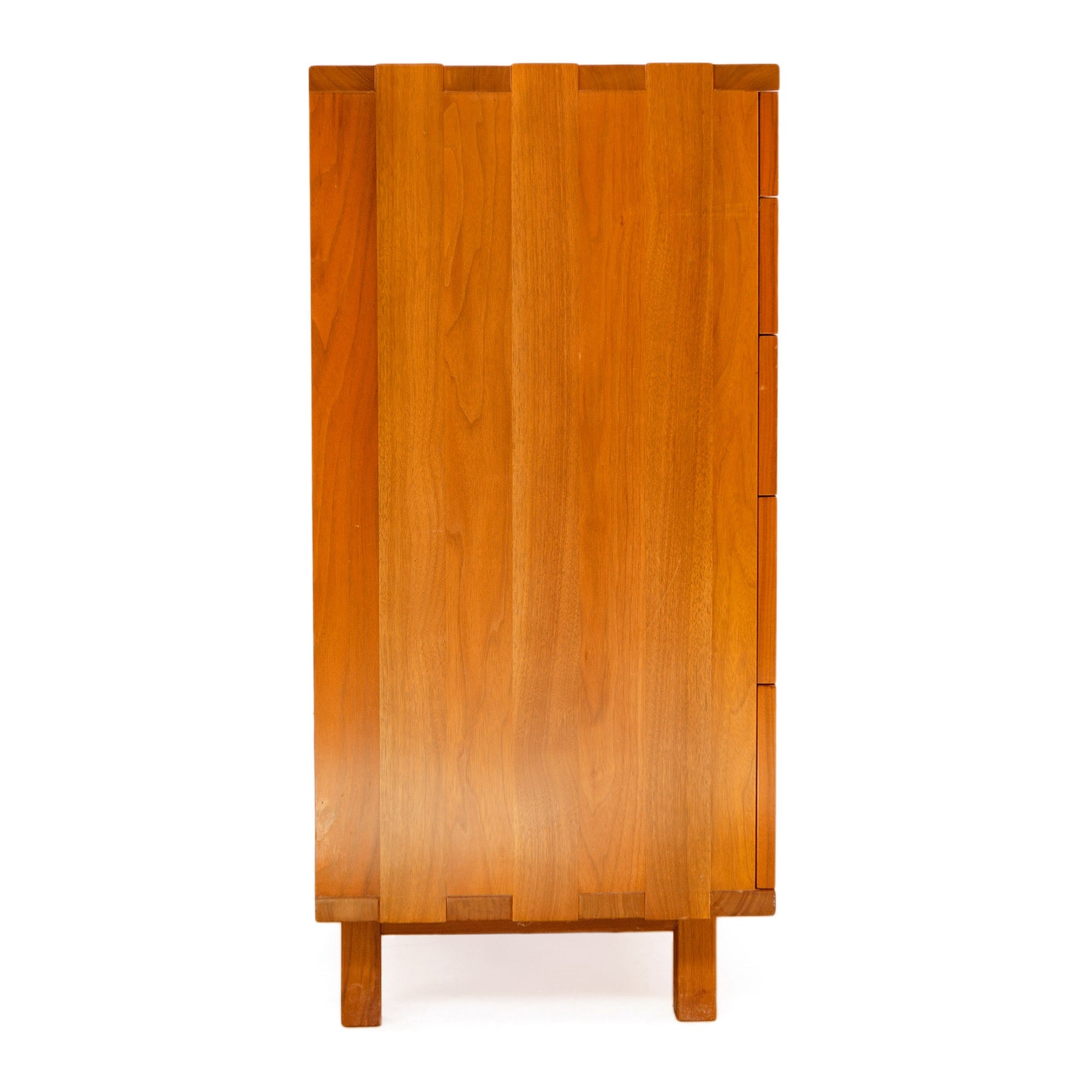 An asymmetrical dresser in solid walnut with exposed finger jointed joinery, having a shelved compartment accessed by bi-fold doors flanked by a bank of five drawers with exquisite brass hinged ring pulls inset with rosewood.