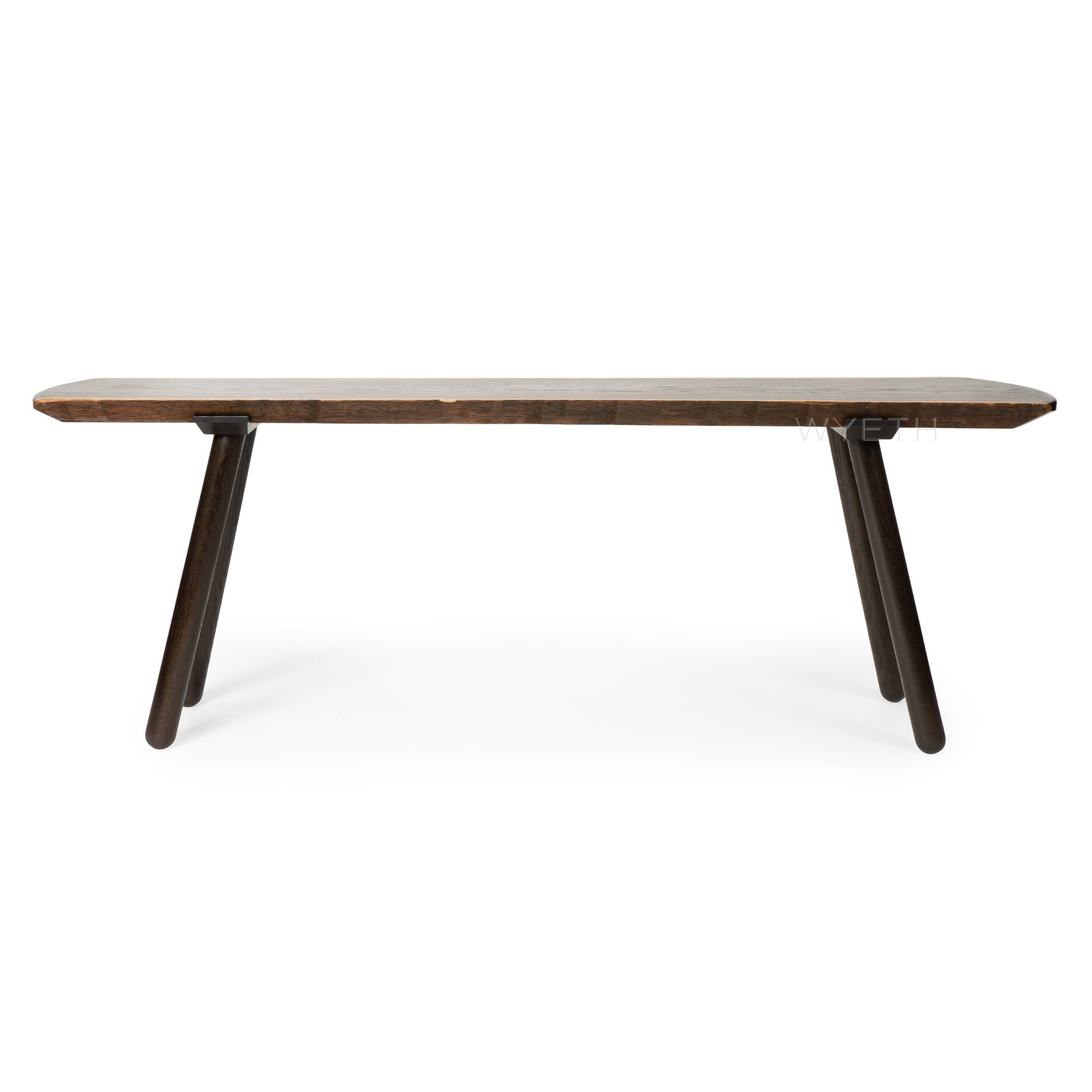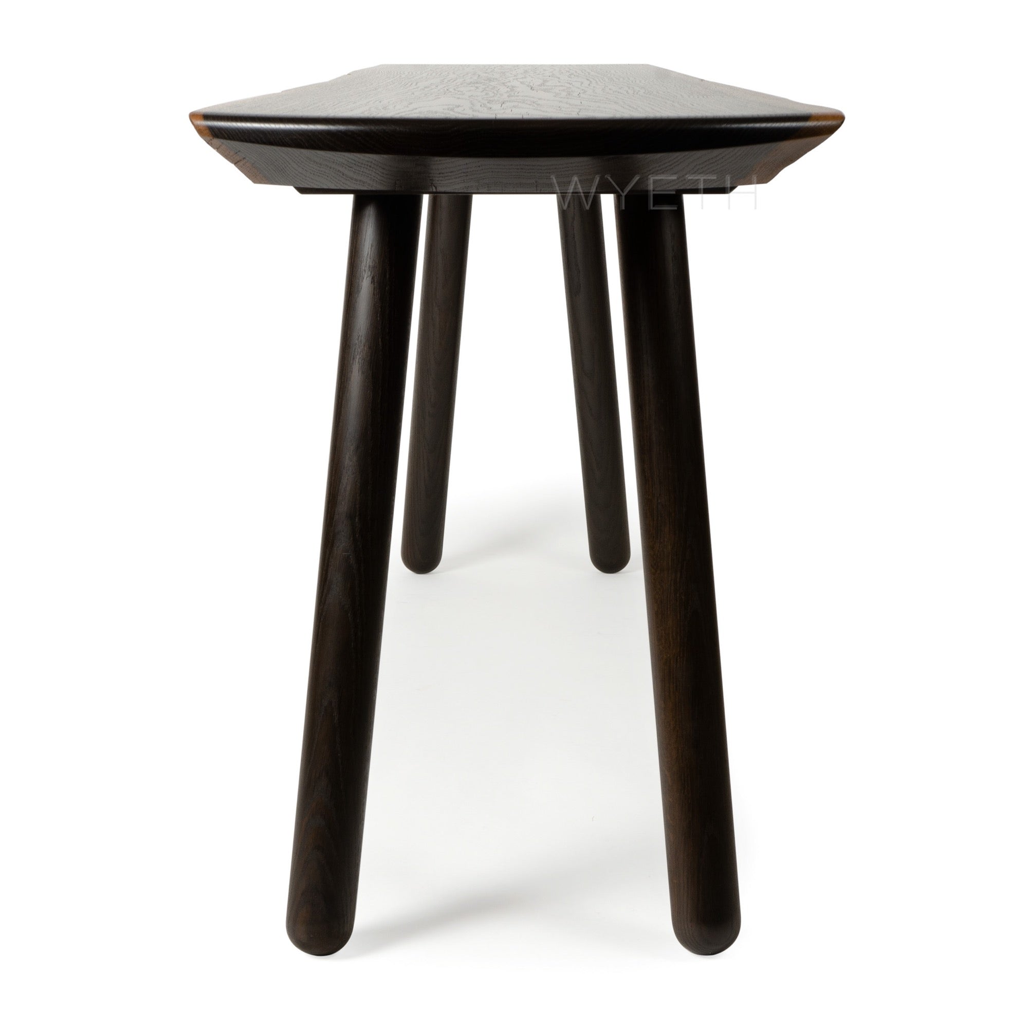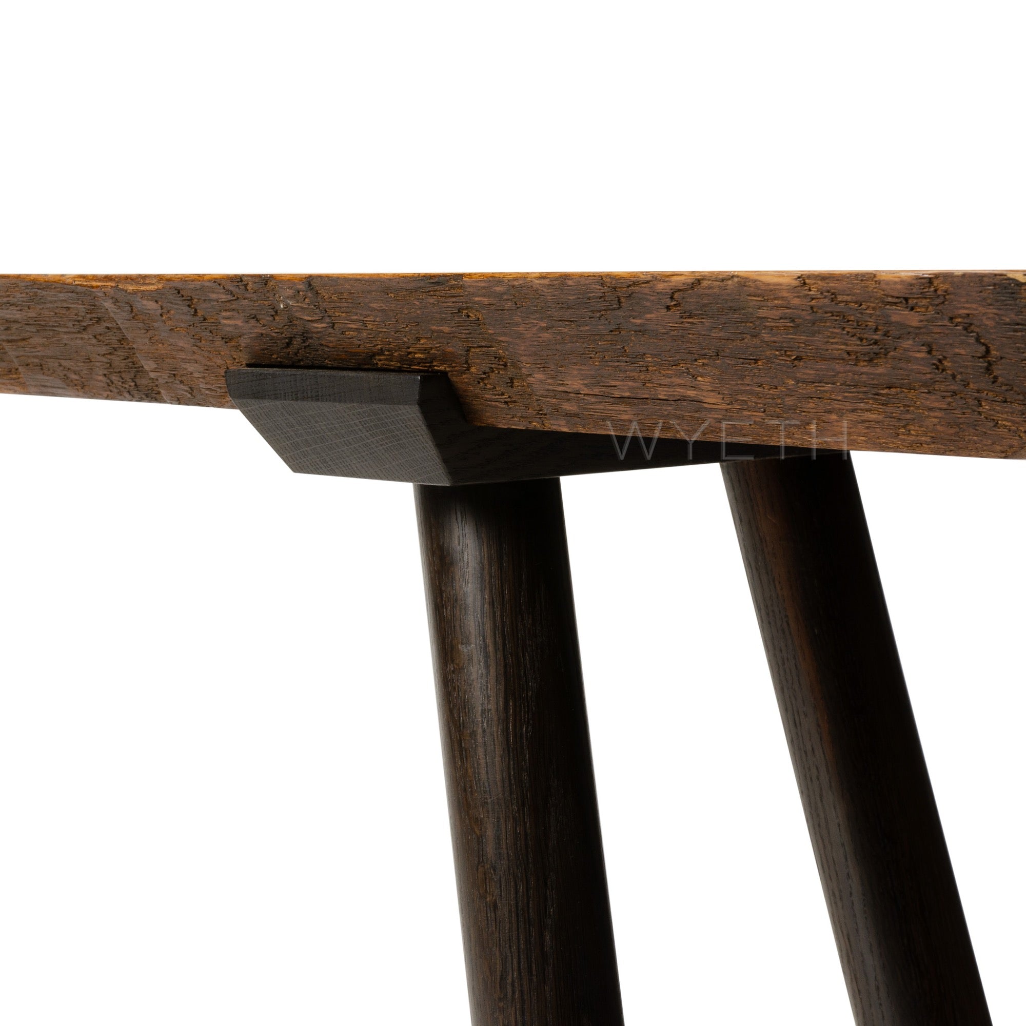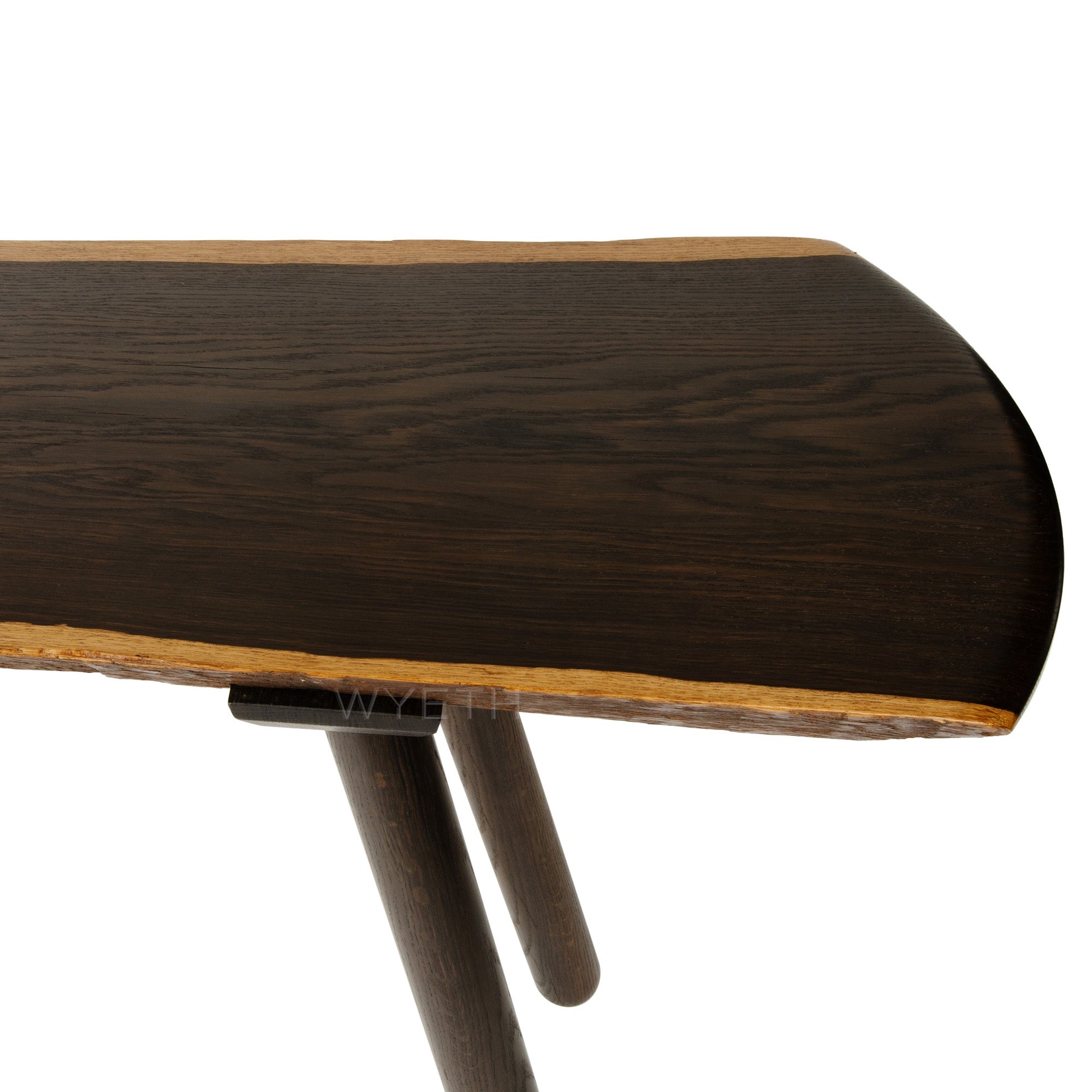 A handmade console table in fumed oak with natural edges innate in the wood and four (4) substantial turned legs that are mortised through the top.