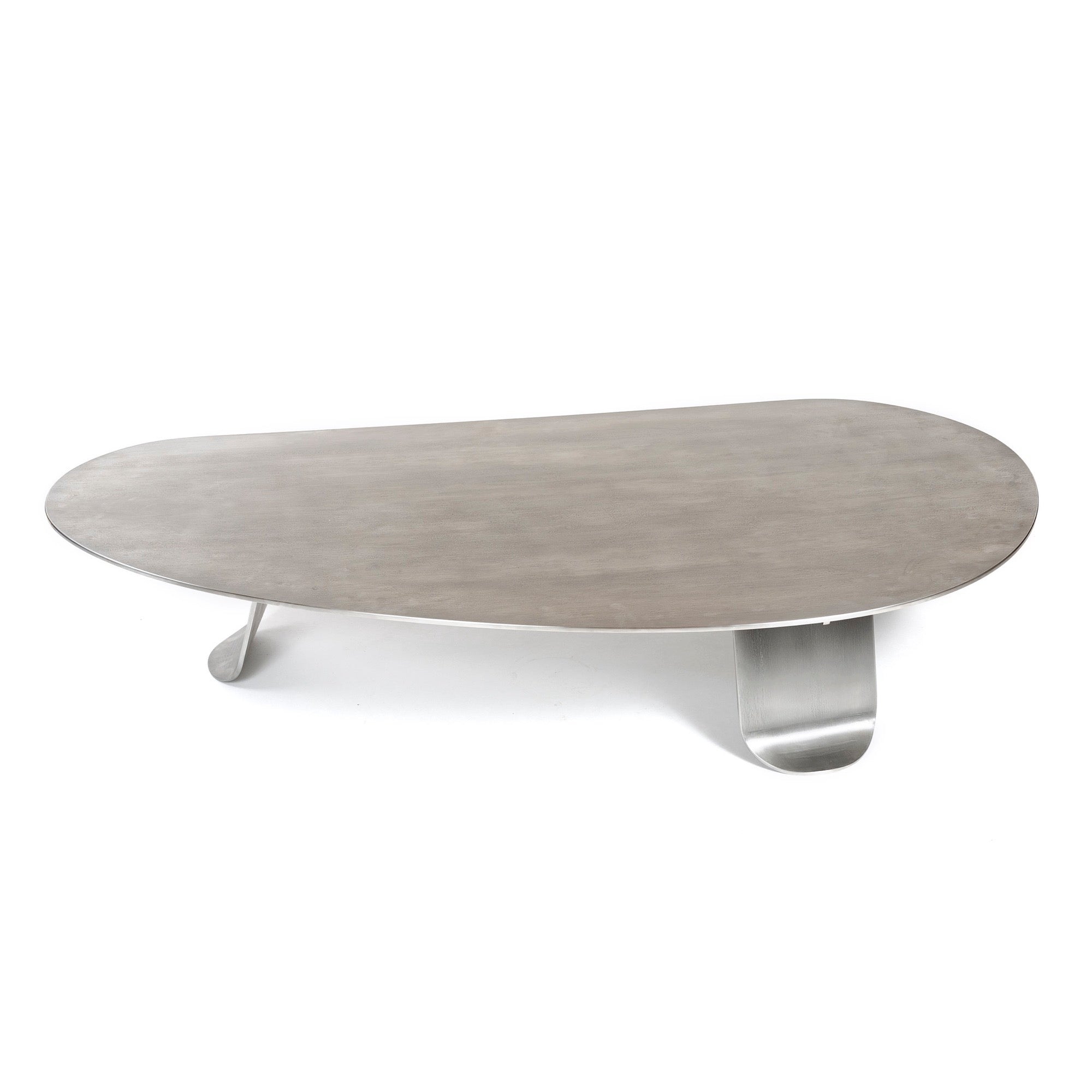 A low coffee / cocktail table of thick, plate steel with natural grain. The expansive, organically shaped top is set upon three wide, thick plate steel legs each having gradually tapering sides terminating in softened corners and subtle, outwardly turned ends.