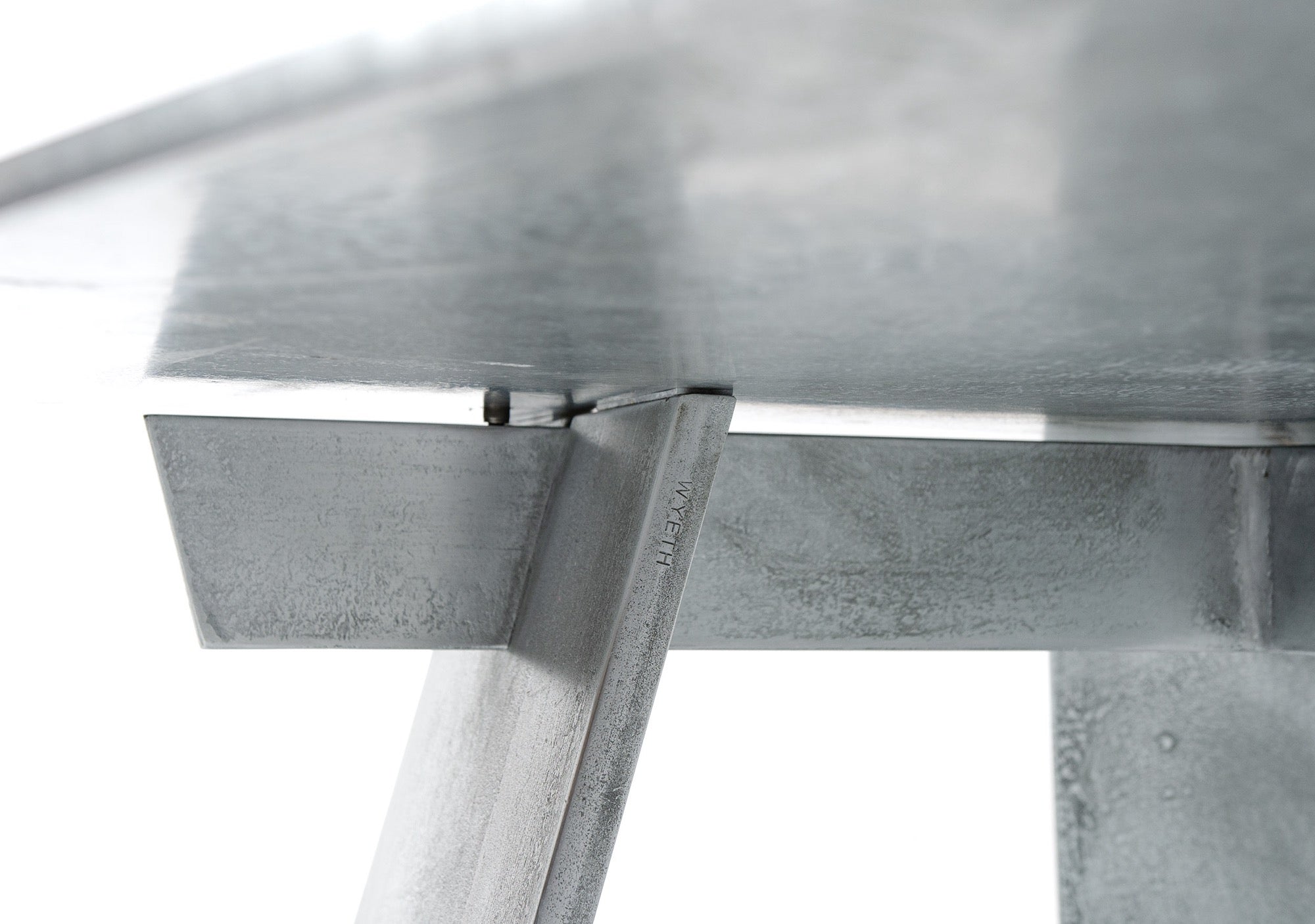A low table of thick, plate steel treated with a low sheen, hot zinc finish. The expansive, organically shaped top is set upon three wide, thick plate steel legs each having gradually tapering sides terminating in softened corners and subtle, outwardly turned ends.