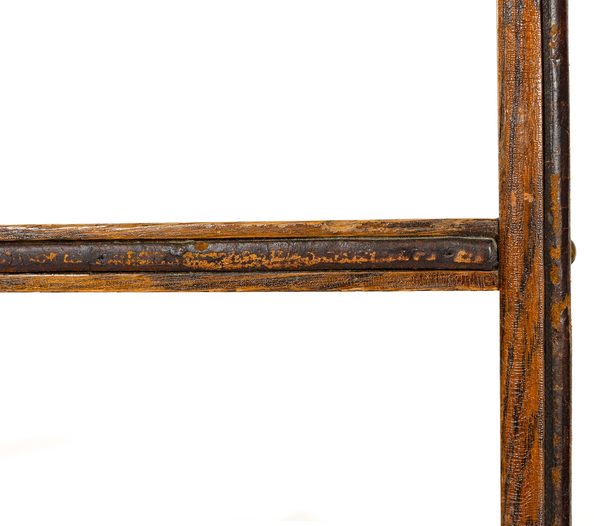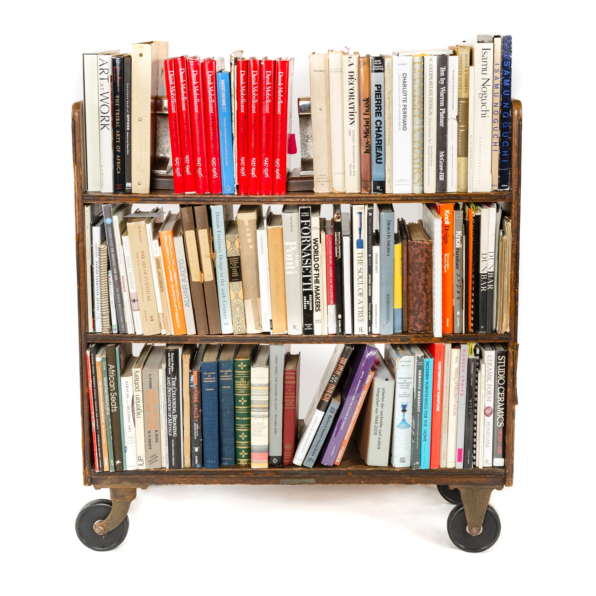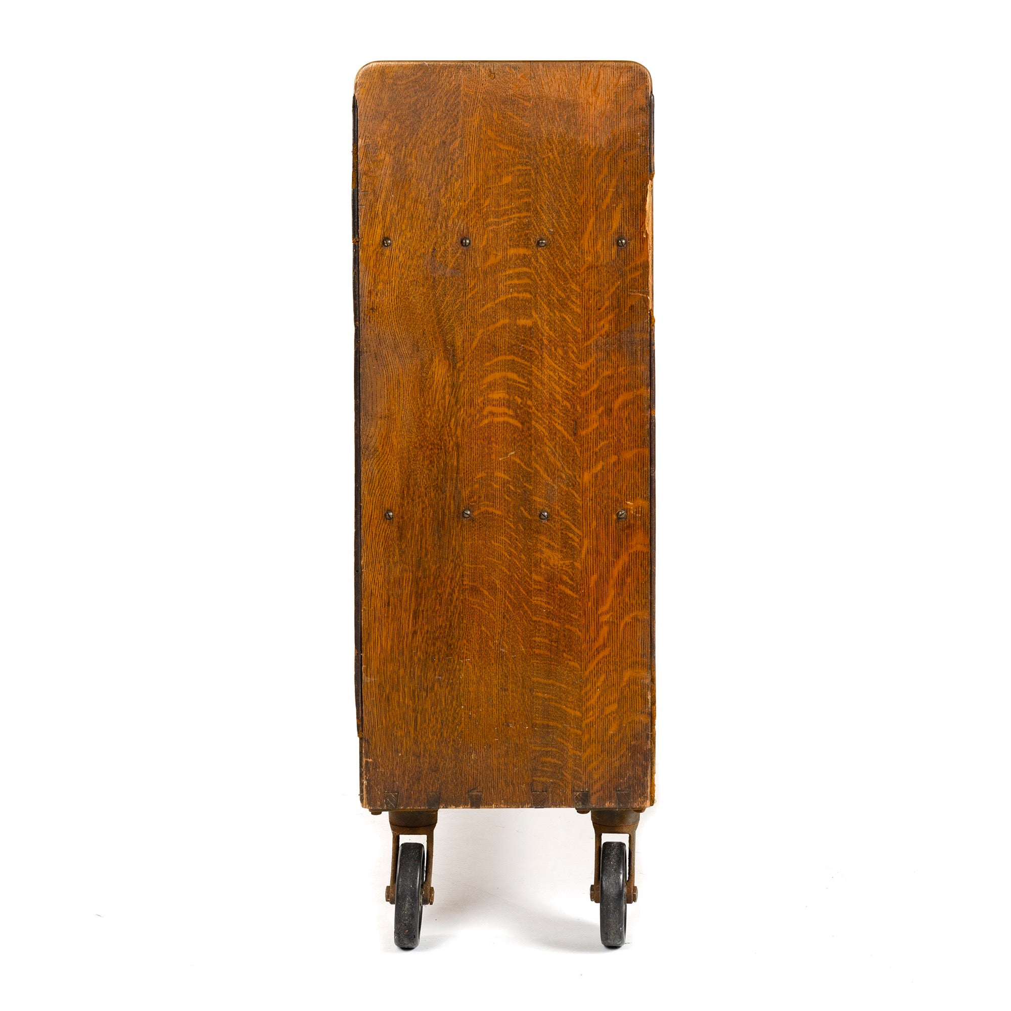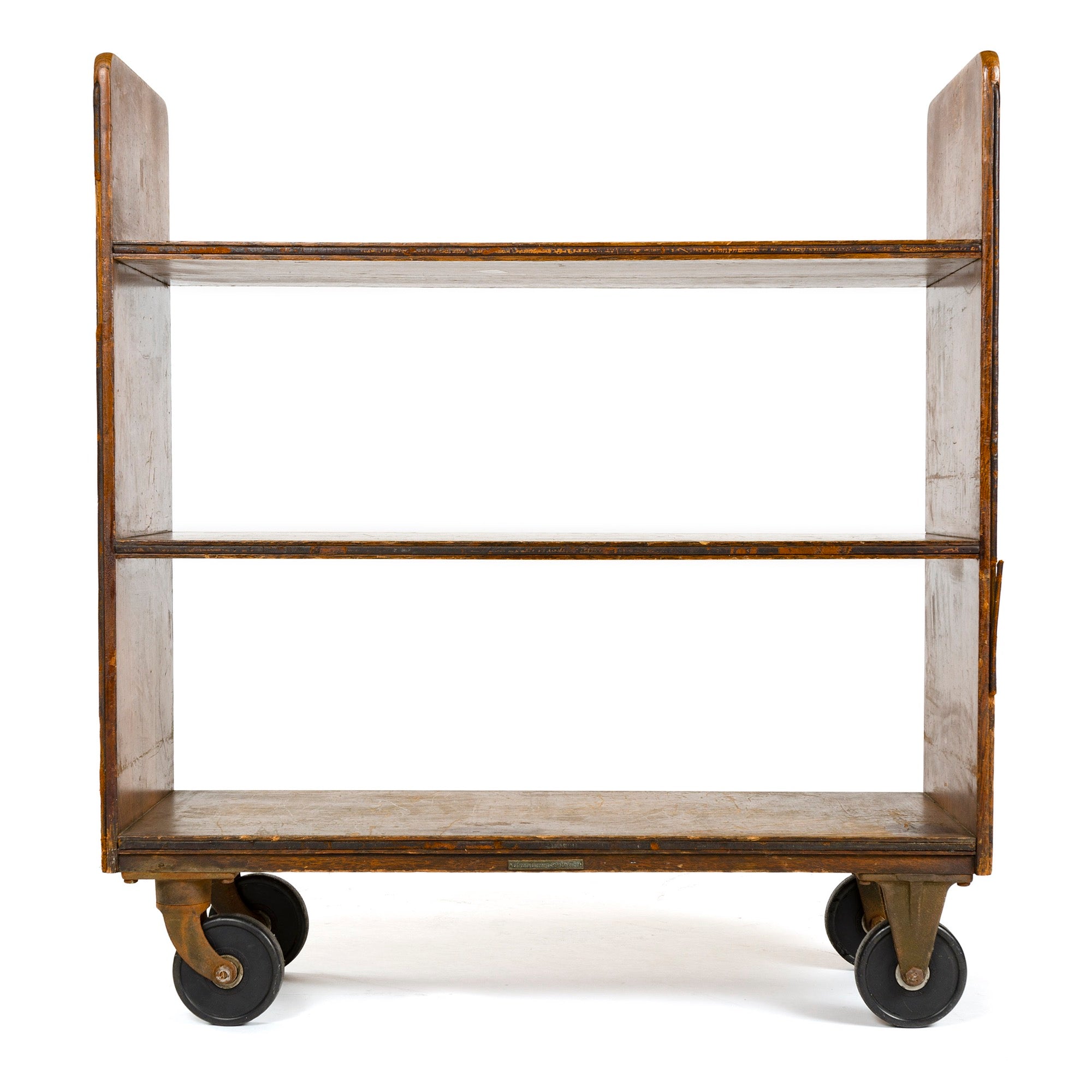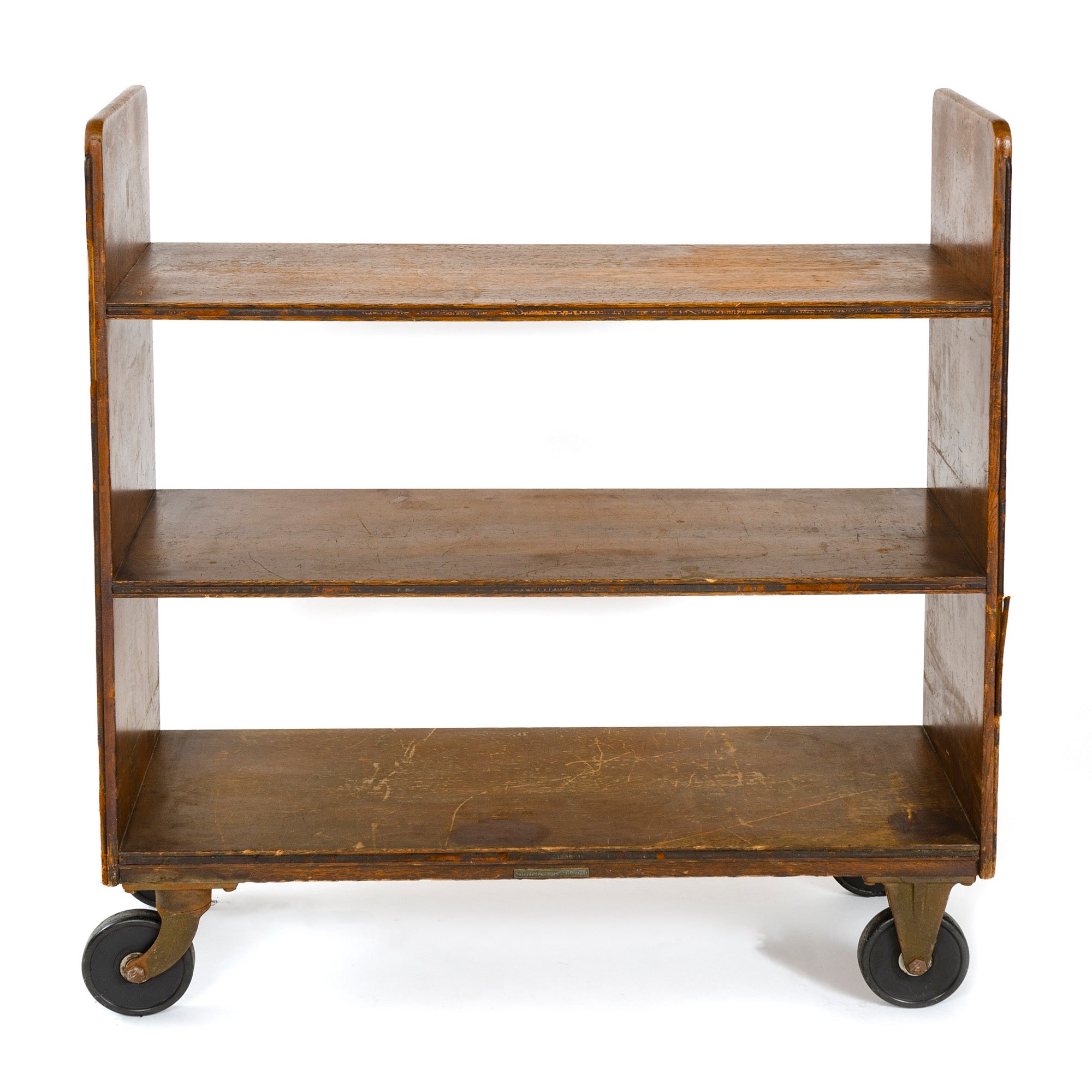 A Mission, utilitarian style mobile shelving unit manufactured by the ‘Library Bureau Solemakers’ company that pioneered and specialized in furnishings specifically designed for use in public and institutional libraries during the first three quarters of the Twentieth Century. This book trolly, aka re-stacking cart, was likely made 1910-1930 although their product offerings were not subject to the dictates of passing styles instead opting for sturdy, solidly crafted desks, chairs, file cabinets, and the like to fill the operational needs of a library thus their broadly Mission, utilitarian style was dictated by function and durability with models often produced for decades without substantial change making specific dates of manufacture challenging. This vintage example, like most of Library Bureau’s output, is made of thick, solid white quartered oak. Its three oak shelves are affixed by exposed screws through the sides set in to aligned and pre-drilled holes allowing for easy re-tightening if needed after prolonged use. Leather strips set in to carved out channels along its edges acts as bumpers. The structure of the trolly is set upon four 5’’ hard rubber castors attached to cast iron mounts, two of which swivel and the remaining two have fixed positions. All three shelves are 14’’ in depth while the two lower shelves allow for height clearance of 12’’ with the top shelf having side supports extending upward 8’’ without height restriction. The underside of the trolly has 7’’ of clearance. A brass maker’s tag is attached to one shelf edge.