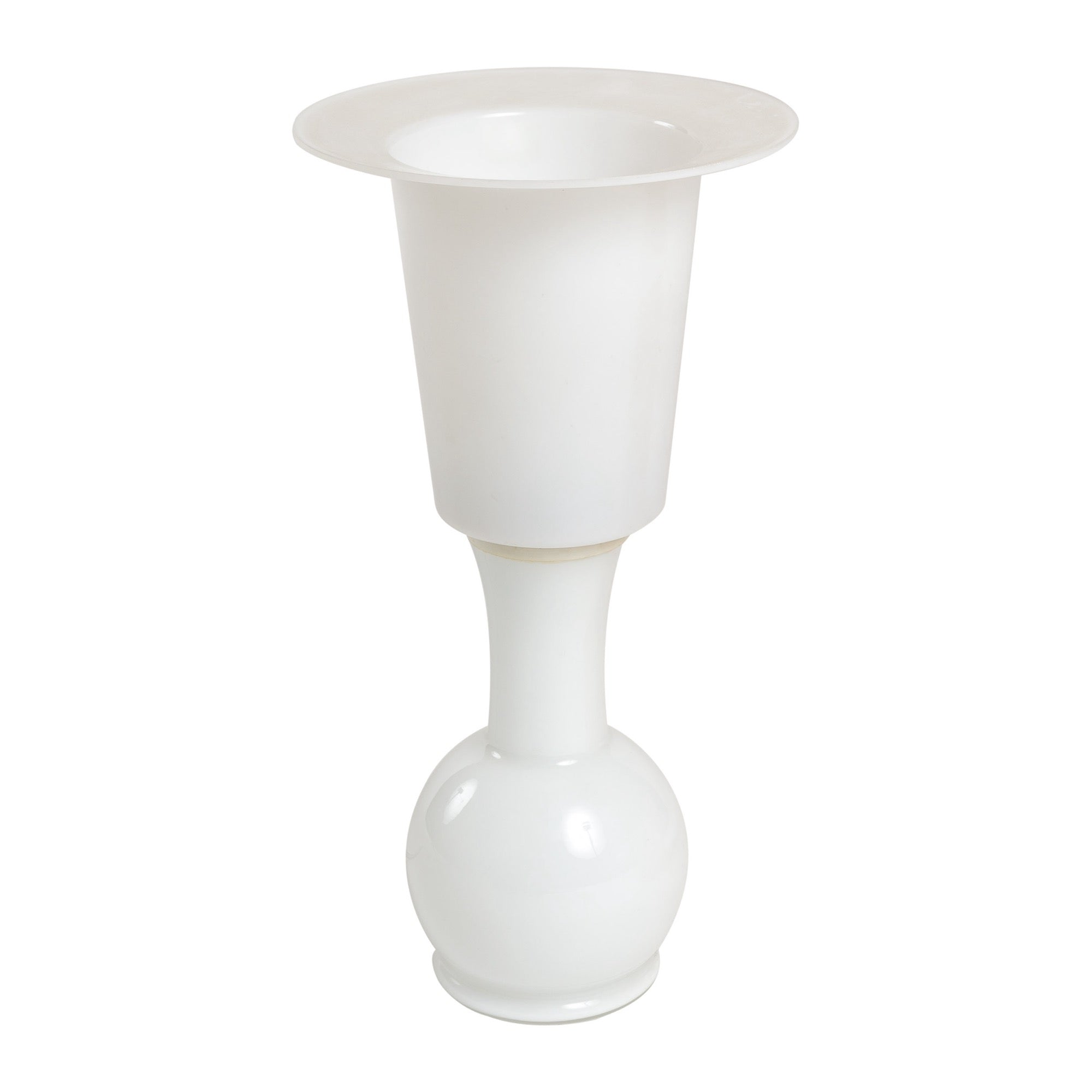 Bulbous glass table lamp of diminutive stature of opaque white glass beneath a white acrylic upper section which acts as both a diffuser for the light source as well as a holder for the shade which conceals it.